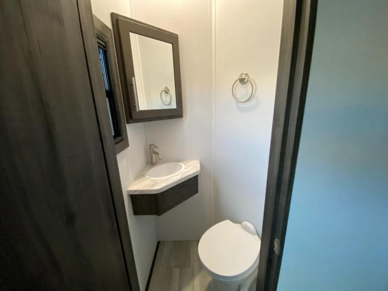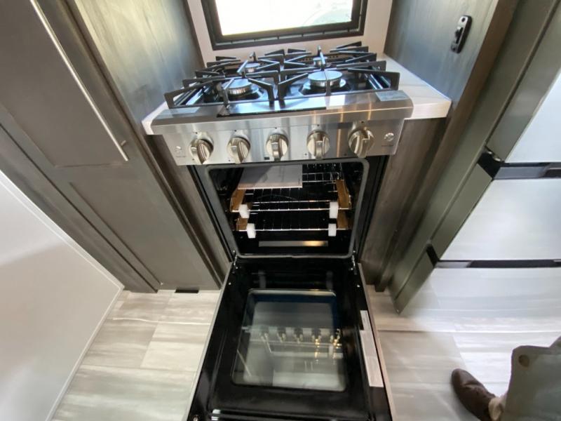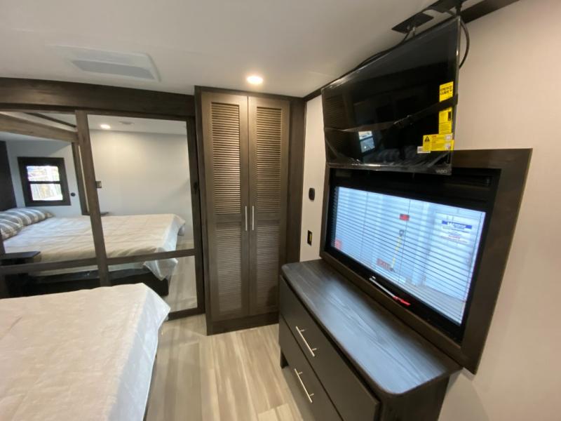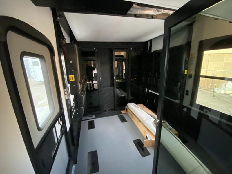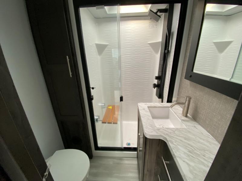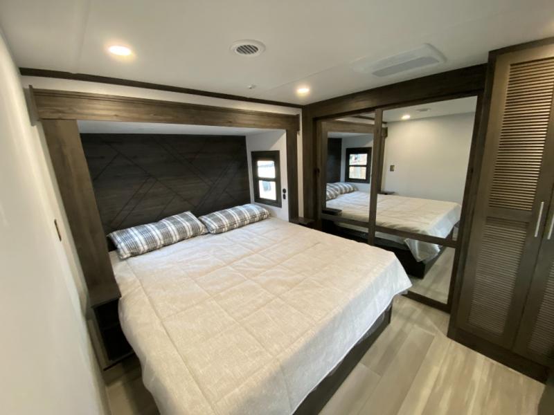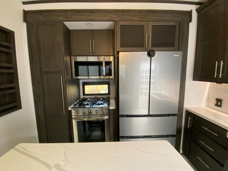 Don't leave your favorite off-road toys behind, simply load them up with the 8' MORryde powered ramp door into the 11' garage area of this toy hauler! The garage area isn't just for your toys, it's for eating, sleeping, and entertaining too with dual opposing sofas with a queen bed above them, a loft with a bunk mat, an LED TV, and even a half bathroom for your convenience. The residential four person sofa slide comes with heat, massage, and 110V/USB ports for an ultimate relaxing evening across from the entertainment center with pantries on either side to store your snacks. The kitchen island table has swing-out stools for you to enjoy a cup of coffee at in the mornings and the dual entry bathroom has a residential shower with a seat to freshen up. It even leads directly into the front private bedroom which has a Fuzion king bed slide across from a dresser with an LED TV and a front master closet with washer and dryer prep!
