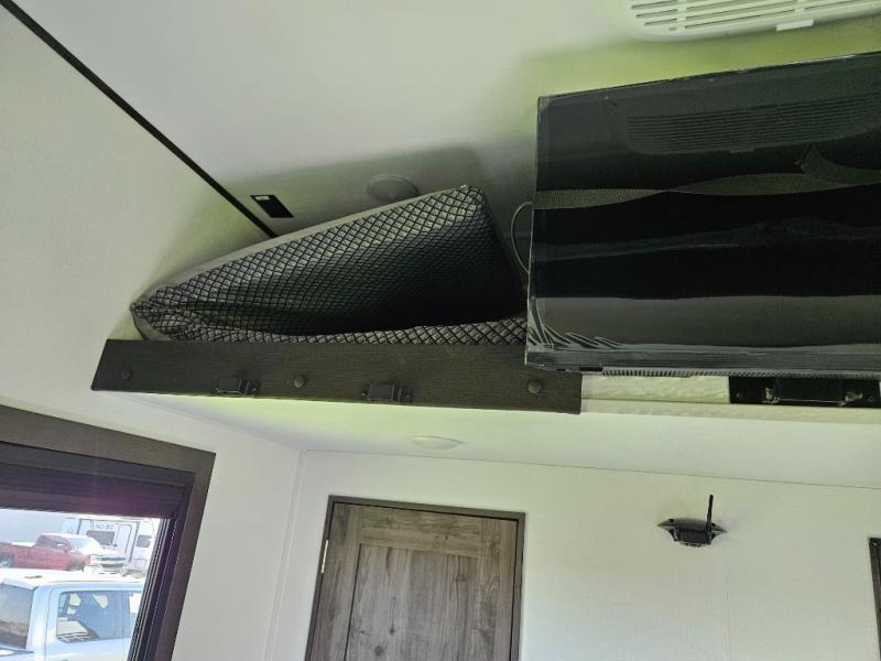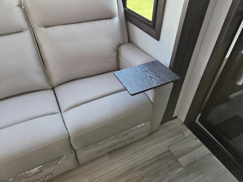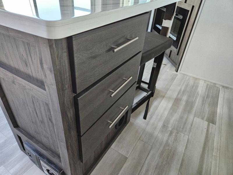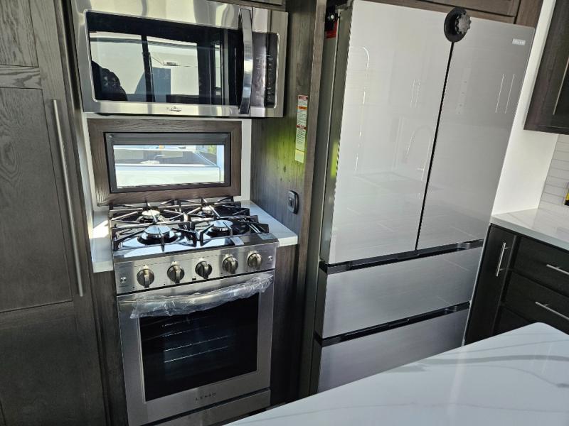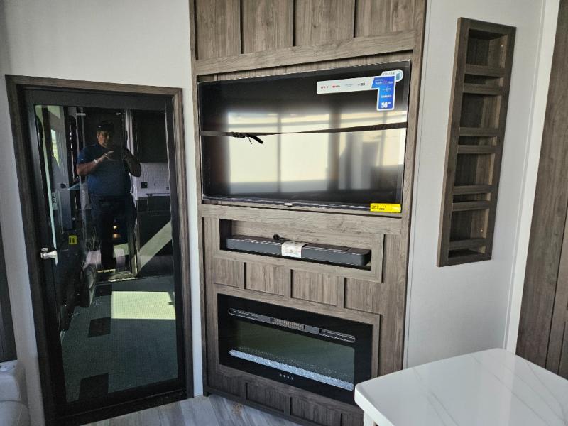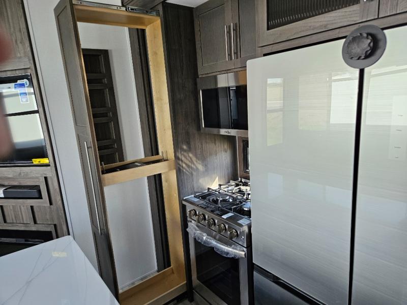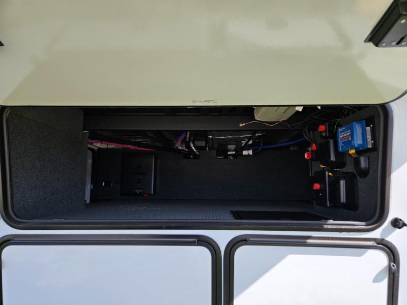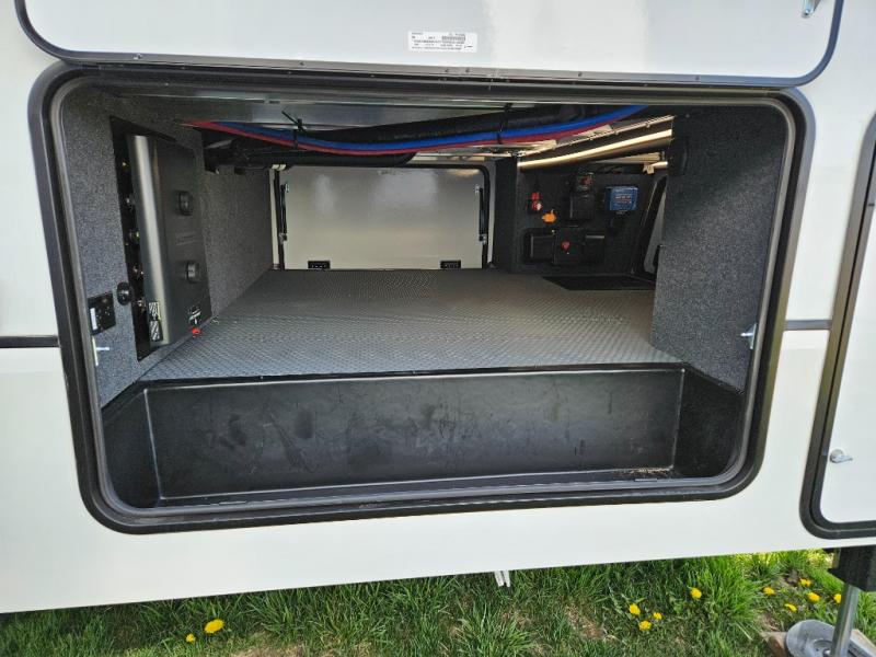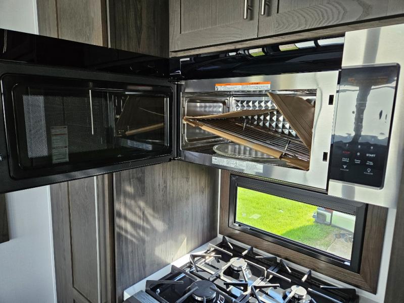 Don't leave your favorite off-road toys behind, simply load them up with the 8' MORryde powered ramp door into the 11' garage area of this toy hauler! The garage area isn't just for your toys, it's for eating, sleeping, and entertaining too with dual opposing sofas with a queen bed above them, a loft with a bunk mat, an LED TV, and even a half bathroom for your convenience. The residential four person sofa slide comes with heat, massage, and 110V/USB ports for an ultimate relaxing evening across from the entertainment center with pantries on either side to store your snacks. The kitchen island table has swing-out stools for you to enjoy a cup of coffee at in the mornings and the dual entry bathroom has a residential shower with a seat to freshen up. It even leads directly into the front private bedroom which has a Fuzion king bed slide across from a dresser with an LED TV and a front master closet with washer and dryer prep!