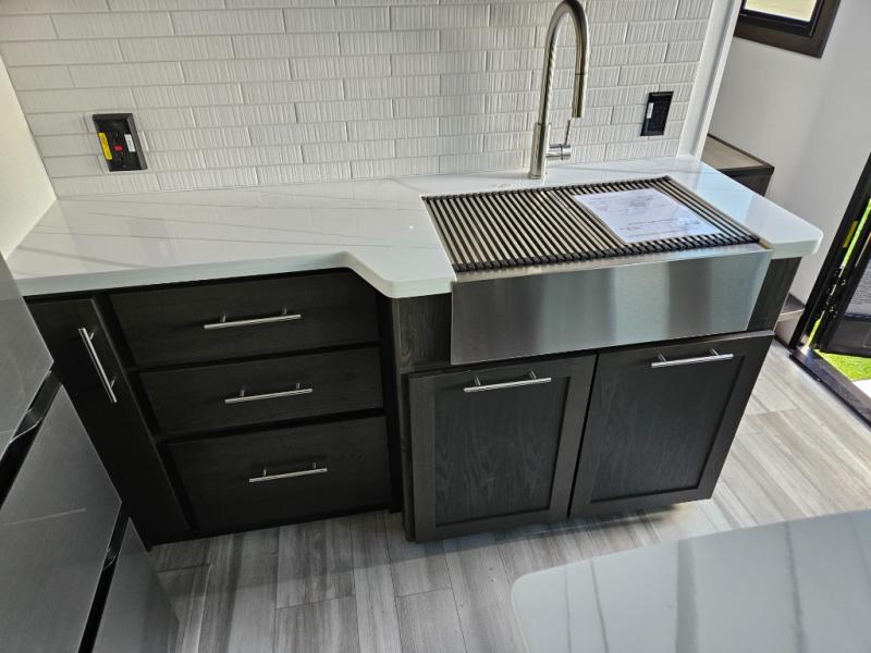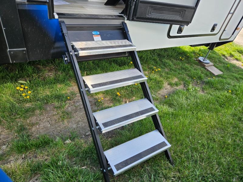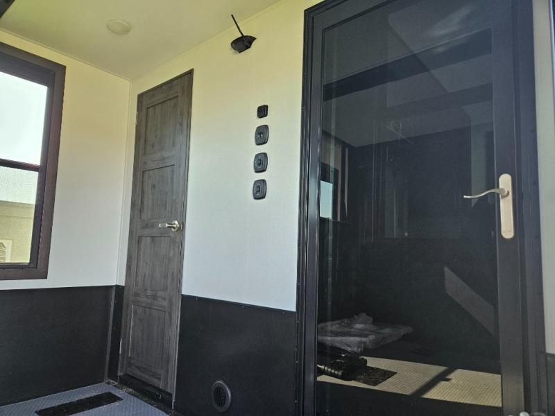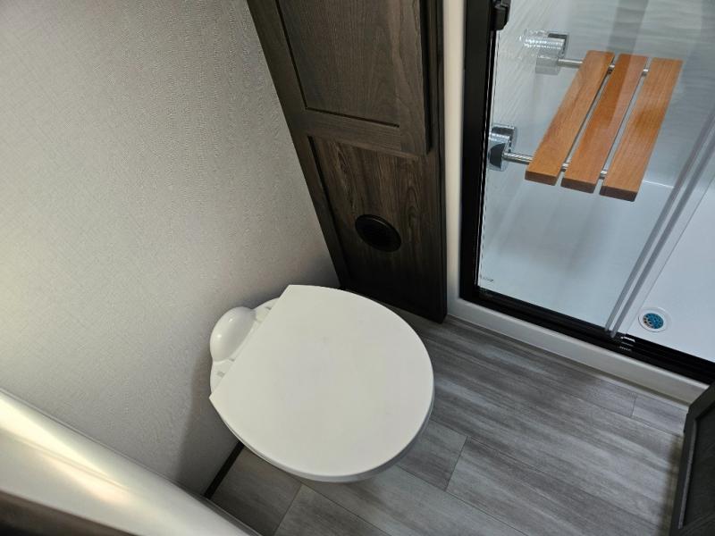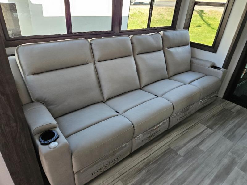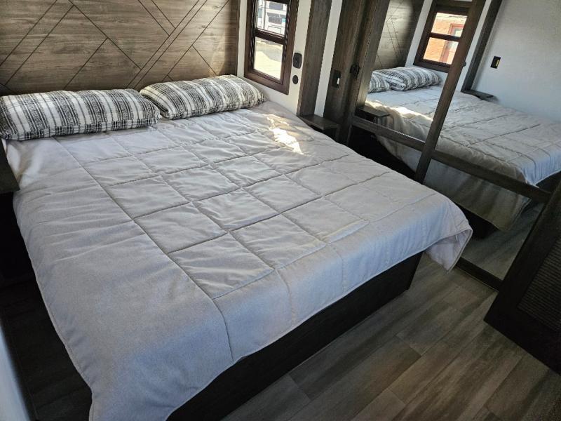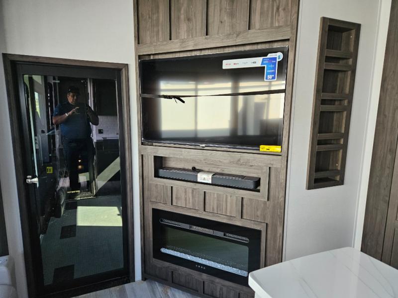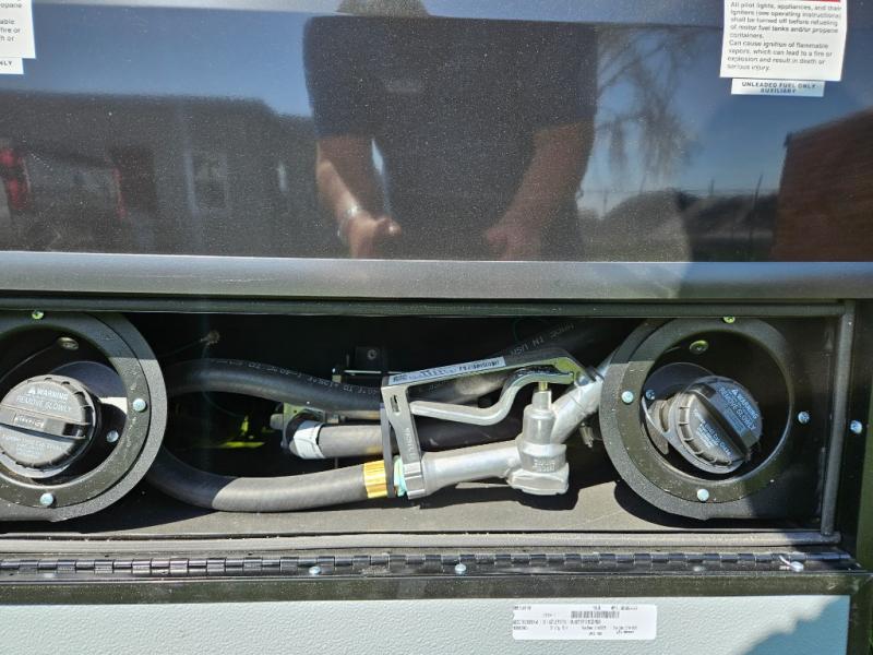 Don't leave your favorite off-road toys behind, simply load them up with the 8' MORryde powered ramp door into the 11' garage area of this toy hauler! The garage area isn't just for your toys, it's for eating, sleeping, and entertaining too with dual opposing sofas with a queen bed above them, a loft with a bunk mat, an LED TV, and even a half bathroom for your convenience. The residential four person sofa slide comes with heat, massage, and 110V/USB ports for an ultimate relaxing evening across from the entertainment center with pantries on either side to store your snacks. The kitchen island table has swing-out stools for you to enjoy a cup of coffee at in the mornings and the dual entry bathroom has a residential shower with a seat to freshen up. It even leads directly into the front private bedroom which has a Fuzion king bed slide across from a dresser with an LED TV and a front master closet with washer and dryer prep!