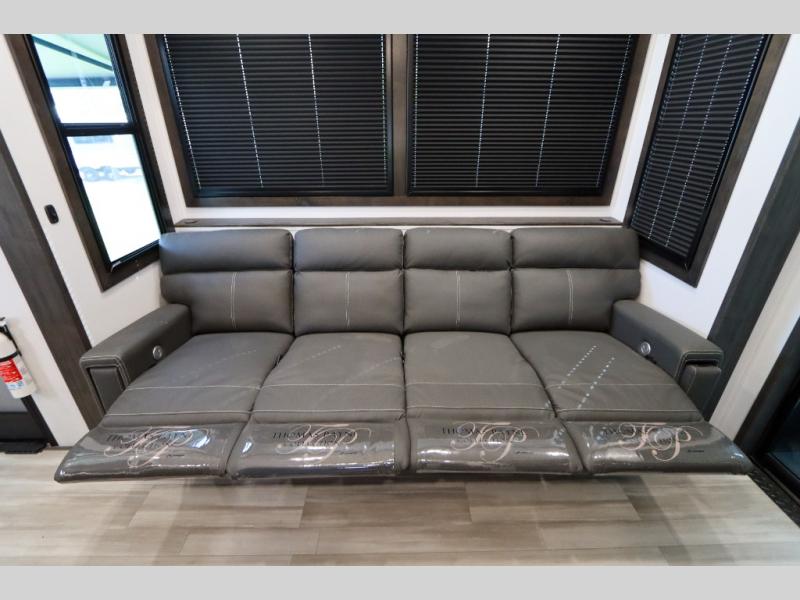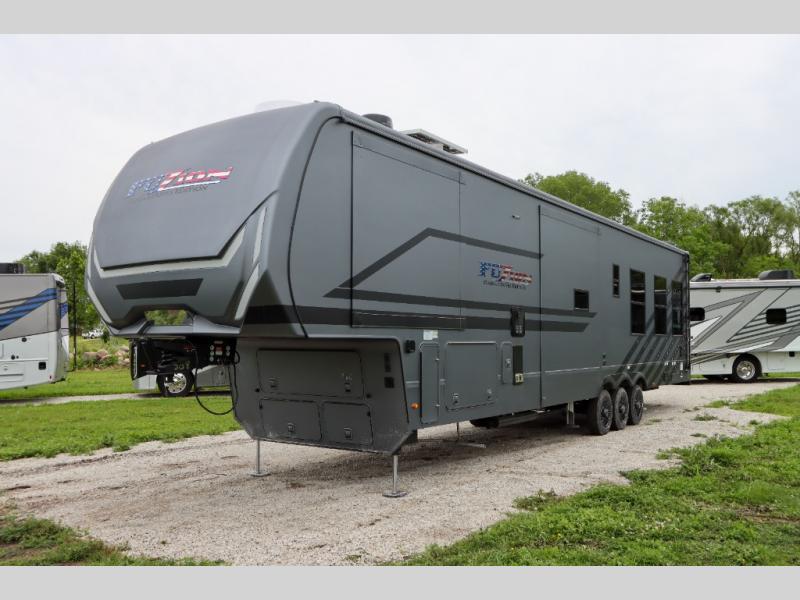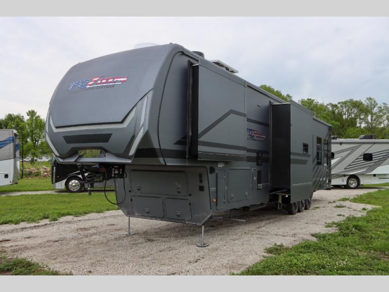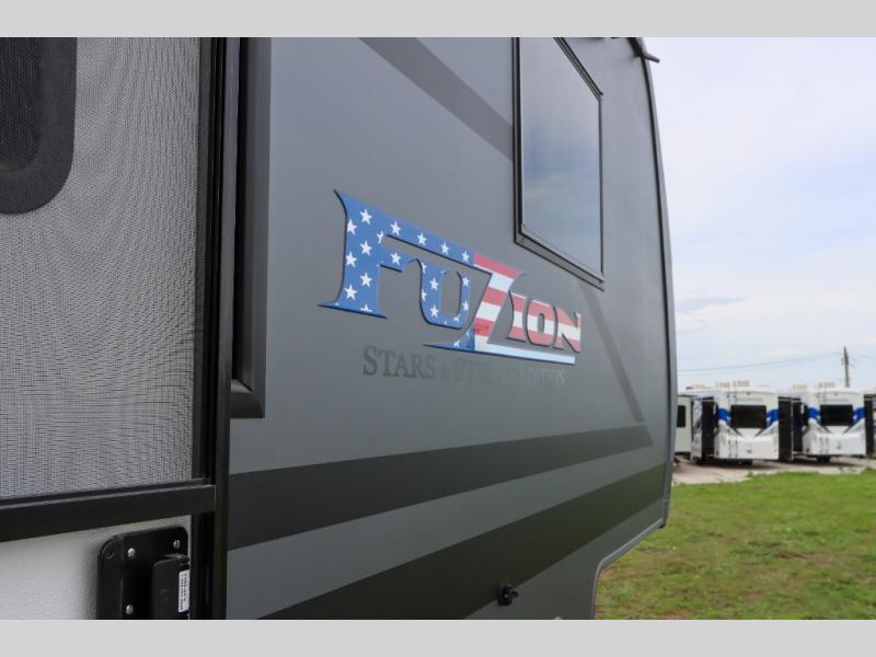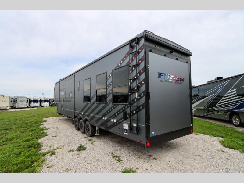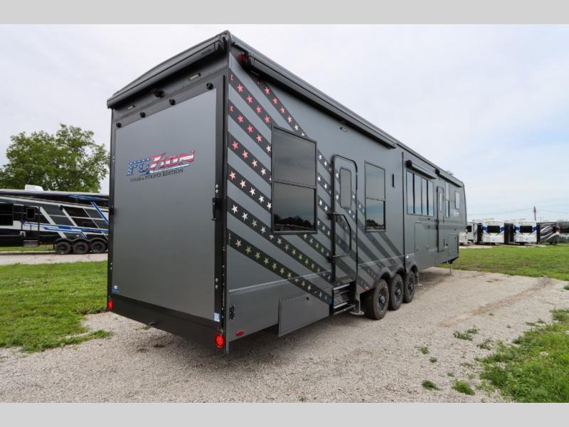 Get your adrenaline pumping with any one of these Keystone RV Fuzion fifth wheel toy haulers! The frame welded, Adjust-A-Trac tie-downs have 38 points to fully secure your toys as you travel, and the extended garage lengths have outside storage so you can haul bigger toys. A fully enclosed fuel pump station is integrated with the iN-Command Generation 3 control system with Global Connect. And the exclusive Omni-Chill technology offers high-efficiency air conditioning and maximum cooling. The interior provides fiberglass backed linoleum flooring, extra-tall slide height, solid wood cabinet and drawer frames, and extra tall ceilings with crown molding to mention a few luxuries. Outside, you'll find three Girard cassette awnings, 4k framed tinted safety glass windows, a Titan hydraulic leveling system, and many more conveniences!
