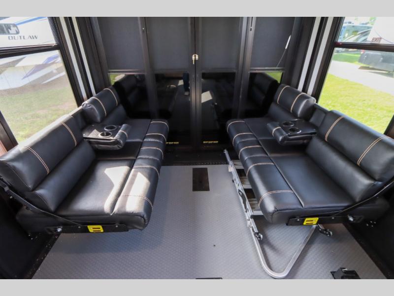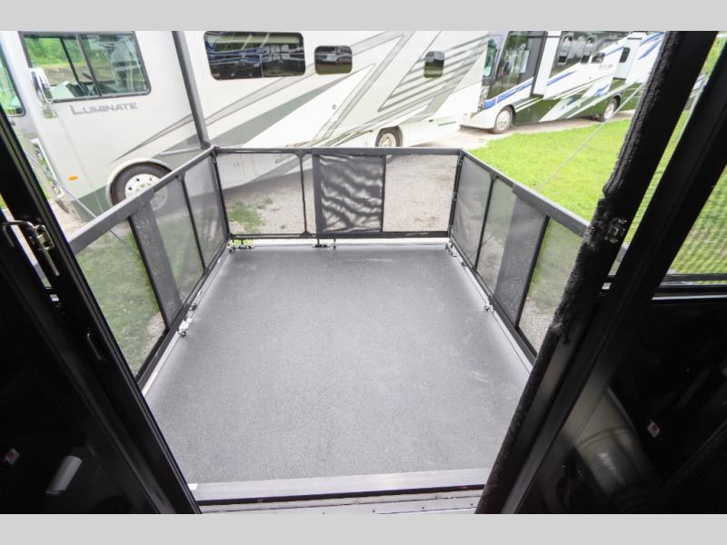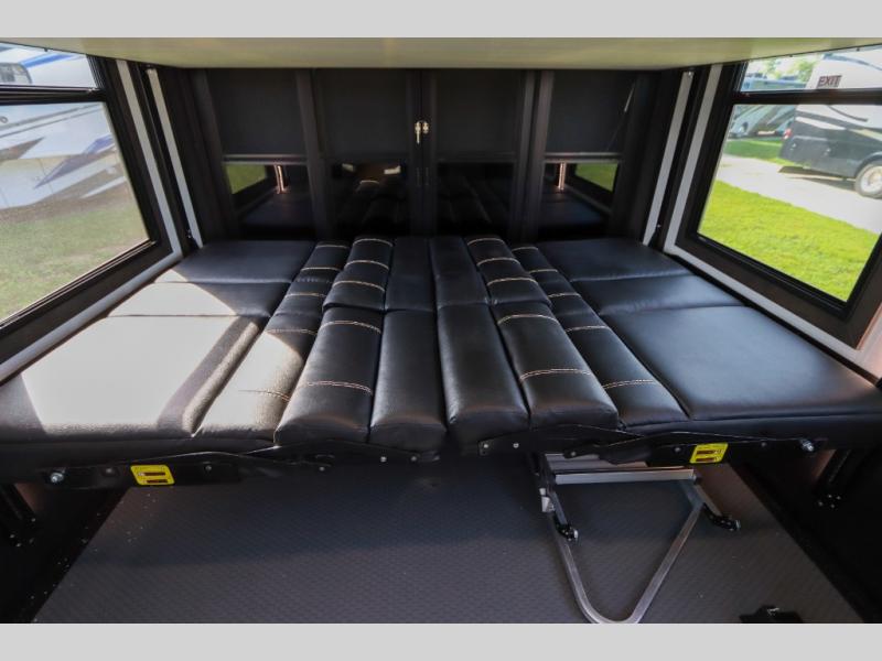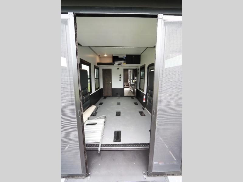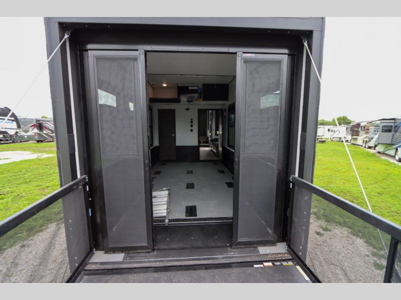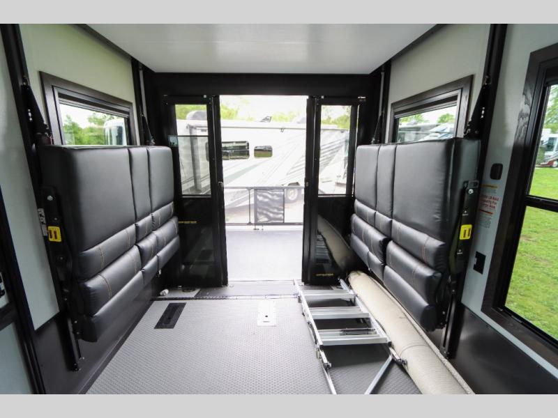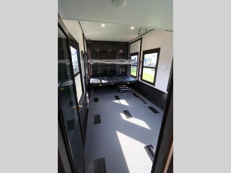You will have plenty of room to store your off-road toys with a 15' garage area that comes with an Adjust-A-Track system! Once you unload your toys with the 8' MORryde zero gravity ramp door, you can set up the dual opposing sofas with a top queen bed above, the LED TV, and the loft with a bunk mat, plus there is a half bathroom and one of the dual entrance doors to the unit. The chef will have everything they need to prepare their best home cooked meals and others can sit at the center table with swing-out stools to socialize with them while they prepare it. Gather together on the residential four person sofa slide for movie night with the entertainment center which has a fireplace for an even cozier evening. The dual entry bathroom makes it easy for everyone to freshen up in, especially those staying in the front private bedroom which has a front master closet with washer and dryer prep for clean clothes throughout your trip and Fuzion king bed slide!