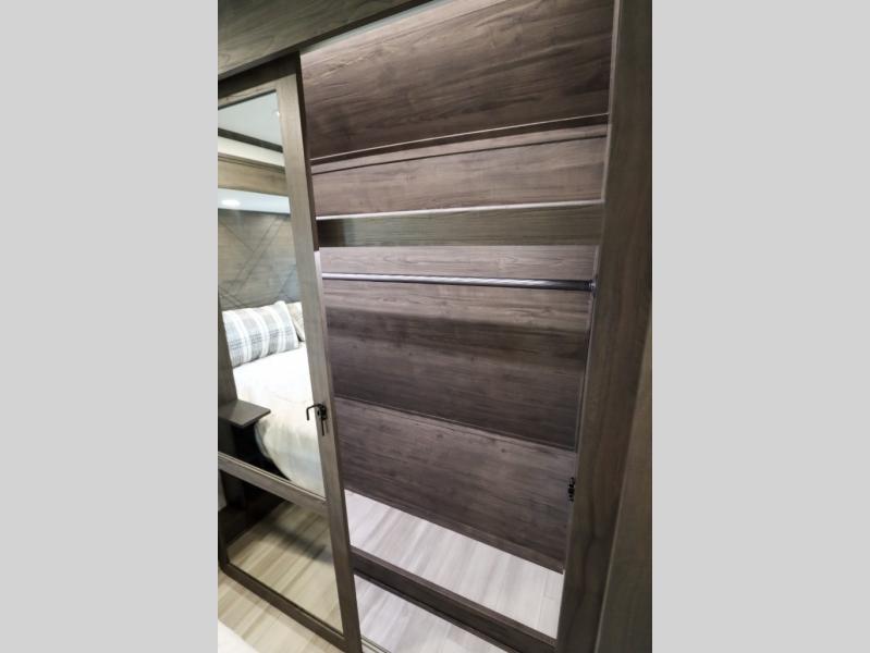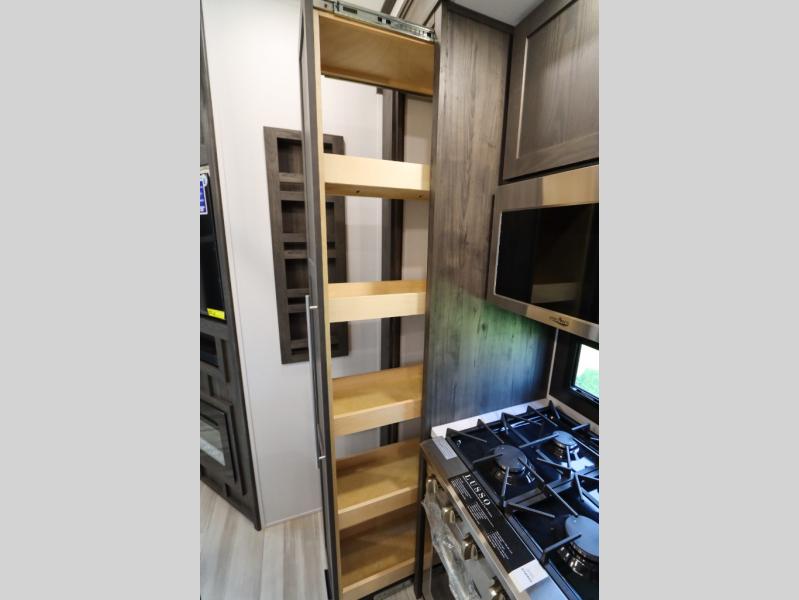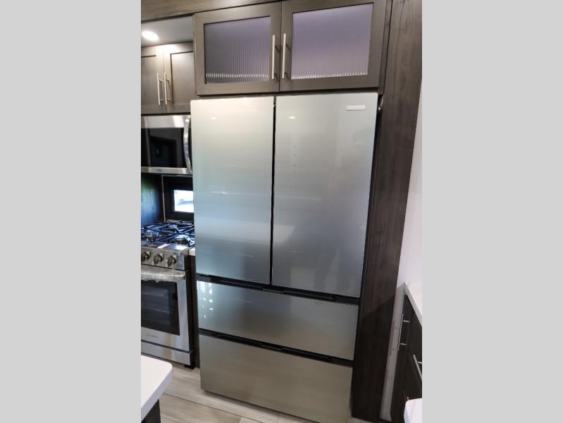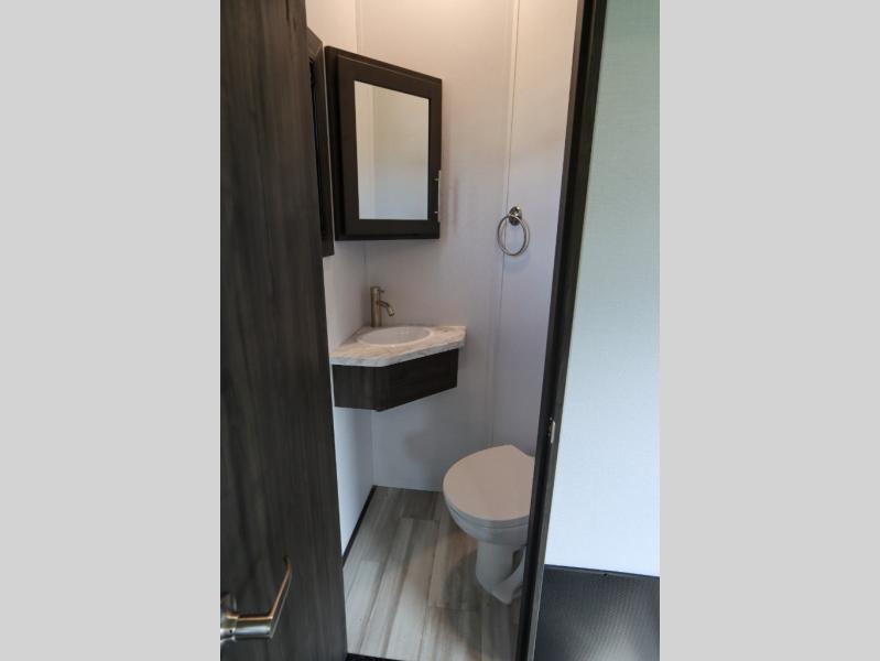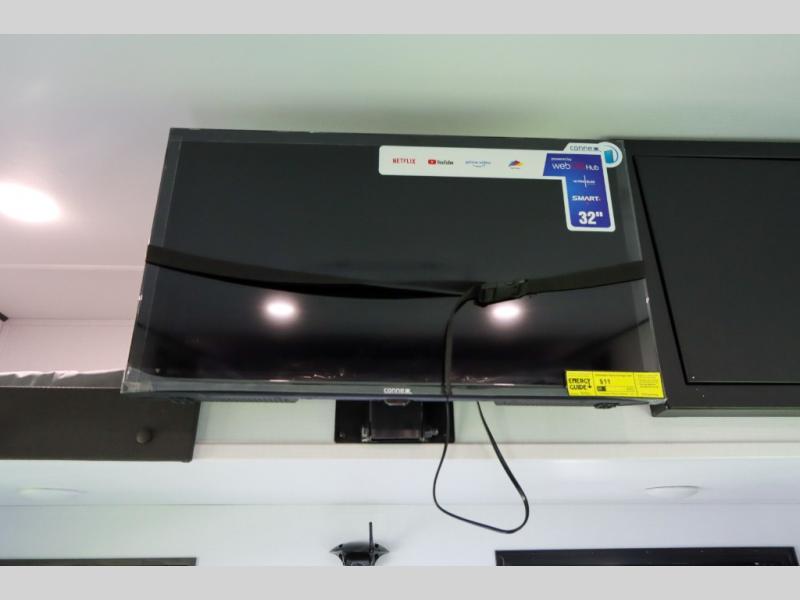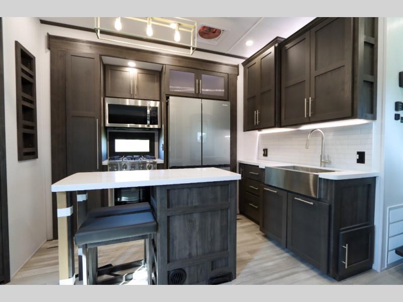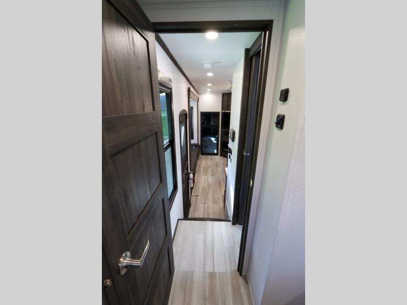 You will have plenty of room to store your off-road toys with a 15' garage area that comes with an Adjust-A-Track system! Once you unload your toys with the 8' MORryde zero gravity ramp door, you can set up the dual opposing sofas with a top queen bed above, the LED TV, and the loft with a bunk mat, plus there is a half bathroom and one of the dual entrance doors to the unit. The chef will have everything they need to prepare their best home cooked meals and others can sit at the center table with swing-out stools to socialize with them while they prepare it. Gather together on the residential four person sofa slide for movie night with the entertainment center which has a fireplace for an even cozier evening. The dual entry bathroom makes it easy for everyone to freshen up in, especially those staying in the front private bedroom which has a front master closet with washer and dryer prep for clean clothes throughout your trip and Fuzion king bed slide!