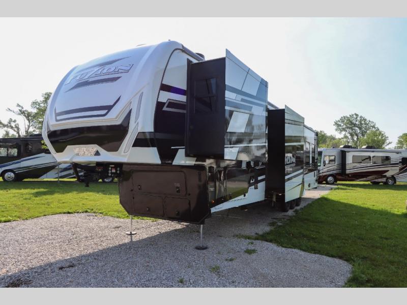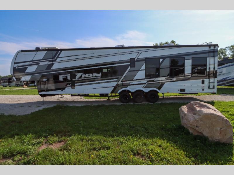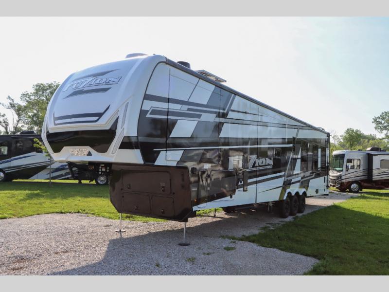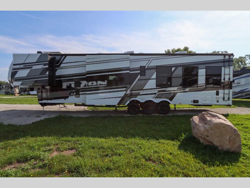 Get your adrenaline pumping with any one of these Keystone RV Fuzion fifth wheel toy haulers! The frame welded, Adjust-A-Trac tie-downs have 38 points to fully secure your toys as you travel, and the extended garage lengths have outside storage so you can haul bigger toys. A fully enclosed fuel pump station is integrated with the iN-Command Generation 3 control system with Global Connect. And the exclusive Omni-Chill technology offers high-efficiency air conditioning and maximum cooling. The interior provides fiberglass backed linoleum flooring, extra-tall slide height, solid wood cabinet and drawer frames, and extra tall ceilings with crown molding to mention a few luxuries. Outside, you'll find three Girard cassette awnings, 4k framed tinted safety glass windows, a Titan hydraulic leveling system, and many more conveniences!