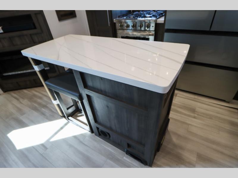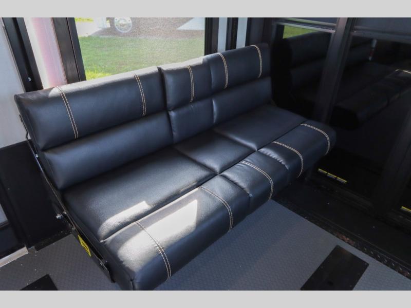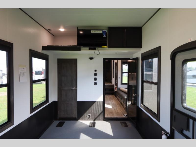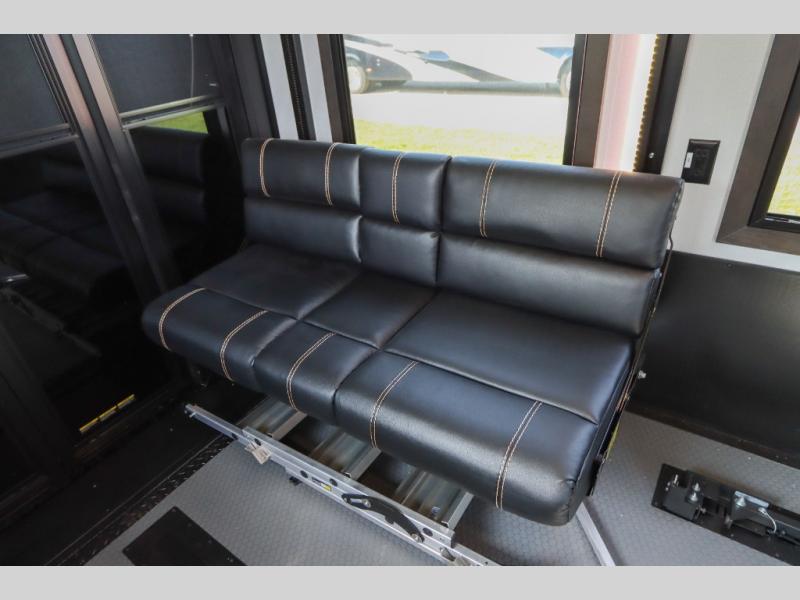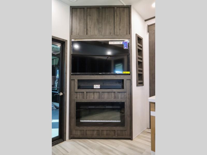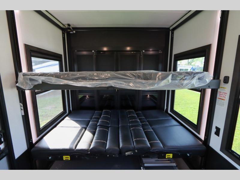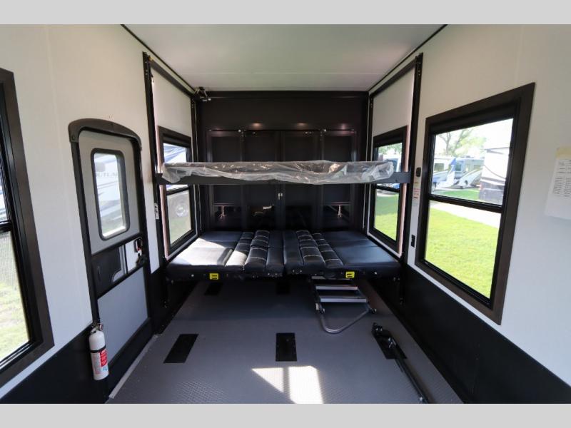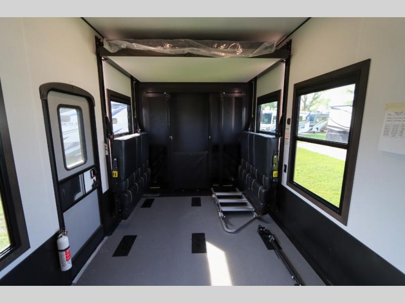 You will have plenty of room to store your off-road toys with a 15' garage area that comes with an Adjust-A-Track system! Once you unload your toys with the 8' MORryde zero gravity ramp door, you can set up the dual opposing sofas with a top queen bed above, the LED TV, and the loft with a bunk mat, plus there is a half bathroom and one of the dual entrance doors to the unit. The chef will have everything they need to prepare their best home cooked meals and others can sit at the center table with swing-out stools to socialize with them while they prepare it. Gather together on the residential four person sofa slide for movie night with the entertainment center which has a fireplace for an even cozier evening. The dual entry bathroom makes it easy for everyone to freshen up in, especially those staying in the front private bedroom which has a front master closet with washer and dryer prep for clean clothes throughout your trip and Fuzion king bed slide!