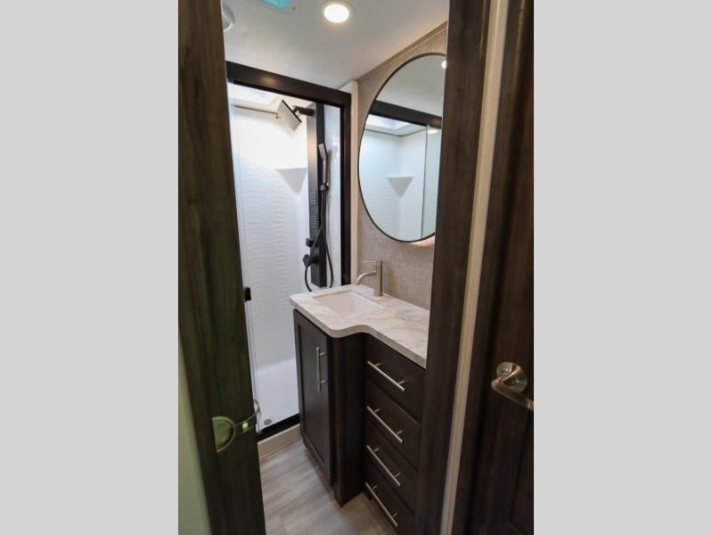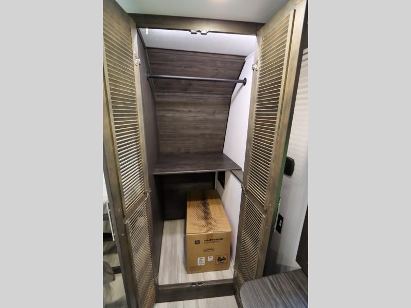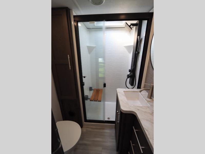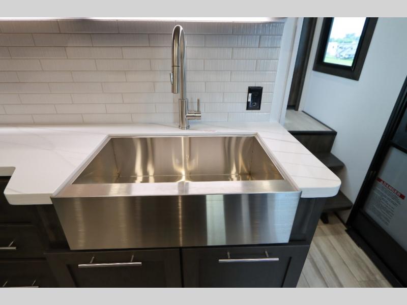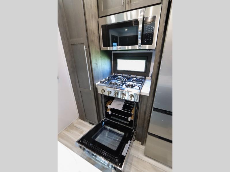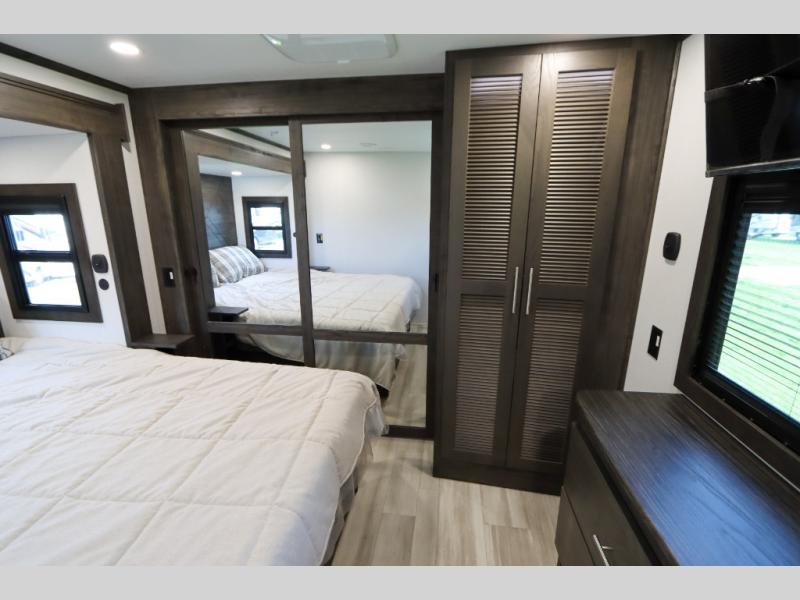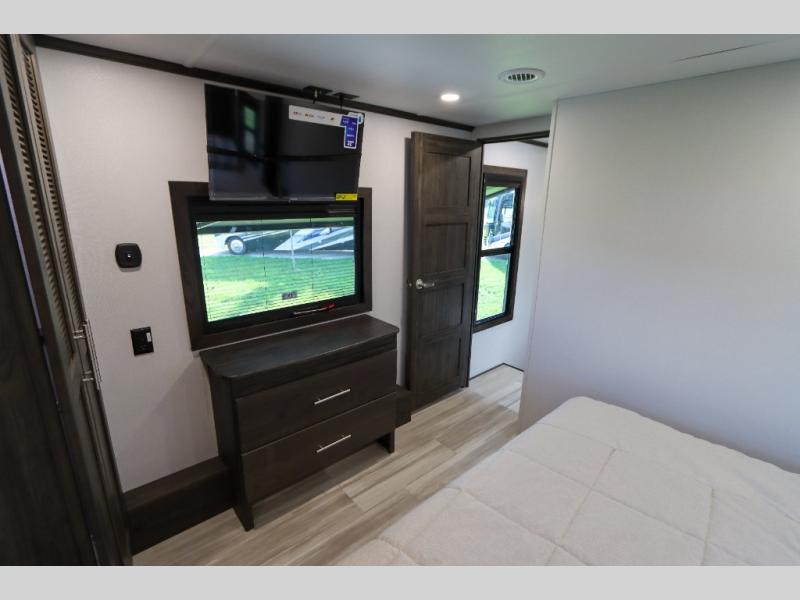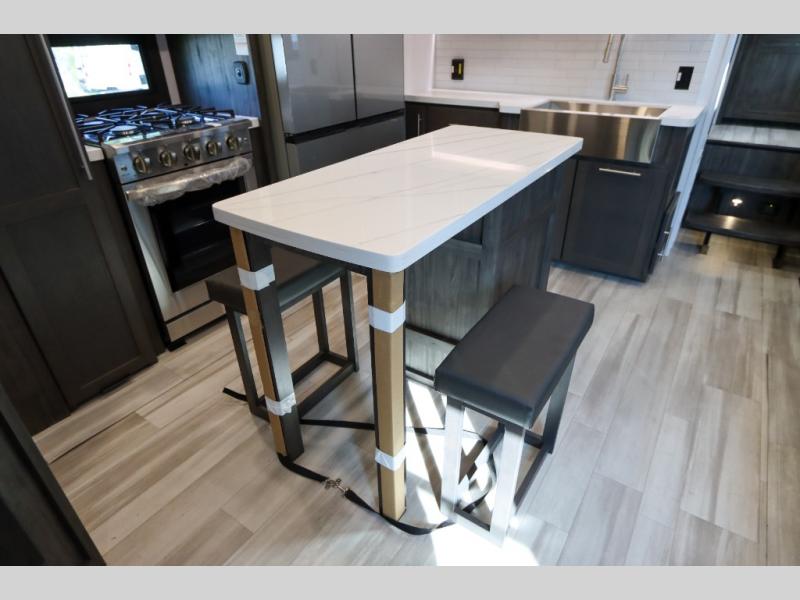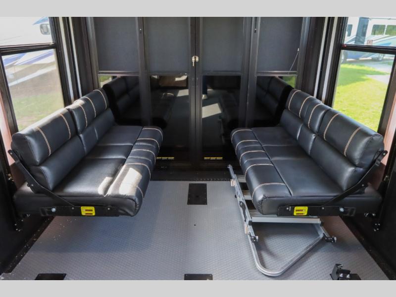 You will have plenty of room to store your off-road toys with a 15' garage area that comes with an Adjust-A-Track system! Once you unload your toys with the 8' MORryde zero gravity ramp door, you can set up the dual opposing sofas with a top queen bed above, the LED TV, and the loft with a bunk mat, plus there is a half bathroom and one of the dual entrance doors to the unit. The chef will have everything they need to prepare their best home cooked meals and others can sit at the center table with swing-out stools to socialize with them while they prepare it. Gather together on the residential four person sofa slide for movie night with the entertainment center which has a fireplace for an even cozier evening. The dual entry bathroom makes it easy for everyone to freshen up in, especially those staying in the front private bedroom which has a front master closet with washer and dryer prep for clean clothes throughout your trip and Fuzion king bed slide!