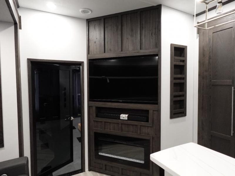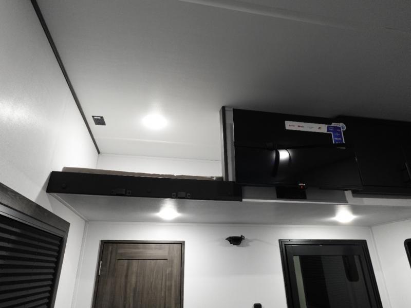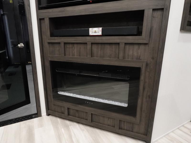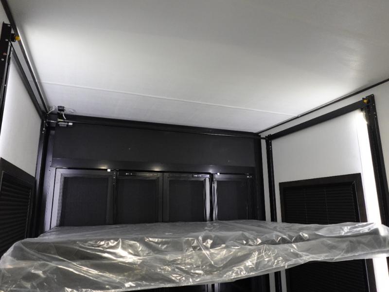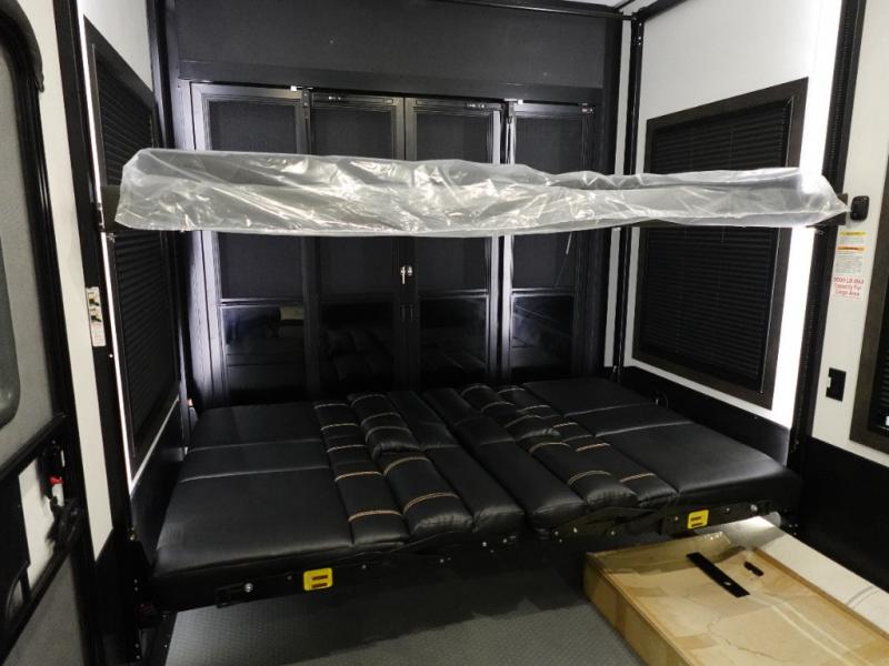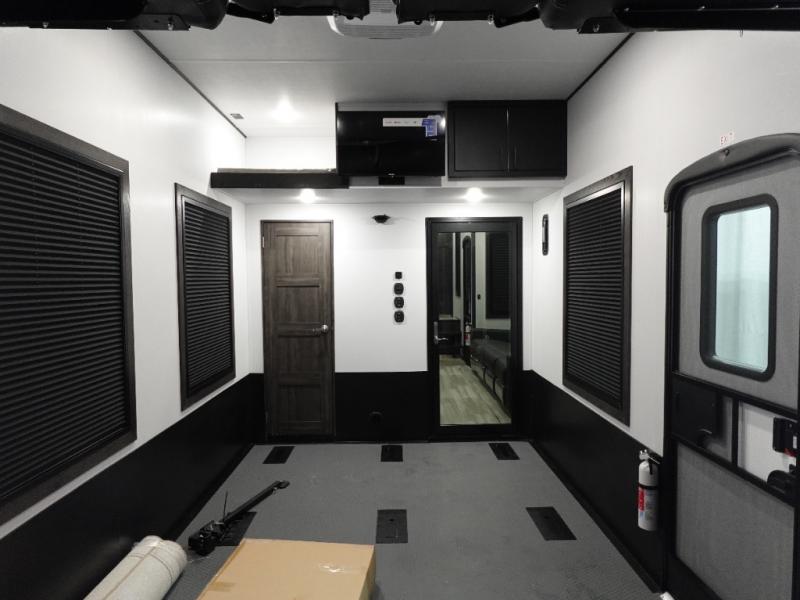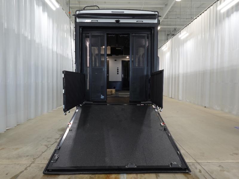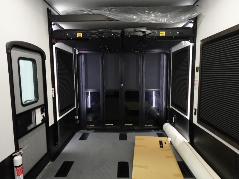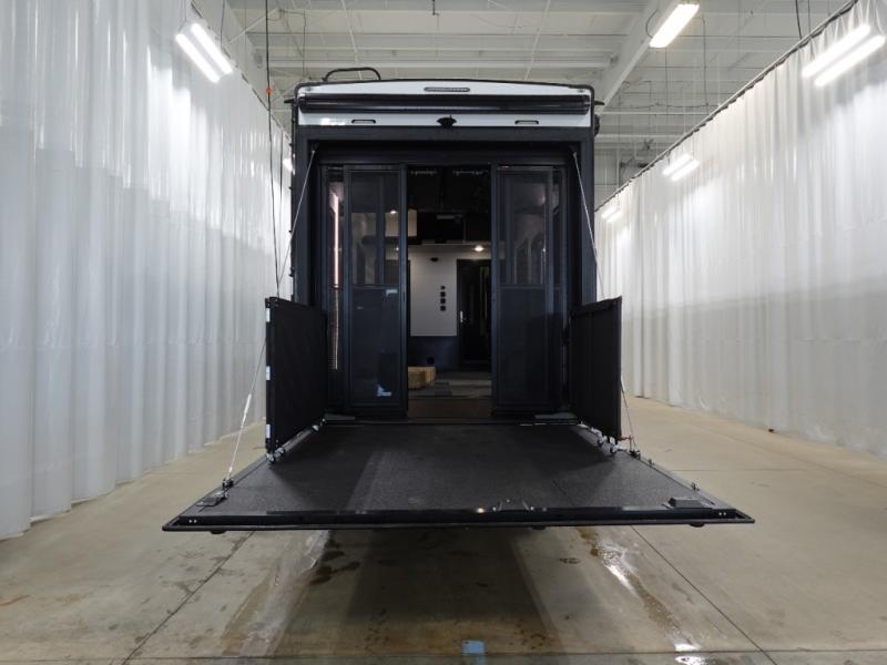 You will have plenty of room to store your off-road toys with a 15' garage area that comes with an Adjust-A-Track system! Once you unload your toys with the 8' MORryde zero gravity ramp door, you can set up the dual opposing sofas with a top queen bed above, the LED TV, and the loft with a bunk mat, plus there is a half bathroom and one of the dual entrance doors to the unit. The chef will have everything they need to prepare their best home cooked meals and others can sit at the center table with swing-out stools to socialize with them while they prepare it. Gather together on the residential four person sofa slide for movie night with the entertainment center which has a fireplace for an even cozier evening. The dual entry bathroom makes it easy for everyone to freshen up in, especially those staying in the front private bedroom which has a front master closet with washer and dryer prep for clean clothes throughout your trip and Fuzion king bed slide!