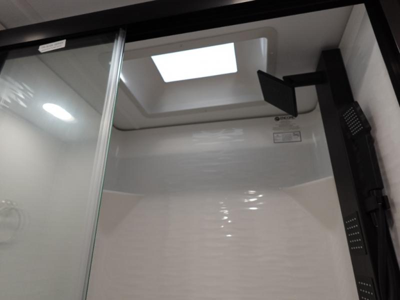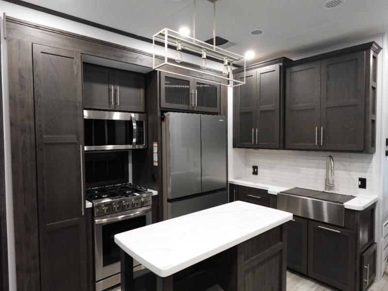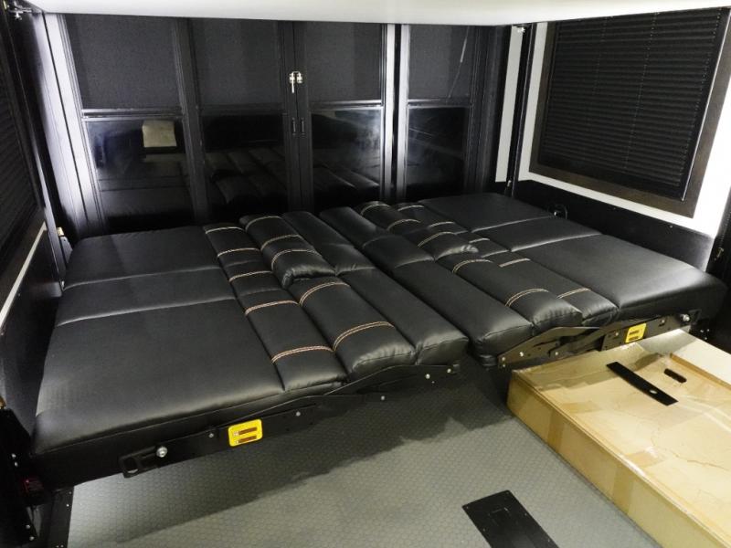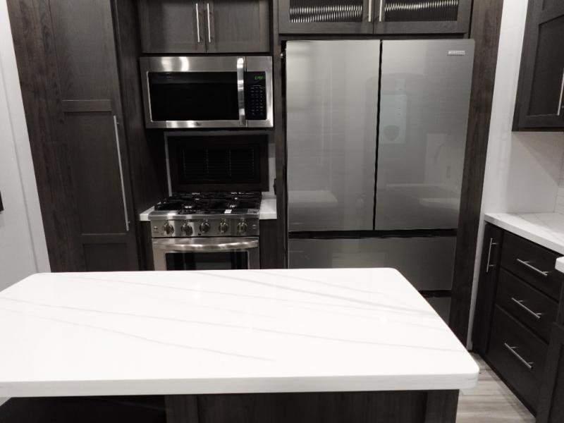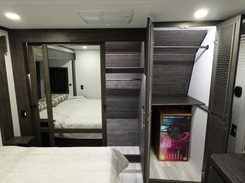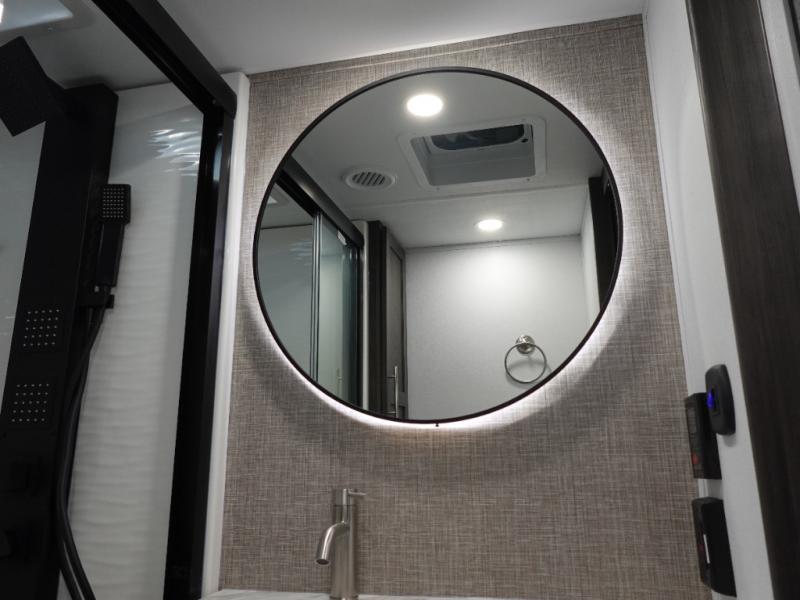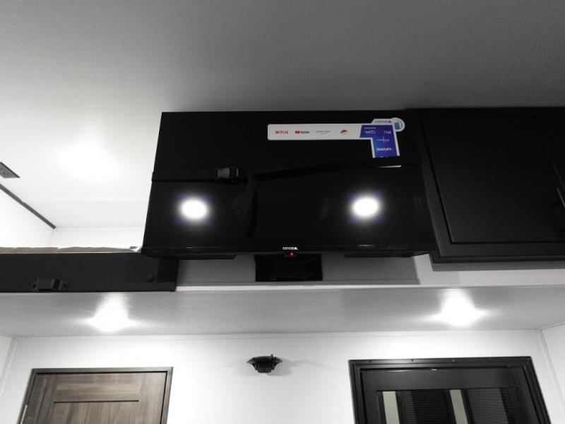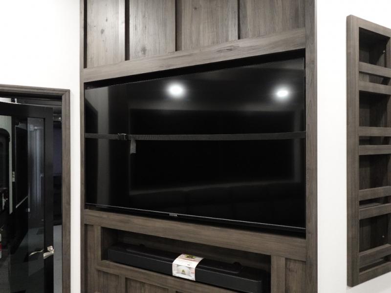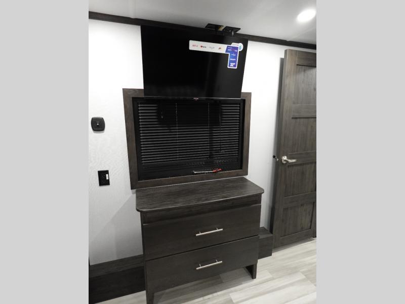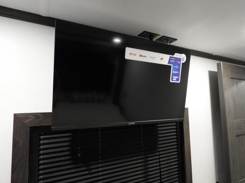 You will have plenty of room to store your off-road toys with a 15' garage area that comes with an Adjust-A-Track system! Once you unload your toys with the 8' MORryde zero gravity ramp door, you can set up the dual opposing sofas with a top queen bed above, the LED TV, and the loft with a bunk mat, plus there is a half bathroom and one of the dual entrance doors to the unit. The chef will have everything they need to prepare their best home cooked meals and others can sit at the center table with swing-out stools to socialize with them while they prepare it. Gather together on the residential four person sofa slide for movie night with the entertainment center which has a fireplace for an even cozier evening. The dual entry bathroom makes it easy for everyone to freshen up in, especially those staying in the front private bedroom which has a front master closet with washer and dryer prep for clean clothes throughout your trip and Fuzion king bed slide!
