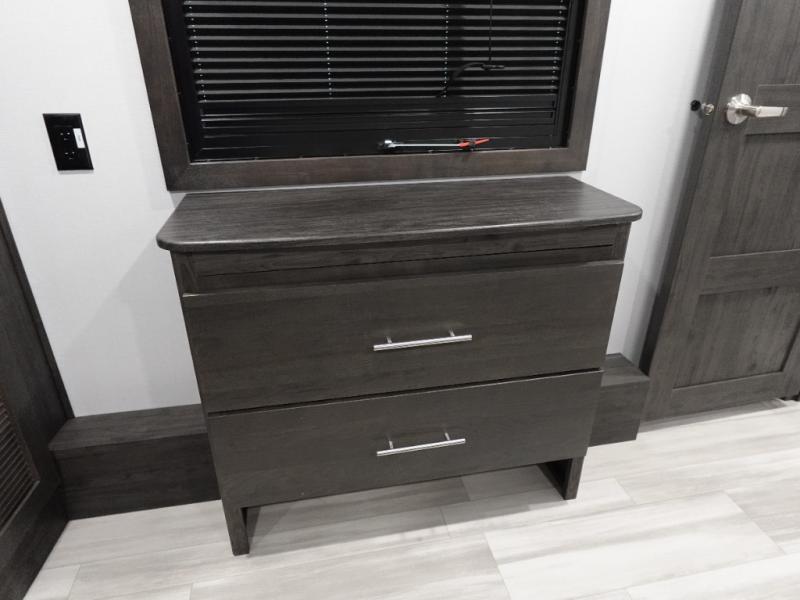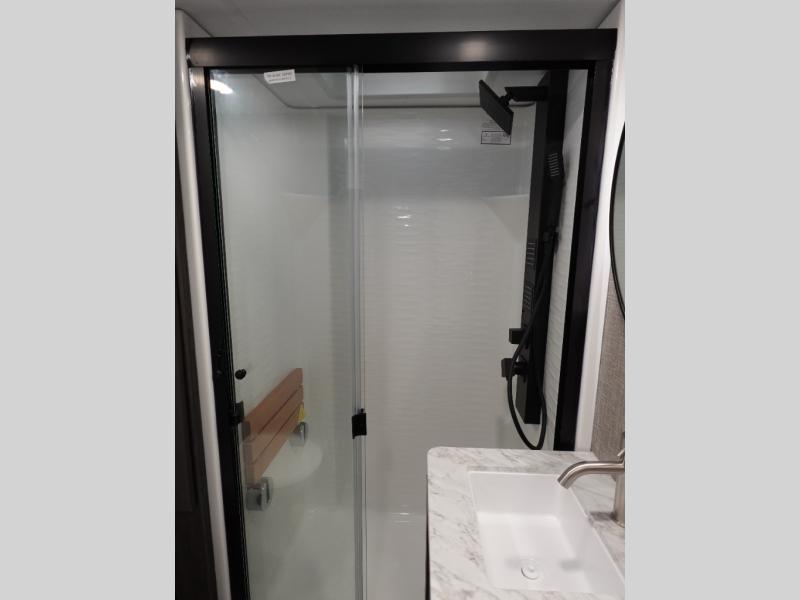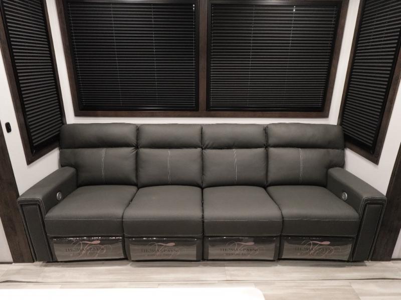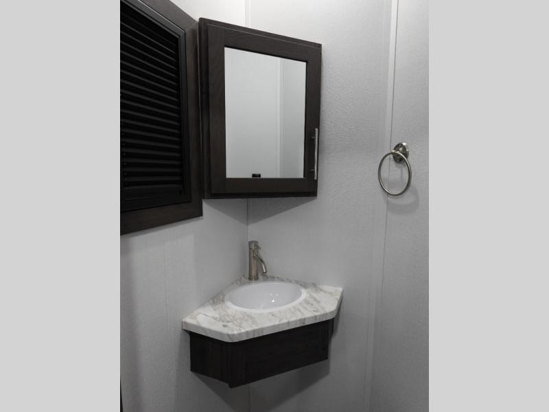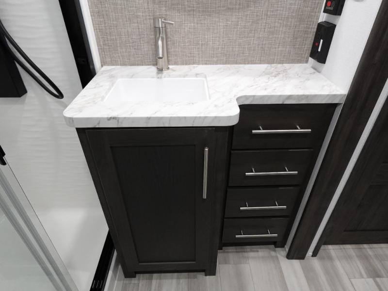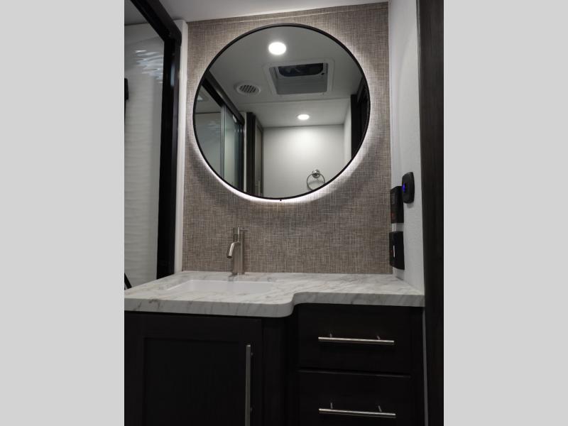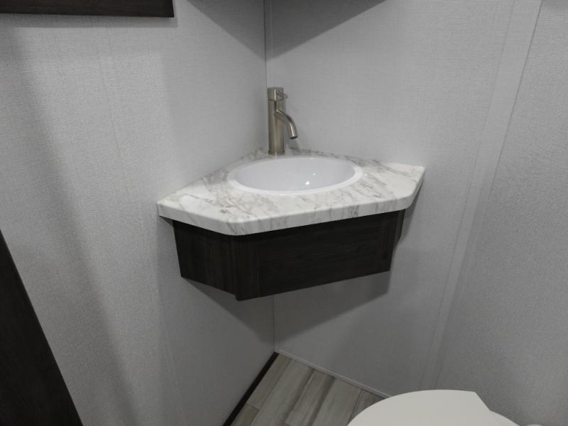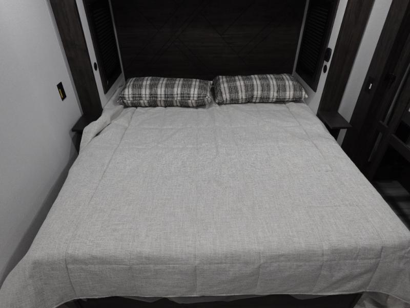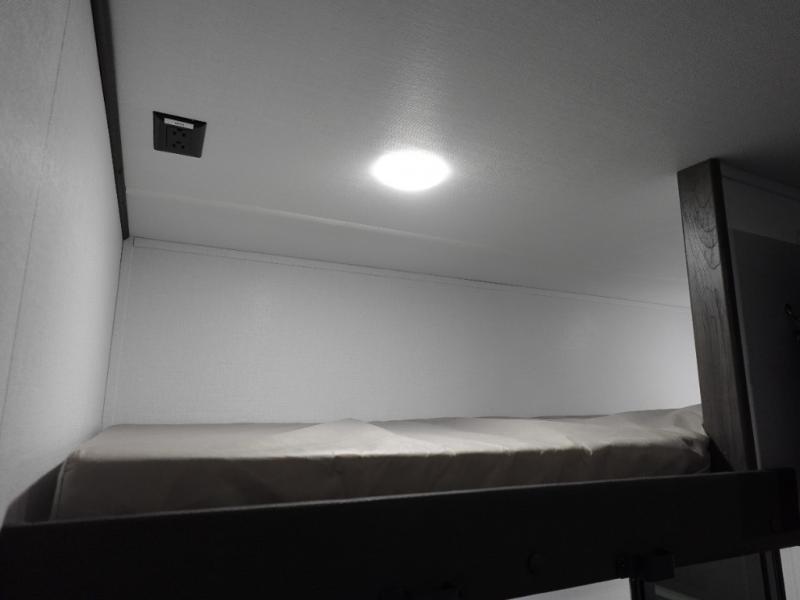 You will have plenty of room to store your off-road toys with a 15' garage area that comes with an Adjust-A-Track system! Once you unload your toys with the 8' MORryde zero gravity ramp door, you can set up the dual opposing sofas with a top queen bed above, the LED TV, and the loft with a bunk mat, plus there is a half bathroom and one of the dual entrance doors to the unit. The chef will have everything they need to prepare their best home cooked meals and others can sit at the center table with swing-out stools to socialize with them while they prepare it. Gather together on the residential four person sofa slide for movie night with the entertainment center which has a fireplace for an even cozier evening. The dual entry bathroom makes it easy for everyone to freshen up in, especially those staying in the front private bedroom which has a front master closet with washer and dryer prep for clean clothes throughout your trip and Fuzion king bed slide!