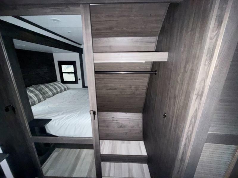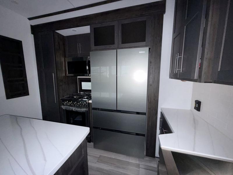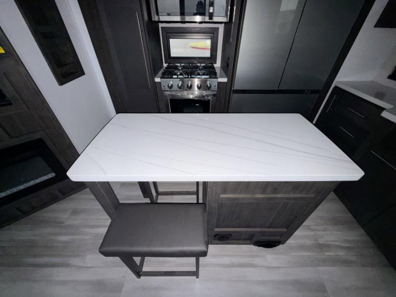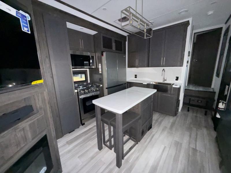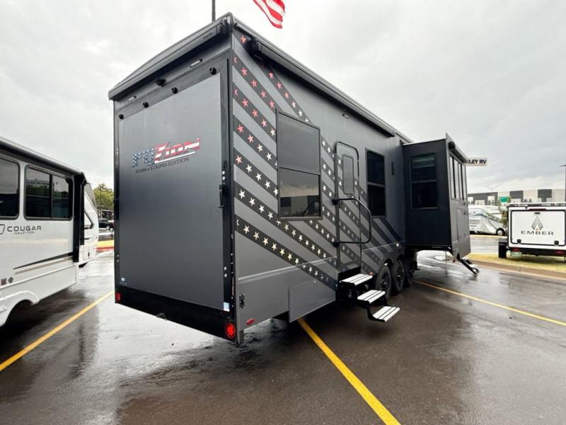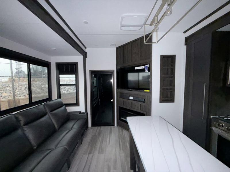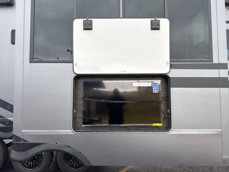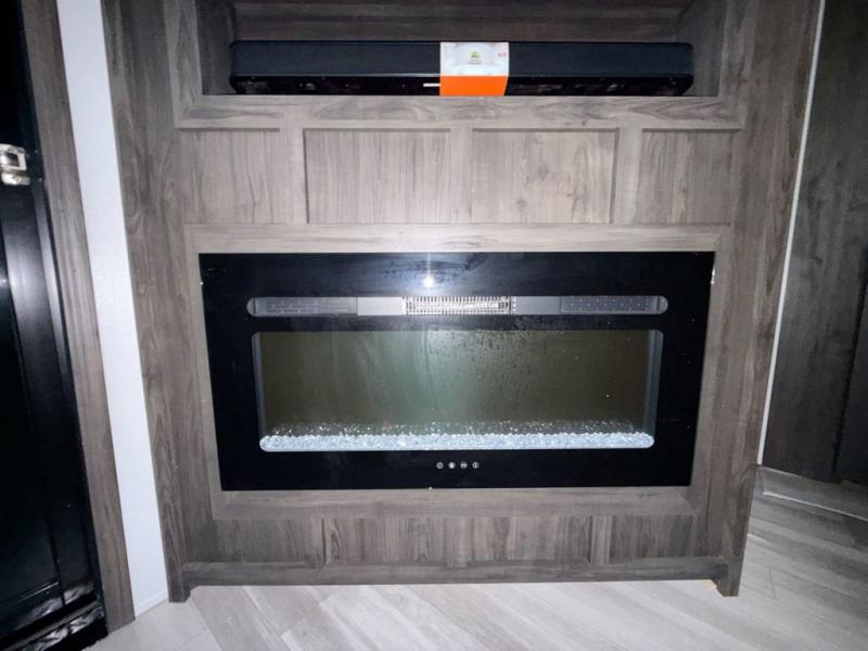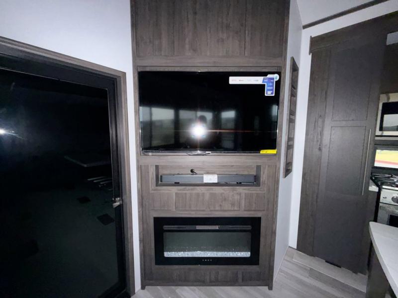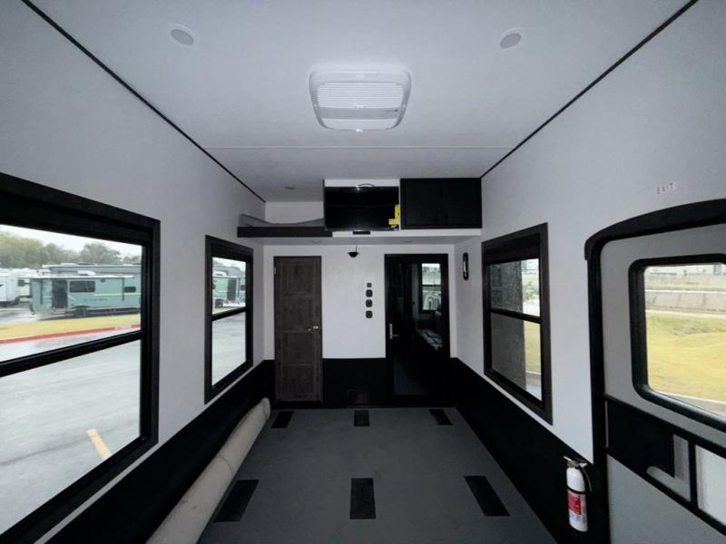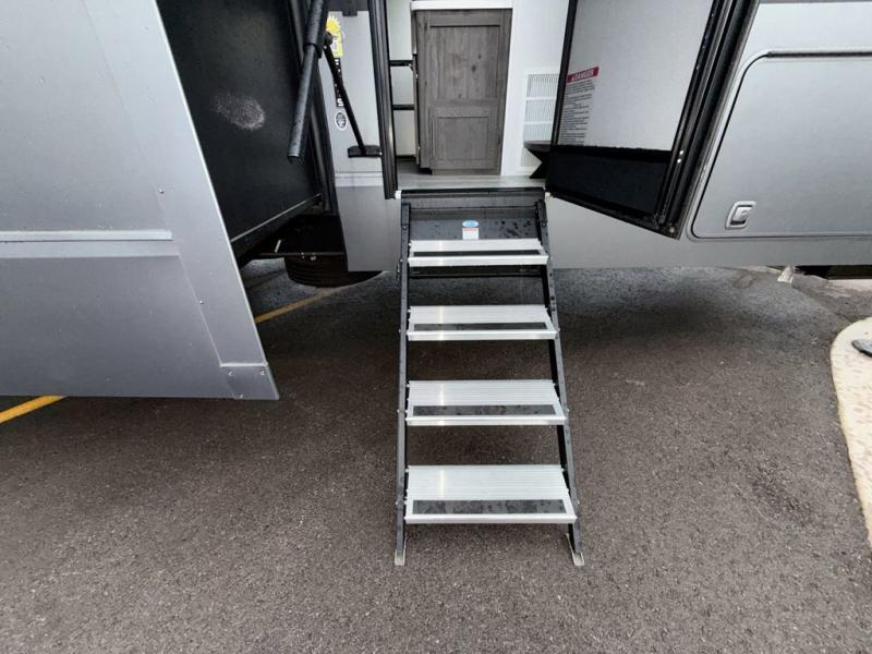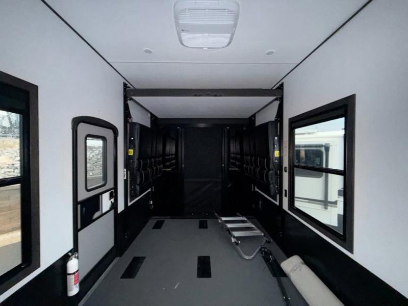 You will have plenty of room to store your off-road toys with a 15' garage area that comes with an Adjust-A-Track system! Once you unload your toys with the 8' MORryde zero gravity ramp door, you can set up the dual opposing sofas with a top queen bed above, the LED TV, and the loft with a bunk mat, plus there is a half bathroom and one of the dual entrance doors to the unit. The chef will have everything they need to prepare their best home cooked meals and others can sit at the center table with swing-out stools to socialize with them while they prepare it. Gather together on the residential four person sofa slide for movie night with the entertainment center which has a fireplace for an even cozier evening. The dual entry bathroom makes it easy for everyone to freshen up in, especially those staying in the front private bedroom which has a front master closet with washer and dryer prep for clean clothes throughout your trip and Fuzion king bed slide!