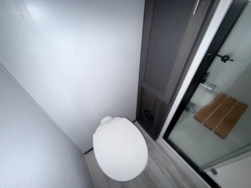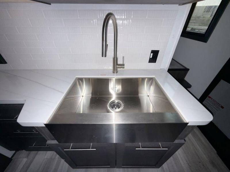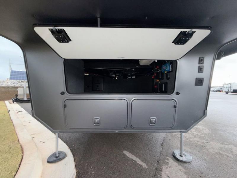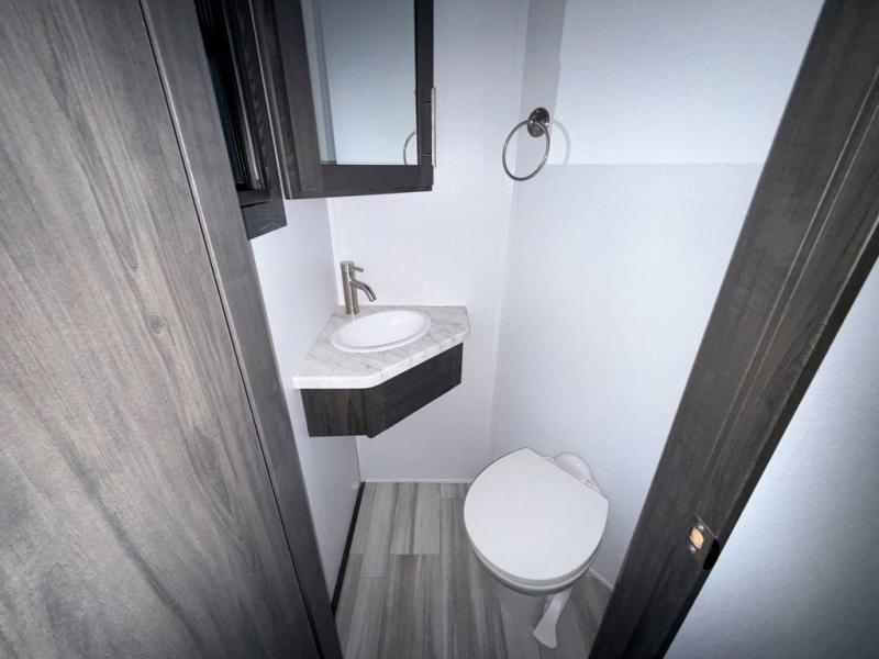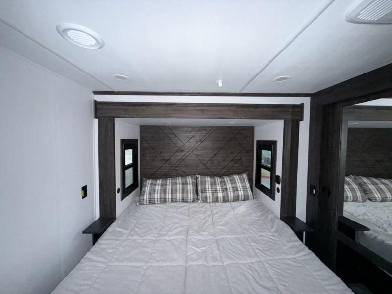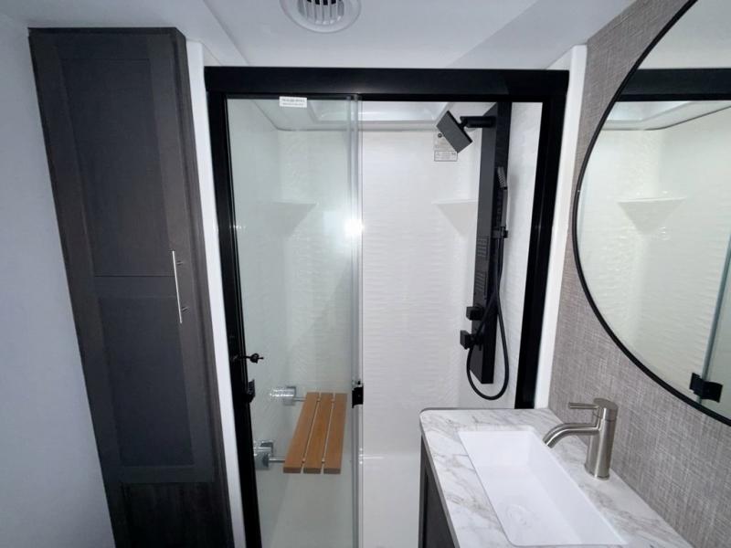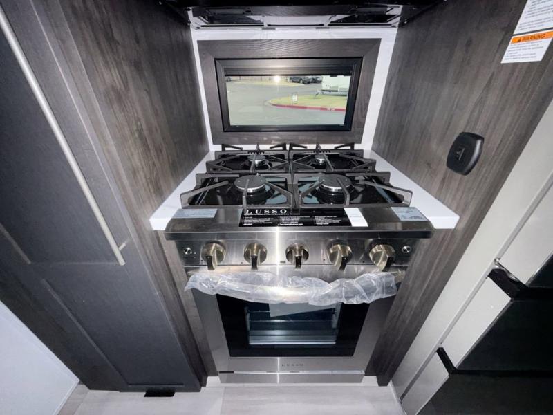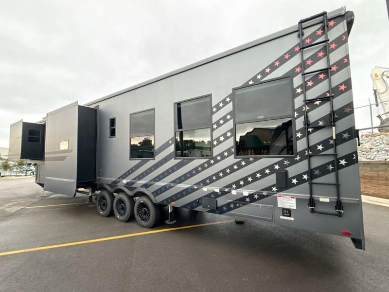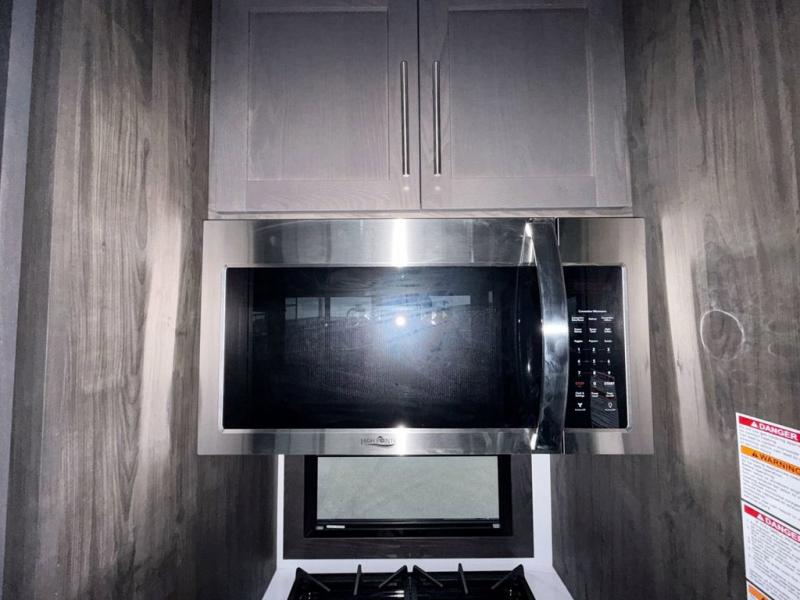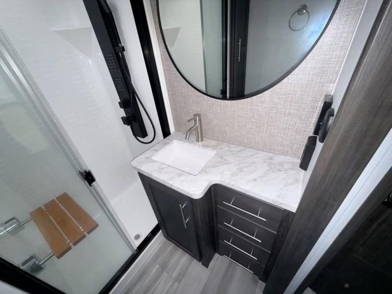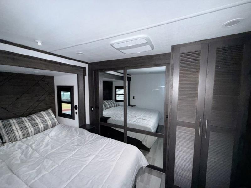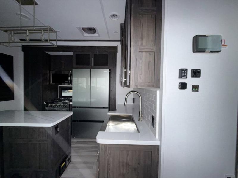 You will have plenty of room to store your off-road toys with a 15' garage area that comes with an Adjust-A-Track system! Once you unload your toys with the 8' MORryde zero gravity ramp door, you can set up the dual opposing sofas with a top queen bed above, the LED TV, and the loft with a bunk mat, plus there is a half bathroom and one of the dual entrance doors to the unit. The chef will have everything they need to prepare their best home cooked meals and others can sit at the center table with swing-out stools to socialize with them while they prepare it. Gather together on the residential four person sofa slide for movie night with the entertainment center which has a fireplace for an even cozier evening. The dual entry bathroom makes it easy for everyone to freshen up in, especially those staying in the front private bedroom which has a front master closet with washer and dryer prep for clean clothes throughout your trip and Fuzion king bed slide!