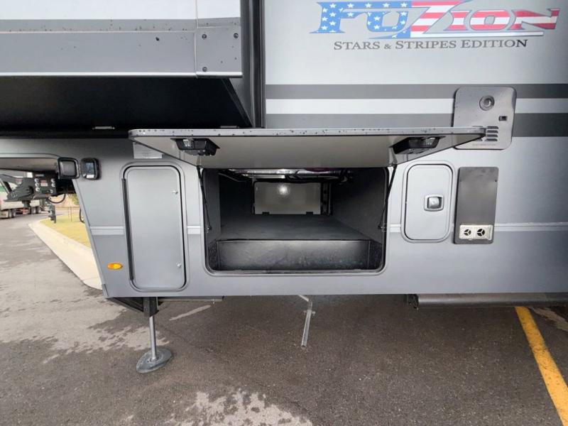 Get your adrenaline pumping with any one of these Keystone RV Fuzion fifth wheel toy haulers! The frame welded, Adjust-A-Trac tie-downs have 38 points to fully secure your toys as you travel, and the extended garage lengths have outside storage so you can haul bigger toys. A fully enclosed fuel pump station is integrated with the iN-Command Generation 3 control system with Global Connect. And the exclusive Omni-Chill technology offers high-efficiency air conditioning and maximum cooling. The interior provides fiberglass backed linoleum flooring, extra-tall slide height, solid wood cabinet and drawer frames, and extra tall ceilings with crown molding to mention a few luxuries. Outside, you'll find three Girard cassette awnings, 4k framed tinted safety glass windows, a Titan hydraulic leveling system, and many more conveniences!