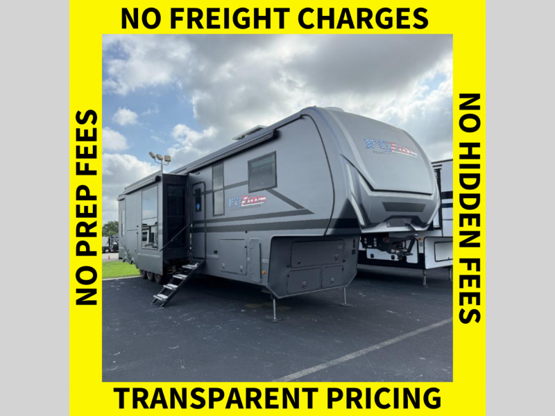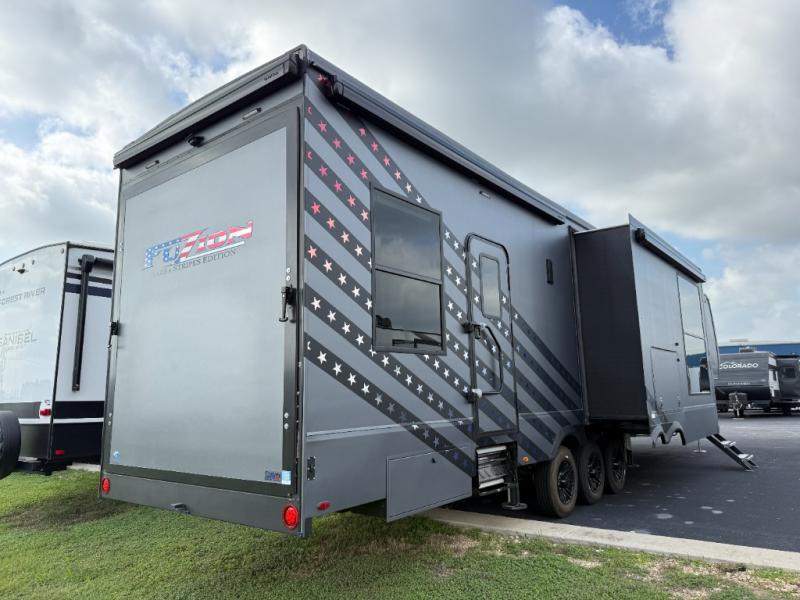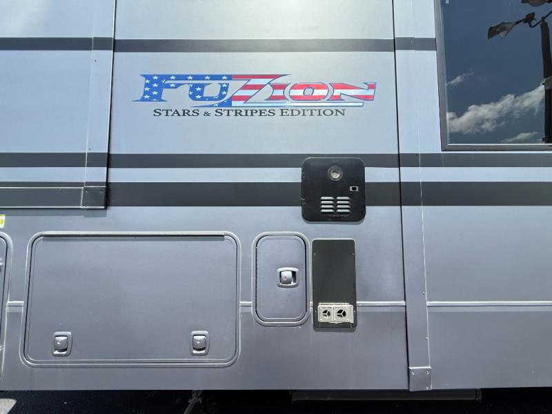Get your adrenaline pumping with any one of these Keystone RV Fuzion fifth wheel toy haulers! The frame welded, Adjust-A-Trac tie-downs have 38 points to fully secure your toys as you travel, and the extended garage lengths have outside storage so you can haul bigger toys. A fully enclosed fuel pump station is integrated with the iN-Command Generation 3 control system with Global Connect. And the exclusive Omni-Chill technology offers high-efficiency air conditioning and maximum cooling. The interior provides fiberglass backed linoleum flooring, extra-tall slide height, solid wood cabinet and drawer frames, and extra tall ceilings with crown molding to mention a few luxuries. Outside, you'll find three Girard cassette awnings, 4k framed tinted safety glass windows, a Titan hydraulic leveling system, and many more conveniences!