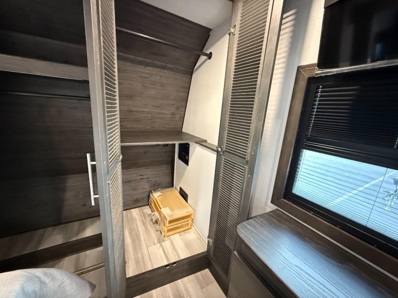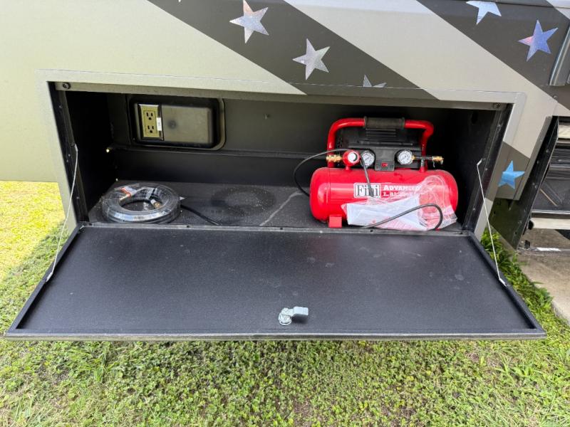 Adventure is just around the corner in this triple slide out, triple axle toy hauler. Once your toys are unloaded from the 13' 6" separate garage, you can relax on the dual opposing sofas that include a top queen bed for nighttime use. There is also a loft with a bunk mat here, overhead cabinets for storage, and an LED TV to watch the big game. The living area is where everyone can come together since there is a large L-shaped sofa, theater seating, and an entertainment center with a fireplace. You'll love the kitchen with its ample counter space, two pull-out pantries, pull-out trash cans, and residential refrigerator. You'll find the front private bedroom to be ultra accommodating with its master closet, dresser with hidden storage, LED TV, plus washer and dryer prep. And we saved the best for last! This unit also includes two full baths to make camping with friends and family easier than ever!