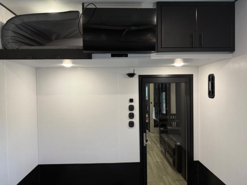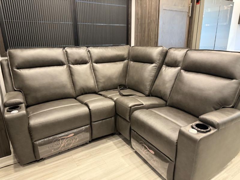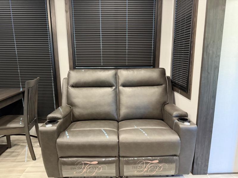 Adventure is just around the corner in this triple slide out, triple axle toy hauler. Once your toys are unloaded from the14' separate garage, you can relax on the dual opposing sofas that include a top queen bed for nighttime use. There is also a loft with a bunk mat here, overhead cabinets for storage, and an LED TV to watch the big game. The living area is where everyone can come together since there is an L-shaped sofa, theater seating, and an entertainment center for movies, and you can choose to add the optional dinette table to dine at. You'll love the kitchen with its counter peninsula, four burner range, and residential refrigerator. A full bath towards the front will let you freshen up each day, and the front private bedroom includes a Fuzion king bed for all-around comfort. There is also a master closet here, along with USB outlets, a dresser with hidden storage, plus washer and dryer prep!