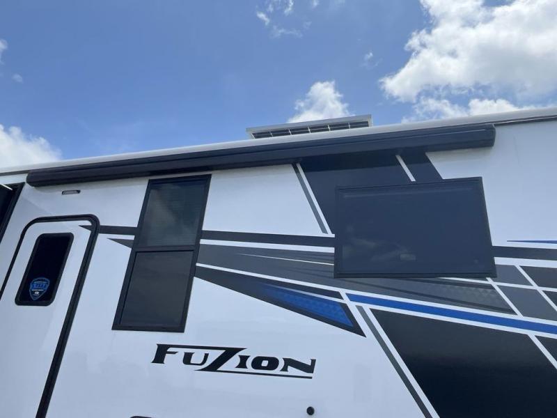 Get your adrenaline pumping with any one of these Keystone RV Fuzion fifth wheel toy haulers! The frame welded, Adjust-A-Trac tie-downs have 38 points to fully secure your toys as you travel, and the extended garage lengths have outside storage so you can haul bigger toys. A fully enclosed fuel pump station is integrated with the iN-Command Generation 3 control system with Global Connect. And the exclusive Omni-Chill technology offers high-efficiency air conditioning and maximum cooling. The interior provides fiberglass backed linoleum flooring, extra-tall slide height, solid wood cabinet and drawer frames, and extra tall ceilings with crown molding to mention a few luxuries. Outside, you'll find three Girard cassette awnings, 4k framed tinted safety glass windows, a Titan hydraulic leveling system, and many more conveniences!