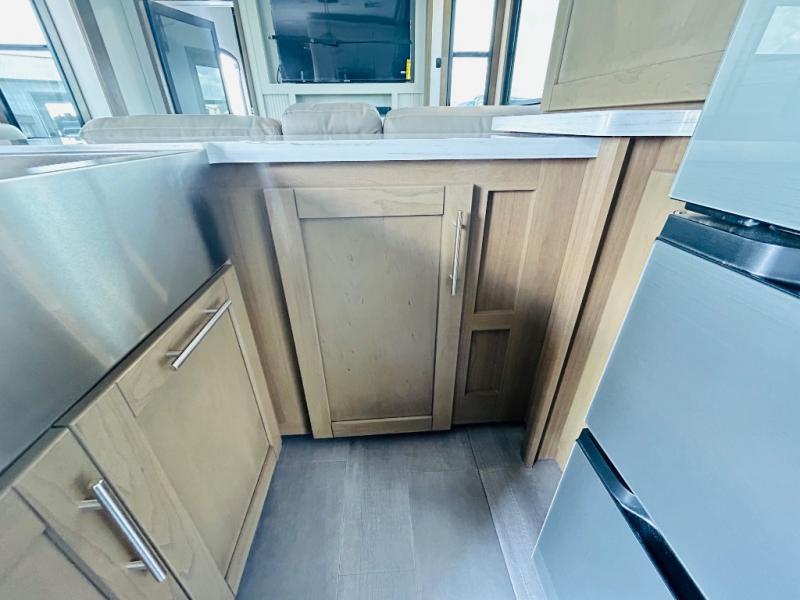Adventure is just around the corner in this triple slide out, triple axle toy hauler. Once your toys are unloaded from the14' separate garage, you can relax on the dual opposing sofas that include a top queen bed for nighttime use. There is also a loft with a bunk mat here, overhead cabinets for storage, and an LED TV to watch the big game. The living area is where everyone can come together since there is an L-shaped sofa, theater seating, and an entertainment center for movies, and you can choose to add the optional dinette table to dine at. You'll love the kitchen with its counter peninsula, four burner range, and residential refrigerator. A full bath towards the front will let you freshen up each day, and the front private bedroom includes a Fuzion king bed for all-around comfort. There is also a master closet here, along with USB outlets, a dresser with hidden storage, plus washer and dryer prep!