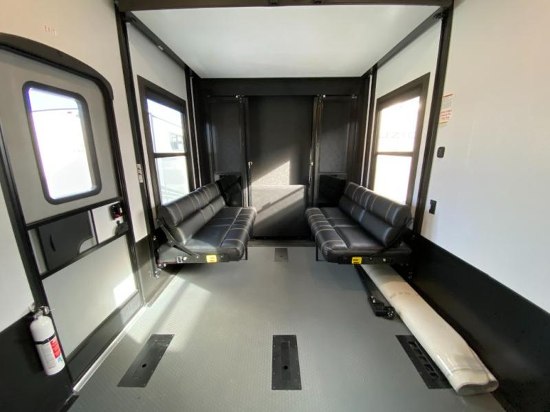 Adventure is just around the corner in this triple slide out, triple axle toy hauler. Once your toys are unloaded from the 14' separate garage, you can relax on the dual opposing sofas that include a top queen bed for nighttime use. There is also a loft with a bunk mat here, overhead cabinets for storage, and an LED TV to watch the big game. The living area is where everyone can come together since there is a hide-a-bed sofa, theater seating, and an entertainment center for movies, and you can choose to add the optional dinette table to dine at. You'll love the kitchen with its U-shaped counter, four burner range, and residential refrigerator. A full bath towards the front will let you freshen up each day, and the front private bedroom includes a Fuzion king bed for all-around comfort. There is also a master closet here, along with USB outlets, a dresser with hidden storage, plus washer and dryer prep!