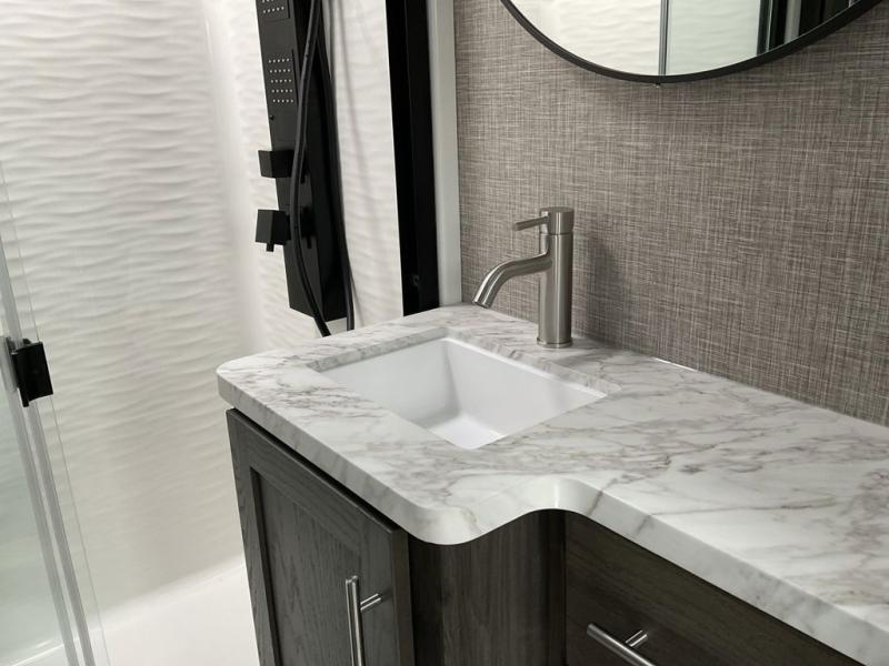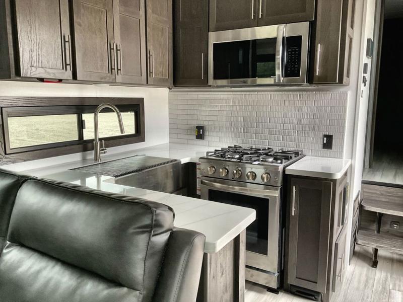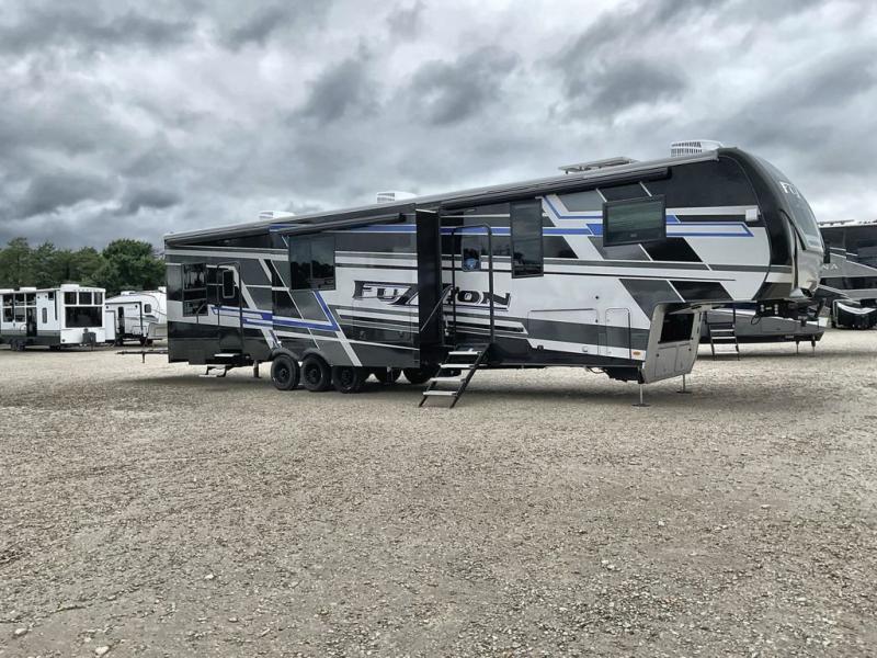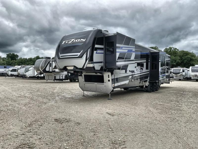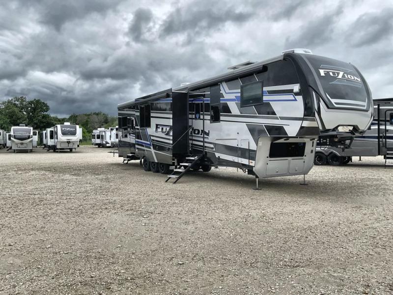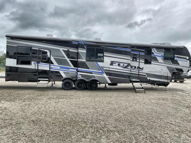 Get your adrenaline pumping with any one of these Keystone RV Fuzion fifth wheel toy haulers! The frame welded, Adjust-A-Trac tie-downs have 38 points to fully secure your toys as you travel, and the extended garage lengths have outside storage so you can haul bigger toys. A fully enclosed fuel pump station is integrated with the iN-Command Generation 3 control system with Global Connect. And the exclusive Omni-Chill technology offers high-efficiency air conditioning and maximum cooling. The interior provides fiberglass backed linoleum flooring, extra-tall slide height, solid wood cabinet and drawer frames, and extra tall ceilings with crown molding to mention a few luxuries. Outside, you'll find three Girard cassette awnings, 4k framed tinted safety glass windows, a Titan hydraulic leveling system, and many more conveniences!