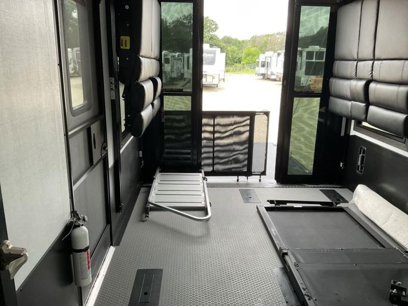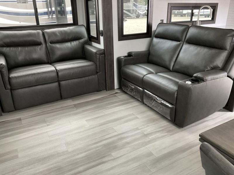Adventure is just around the corner in this triple slide out, triple axle toy hauler. Once your toys are unloaded from the 14' separate garage, you can relax on the dual opposing sofas that include a top queen bed for nighttime use. There is also a loft with a bunk mat here, overhead cabinets for storage, and an LED TV to watch the big game. The living area is where everyone can come together since there is a hide-a-bed sofa, theater seating, and an entertainment center for movies, and you can choose to add the optional dinette table to dine at. You'll love the kitchen with its U-shaped counter, four burner range, and residential refrigerator. A full bath towards the front will let you freshen up each day, and the front private bedroom includes a Fuzion king bed for all-around comfort. There is also a master closet here, along with USB outlets, a dresser with hidden storage, plus washer and dryer prep!