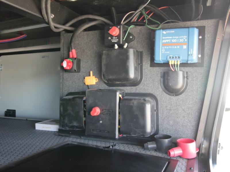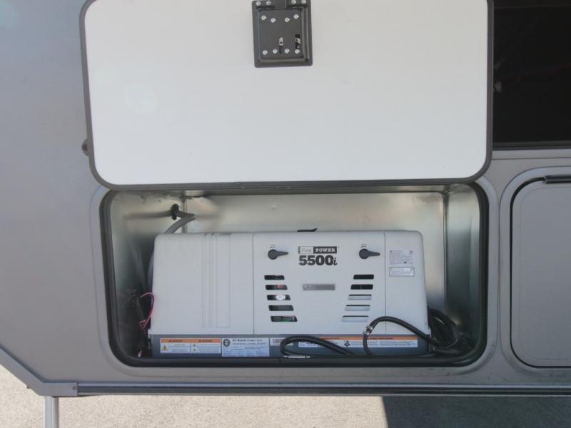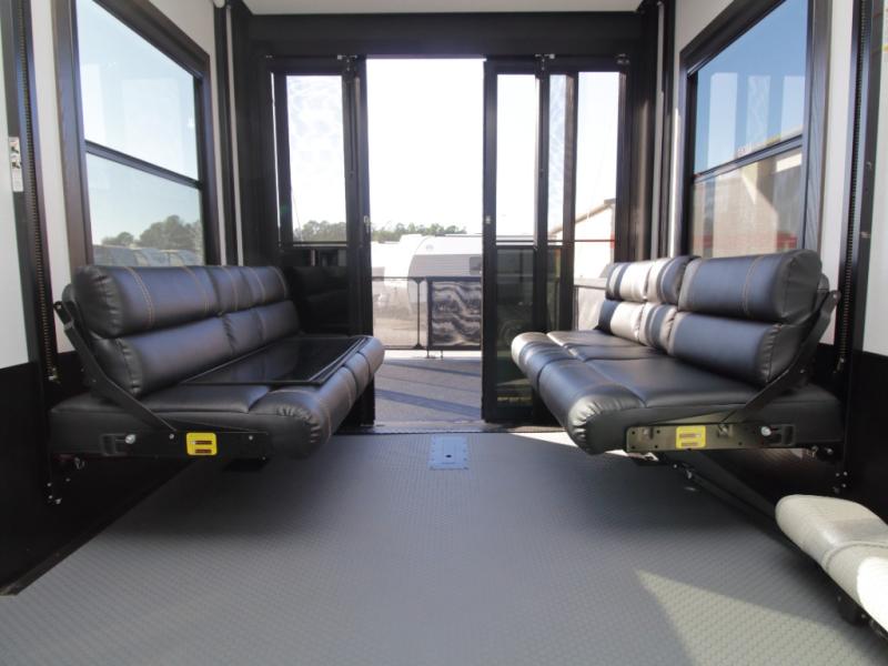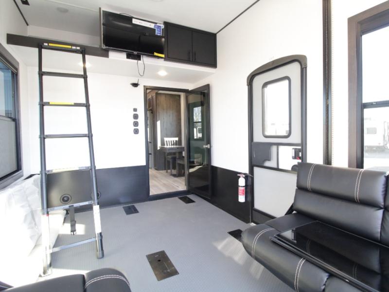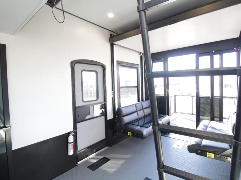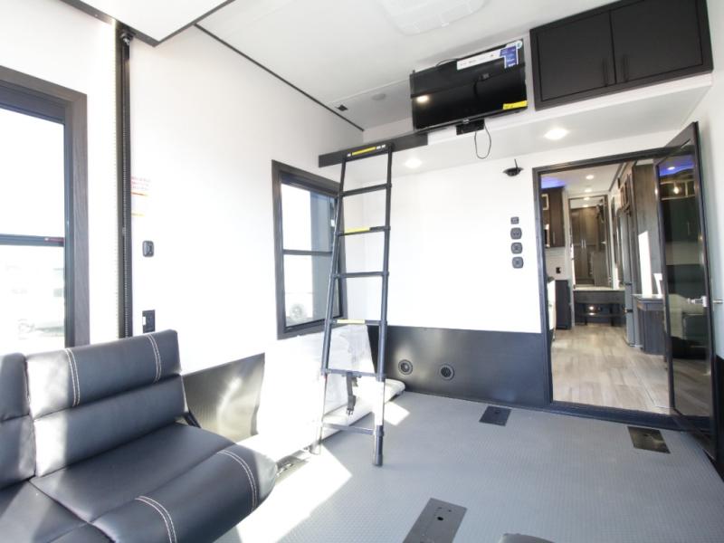 The garage offers dual opposing sofas with a power queen bed above, a loft with bunk mat for additional sleeping space, overhead cabinets for gear storage, and an LED TV for game days or movie nights. This versatile setup makes it easy to transition from adventure mode to relaxation without compromise.