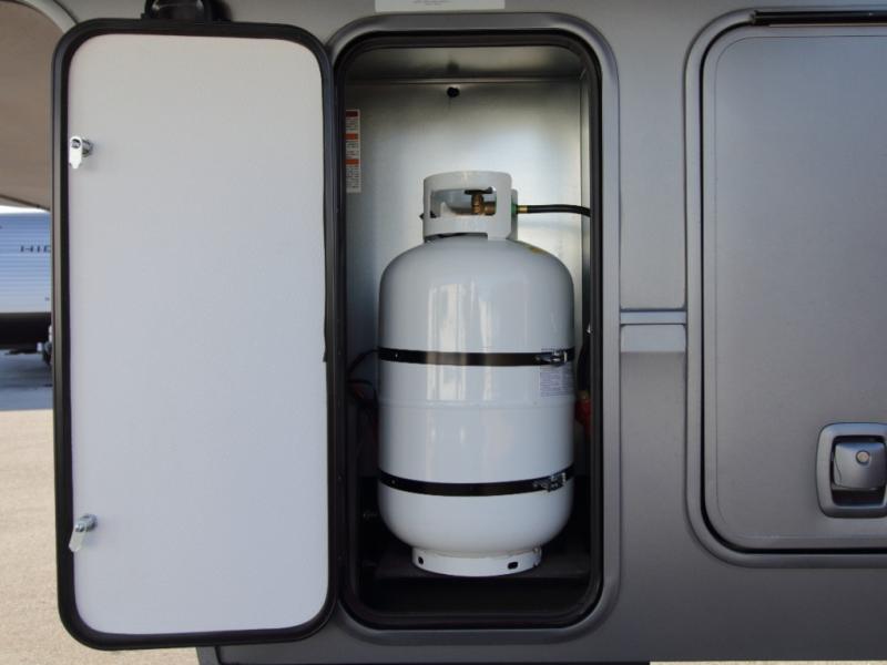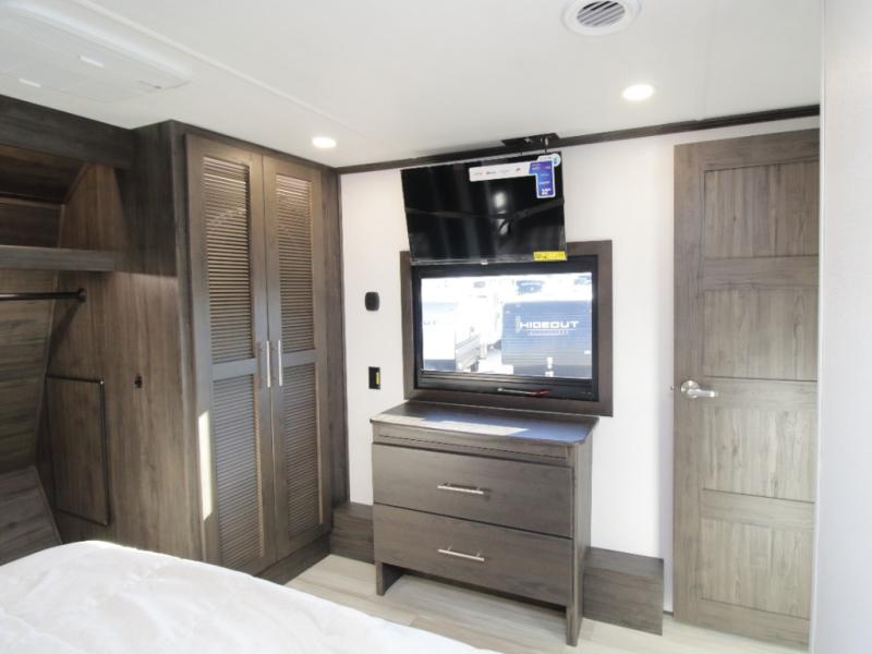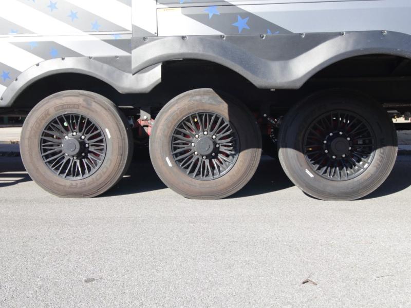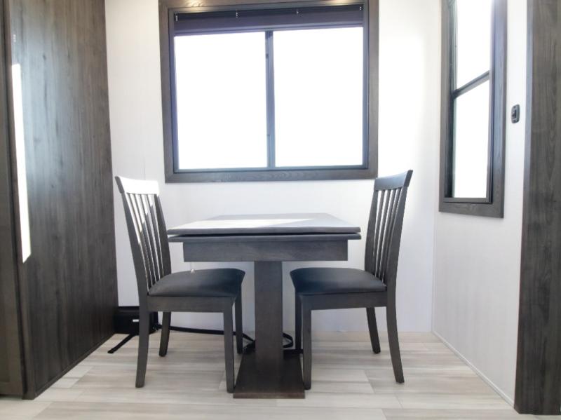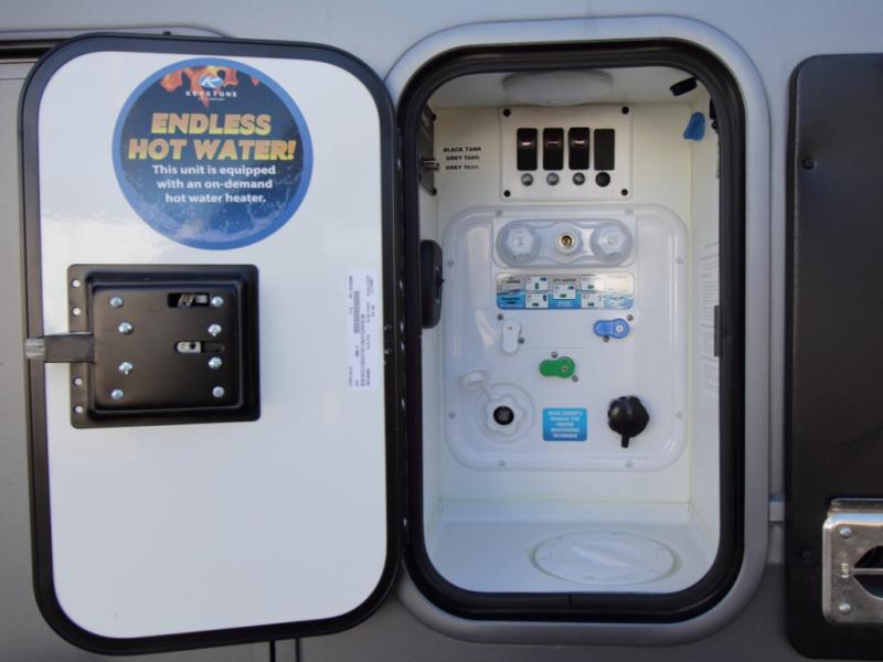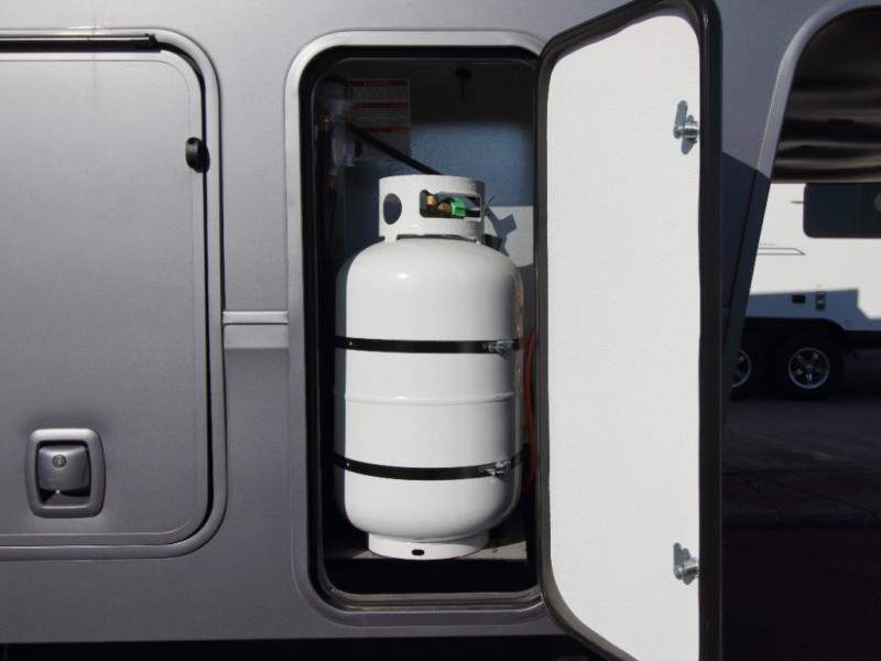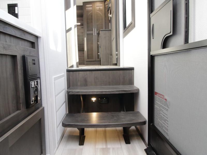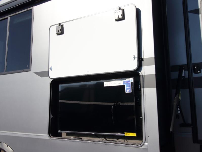 Inside, premium materials such as fiberglass-backed linoleum flooring, solid wood cabinet and drawer frames, extra-tall slide heights, and high ceilings with crown molding elevate the interior feel. Outside, you’ll appreciate three Girard cassette awnings for expanded outdoor living, tinted safety glass windows, a Titan hydraulic leveling system, and abundant exterior storage.