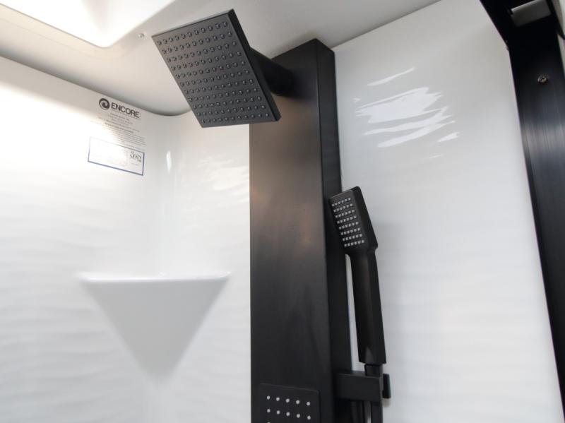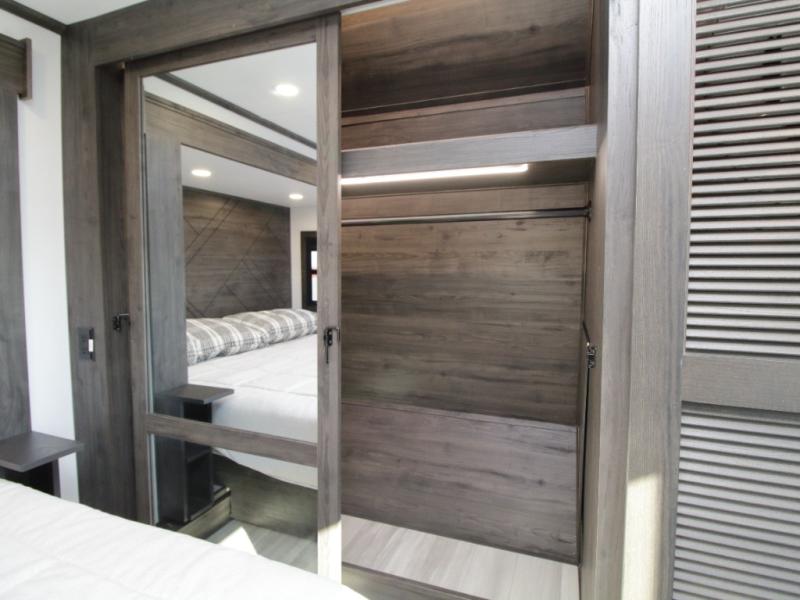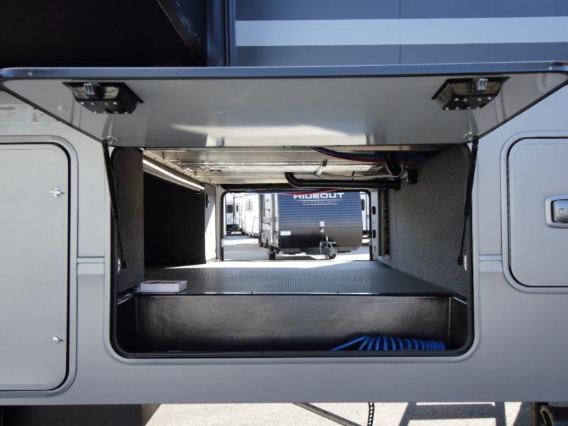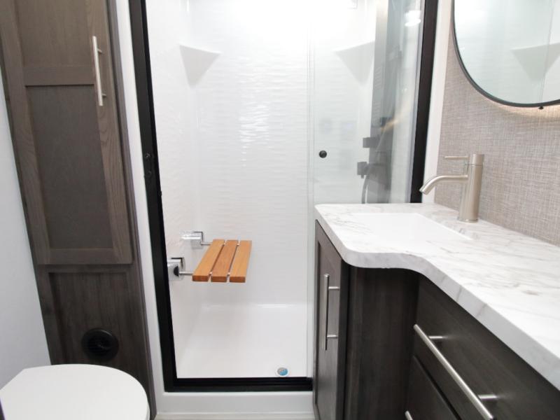 A full bathroom toward the front of the coach provides privacy and convenience, while the front master bedroom offers a true retreat. Here, you’ll find the exclusive Fuzion king bed, a large master closet, dresser with hidden storage, USB charging outlets, and washer and dryer prep for full-time or extended travel comfort.
