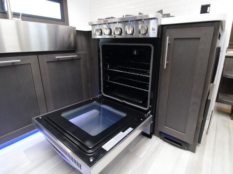 The main living area brings everyone together with a hide-a-bed sofa, theater seating, and a full entertainment center. An optional dinette table can be added for meals or game nights, while the open floorplan ensures plenty of room to move and unwind. The chef-ready kitchen features a U-shaped countertop, a four-burner range, ample prep space, and a residential refrigerator, making extended stays and entertaining effortless.