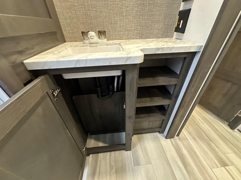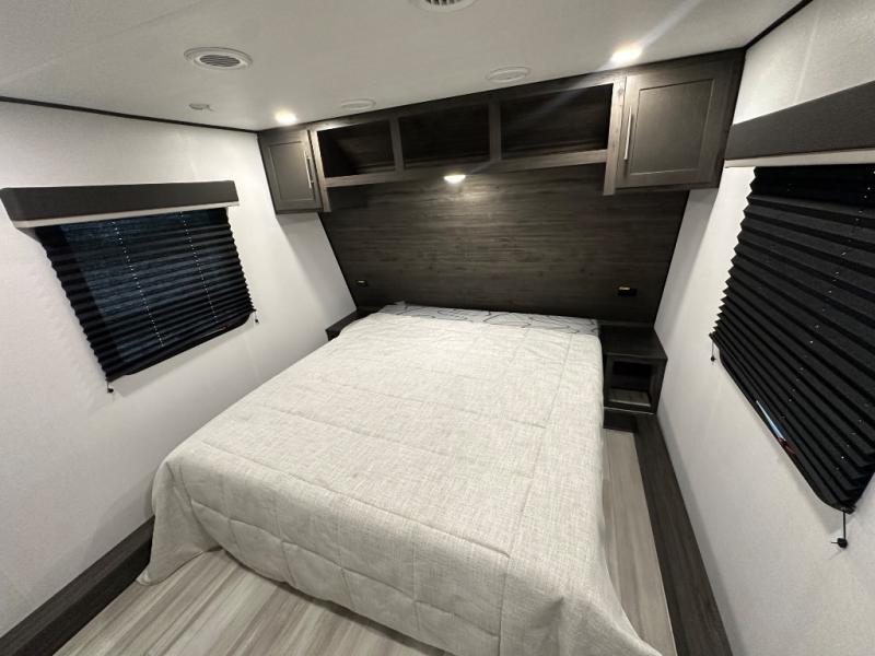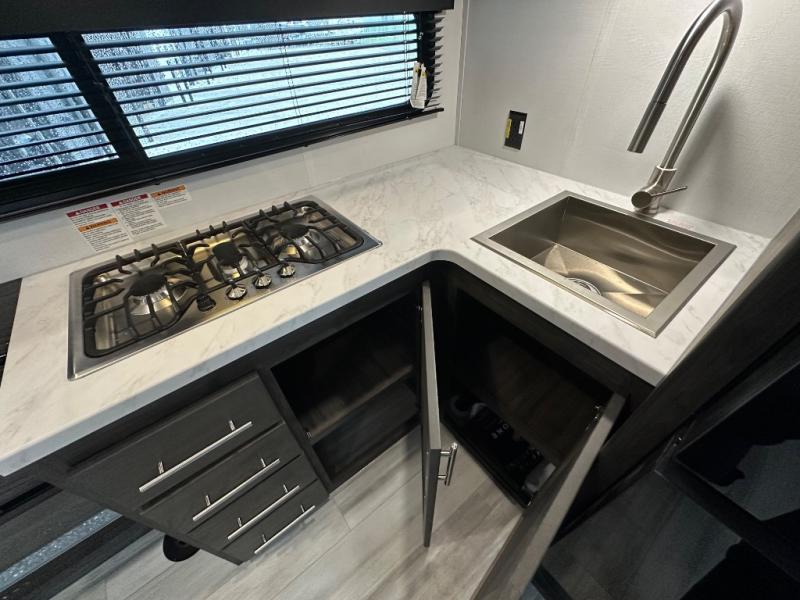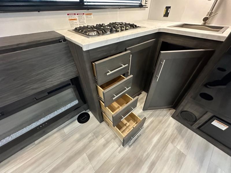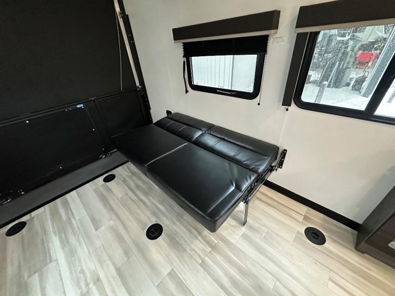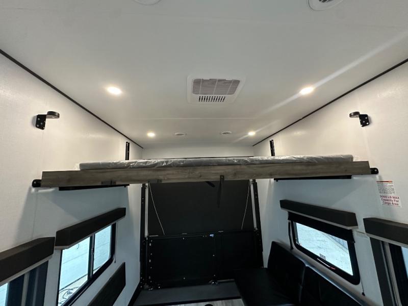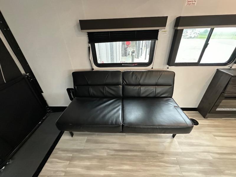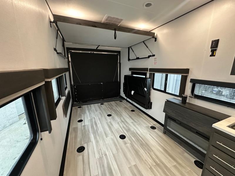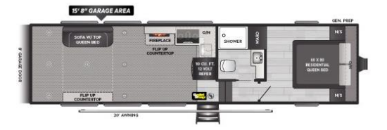 Grab your helmets and load up the dirt bikes for fun weekends in this toy hauler! There is a 15' 8" garage area with frame welded tie downs to keep your equipment secure, and once the toys are unloaded, you can relax here on the dual sofas with top queen bed. There is a a flip-up table along the curbside and opposite a HappiJack sofa with folding bed. The chef of your group will love the open concept living area and the ample counter space in the kitchen, and your whole crew will enjoy the TV for movie nights! You can clean up in the full bath before heading off to the front private bedroom where you'll find a Fuzion Queen bed,