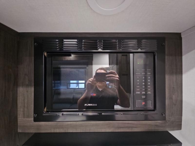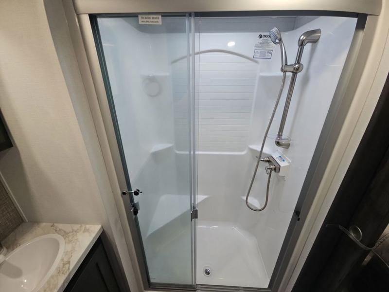 Fun with your toys is made easy with this 14' garage area toy hauler! Once the toys are unloaded, relax on the dual opposing sofas, or take a rest on the electric queen bed. The kids or guests can climb up into the loft that includes a bunk mat, and there is a half bath in the garage for added convenience. This model includes a peninsula countertop with plenty of space to prep meals and clean up, and there is a 16 cu. ft. 12V refrigerator for perishables. You'll find a residential shower with a seat in the dual entry bath, and the front bedroom will feel just like home with its Fuzion king bed and wardrobe slide for all your clothes.