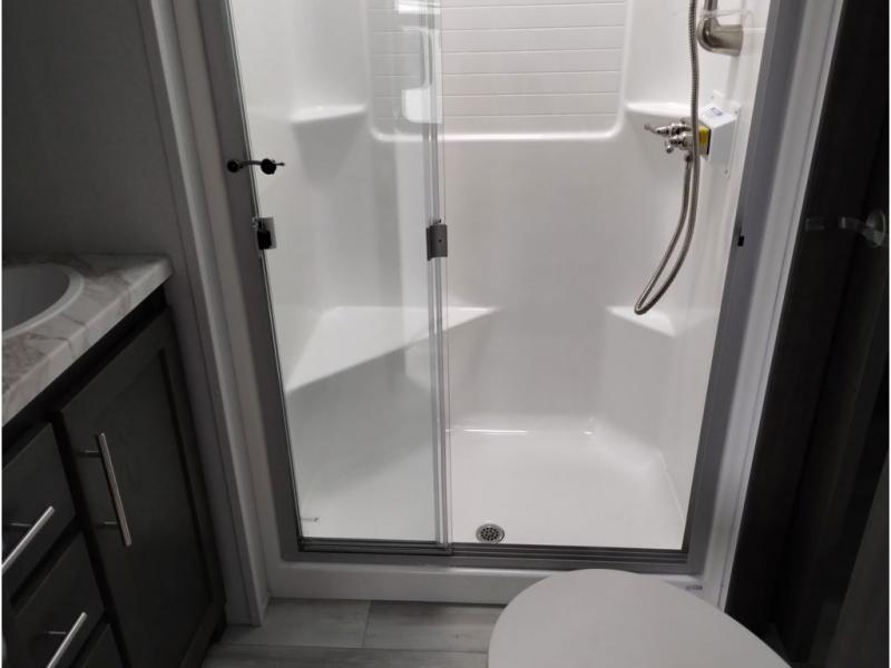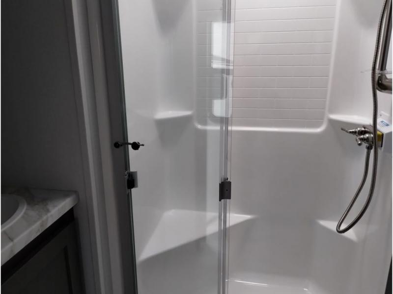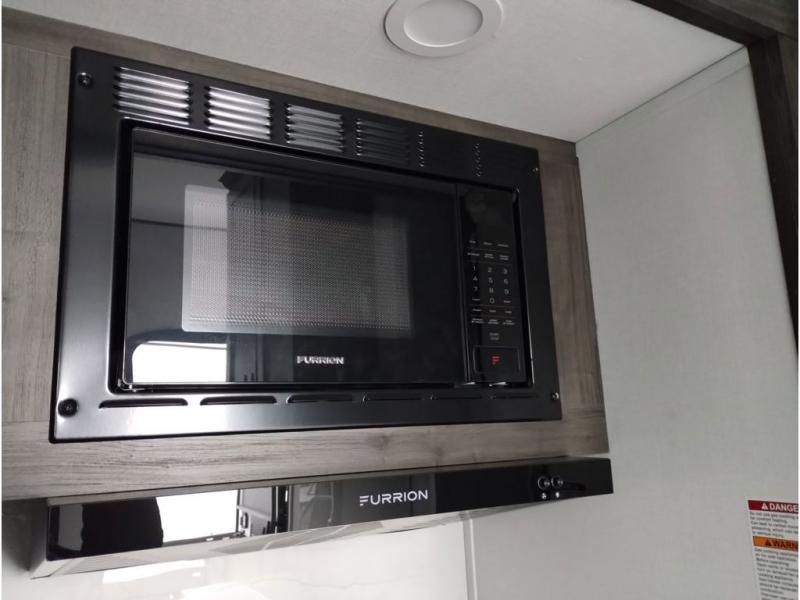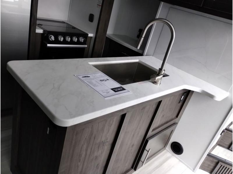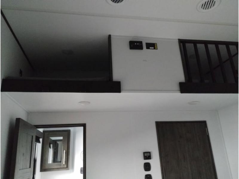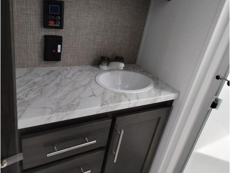 Fun with your toys is made easy with this 14' garage area toy hauler! Once the toys are unloaded, relax on the dual opposing sofas, or take a rest on the electric queen bed. The kids or guests can climb up into the loft that includes a bunk mat, and there is a half bath in the garage for added convenience. This model includes a peninsula countertop with plenty of space to prep meals and clean up, and there is a 16 cu. ft. 12V refrigerator for perishables. You'll find a residential shower with a seat in the dual entry bath, and the front bedroom will feel just like home with its Fuzion king bed and wardrobe slide for all your clothes.