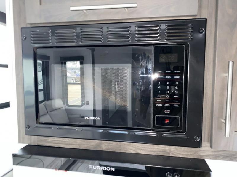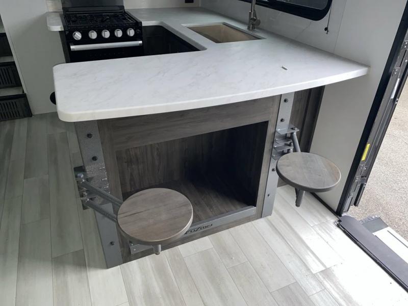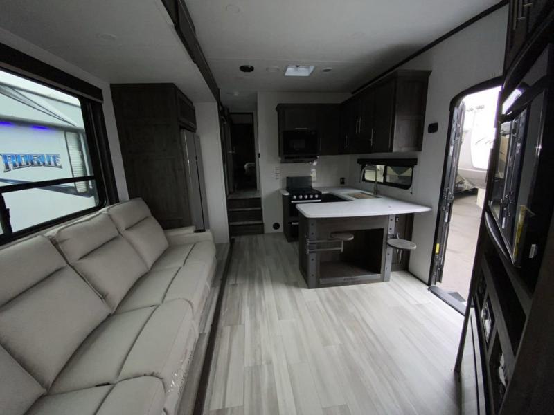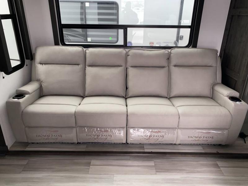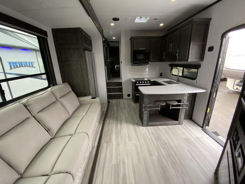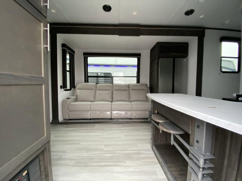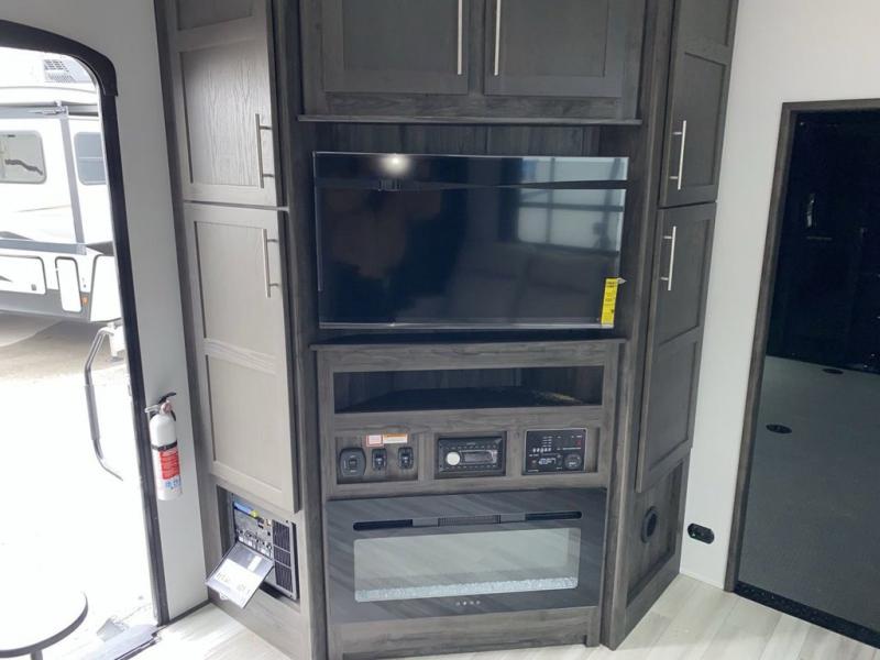 Looking for a triple axles, a separate garage and extra sleeping space for friends? This fifth wheel offers dual entry doors for a smooth flow of traffic, double slides for more interior floor space, and a 15' garage area for your toys as well as dining and sleeping space! The U-shaped kitchen countertop includes exclusive swing-out bar stools where two can eat at, plus there are three pantries for all the dry goods and snacks. The dual entry bath will create a front master suite that will feel just like home, and there is a convenient half bath in the garage that will be handy during the day and night. This fifth wheel also includes an LED TV and a fireplace for inside entertainment.