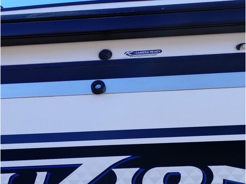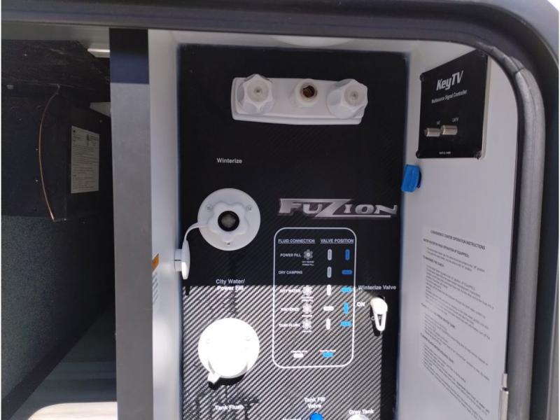 Embrace the great outdoors with a Fuzion Impact Edition toy hauler by Keystone! There are laminated fiberglass sidewalls and a 8' 4" wide-body construction for your toys and gear! The one-piece polypropylene heated underbelly includes enclosed tanks and valves which will help extend your camping season, and the leaf spring suspension system will provide smooth towing. Head inside to enjoy night shades, hardwood cabinetry, and fiberglass backed linoleum floor with no carpet for easy cleaning. Each model also includes a Girard on-demand water heater, two 30 lb. LP tanks, recessed LED puck lighting throughout, and the list of comforts goes on!
