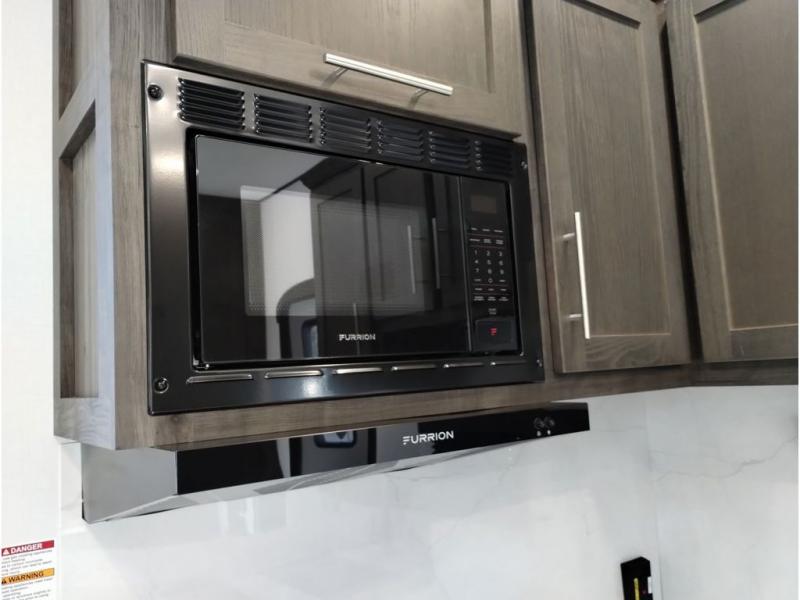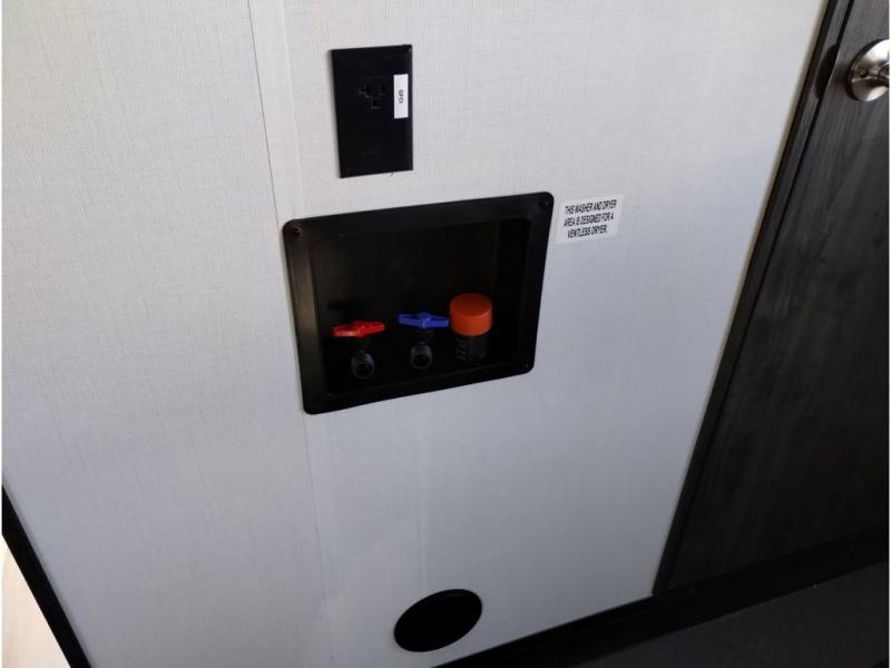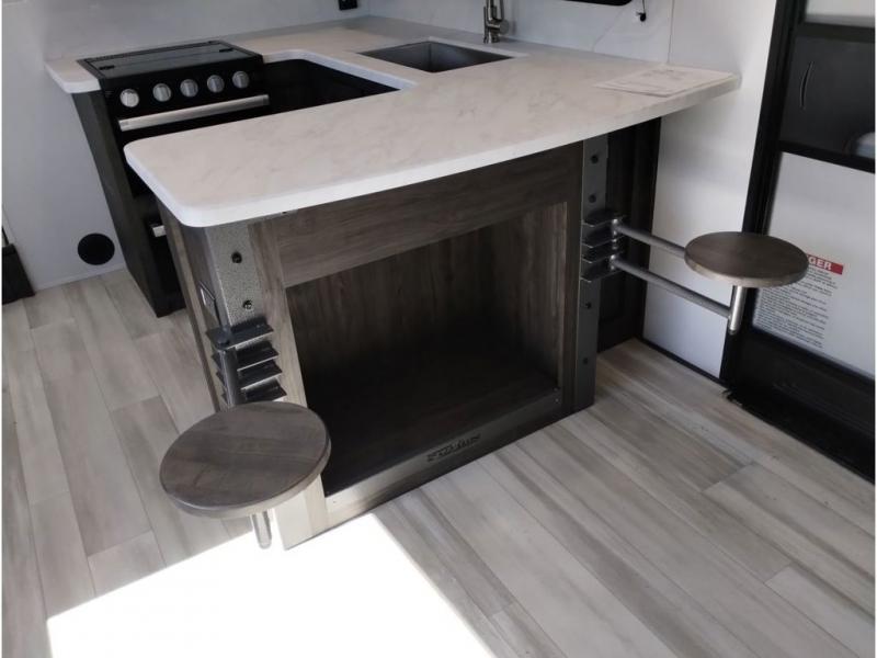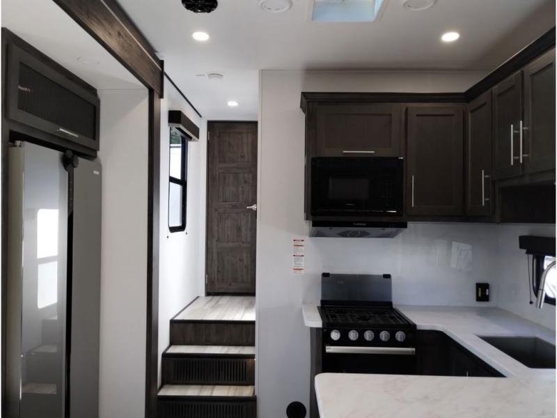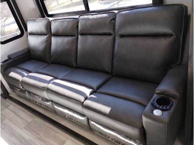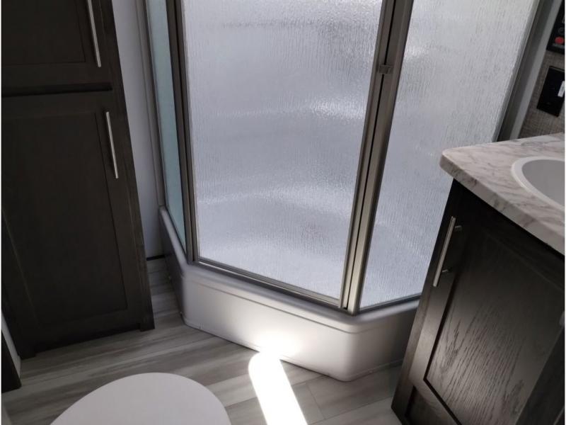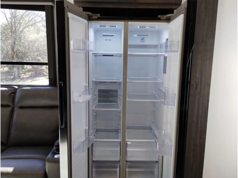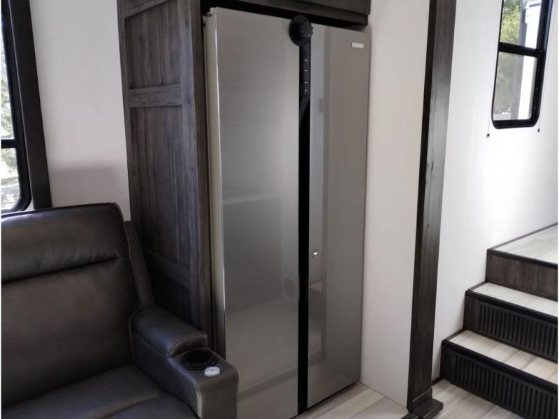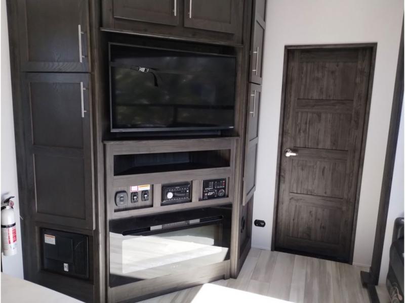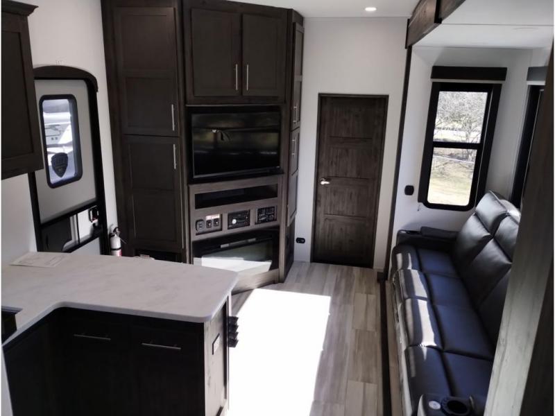 Looking for a triple axles, a separate garage and extra sleeping space for friends? This fifth wheel offers dual entry doors for a smooth flow of traffic, double slides for more interior floor space, and a 15' garage area for your toys as well as dining and sleeping space! The U-shaped kitchen countertop includes exclusive swing-out bar stools where two can eat at, plus there are three pantries for all the dry goods and snacks. The dual entry bath will create a front master suite that will feel just like home, and there is a convenient half bath in the garage that will be handy during the day and night. This fifth wheel also includes an LED TV and a fireplace for inside entertainment.