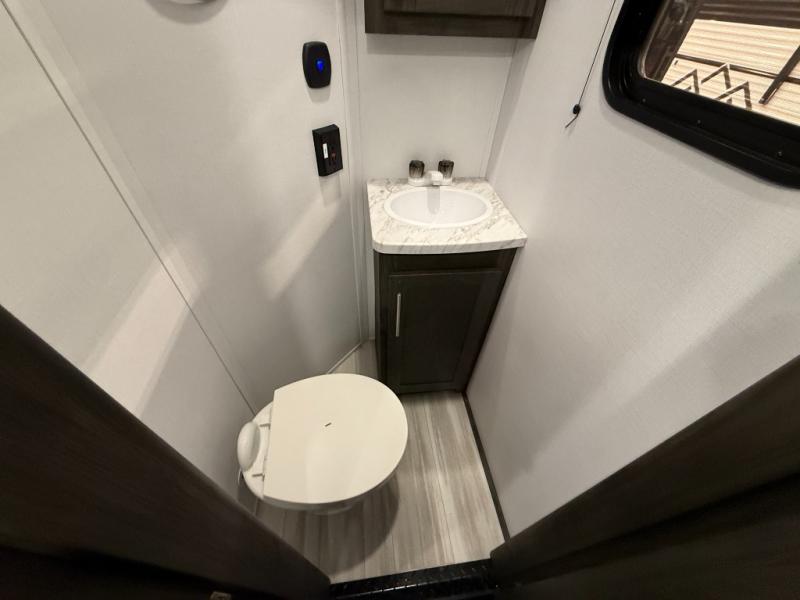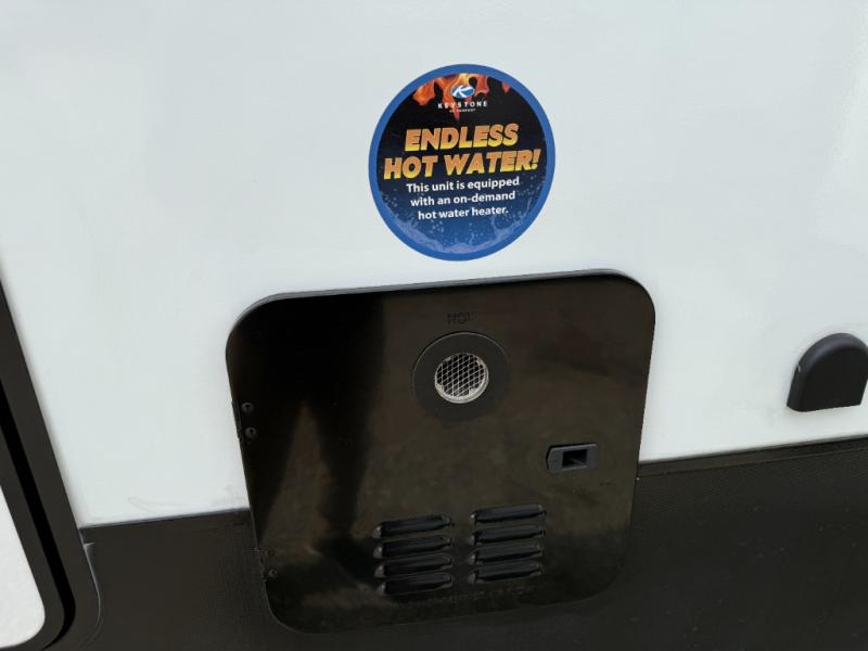 Embrace the great outdoors with a Fuzion Impact Edition toy hauler by Keystone! There are laminated fiberglass sidewalls and a 8' 4" wide-body construction for your toys and gear! The one-piece polypropylene heated underbelly includes enclosed tanks and valves which will help extend your camping season, and the leaf spring suspension system will provide smooth towing. Head inside to enjoy night shades, hardwood cabinetry, and fiberglass backed linoleum floor with no carpet for easy cleaning. Each model also includes a Girard on-demand water heater, two 30 lb. LP tanks, recessed LED puck lighting throughout, and the list of comforts goes on!