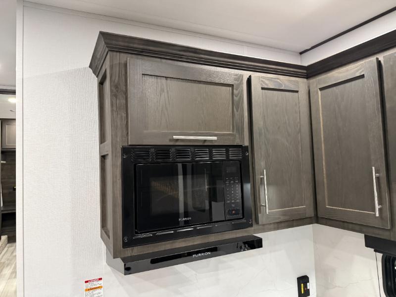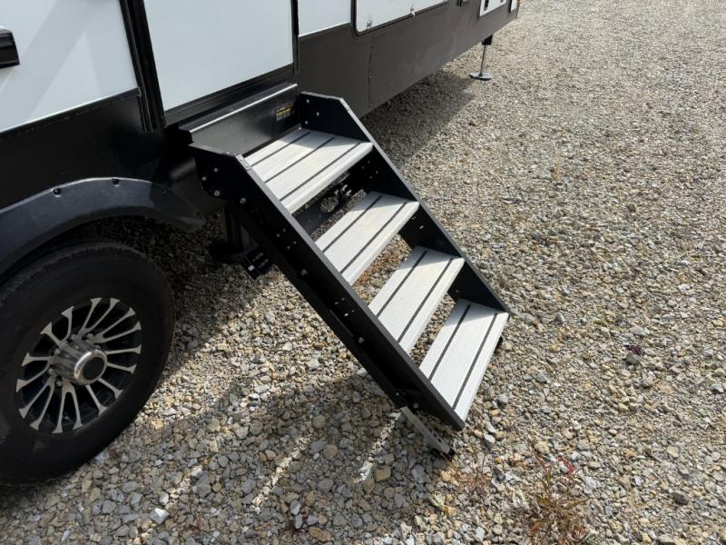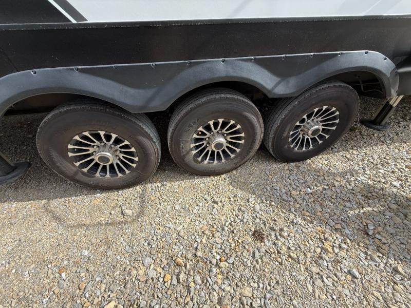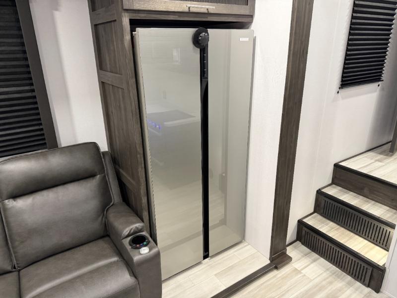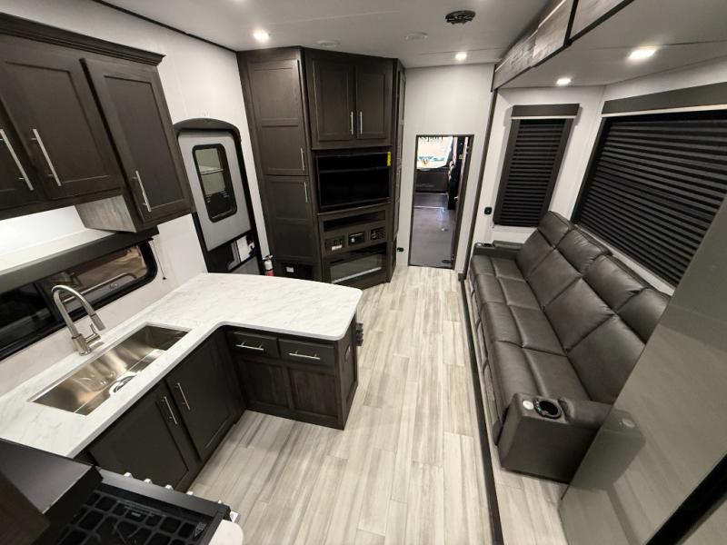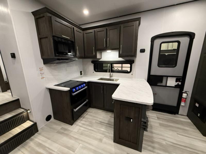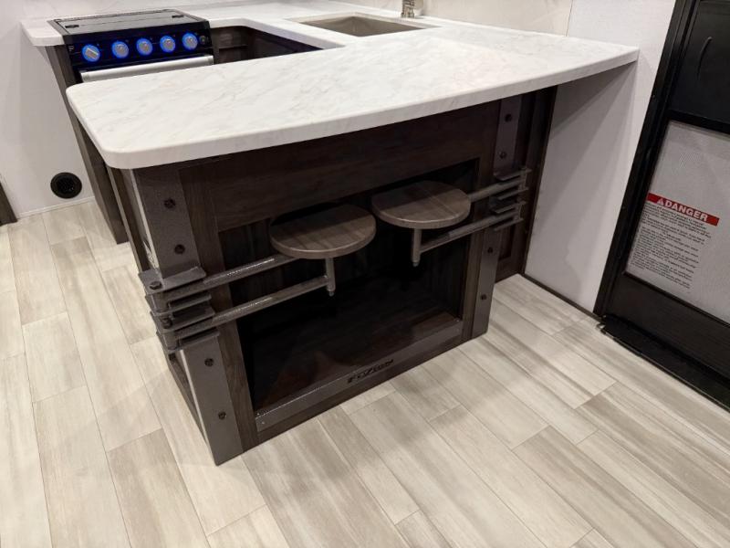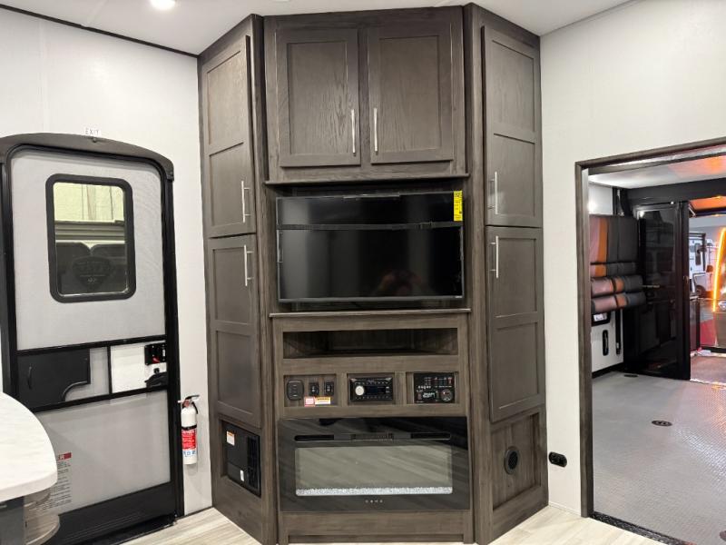 Looking for a triple axles, a separate garage and extra sleeping space for friends? This fifth wheel offers dual entry doors for a smooth flow of traffic, double slides for more interior floor space, and a 15' garage area for your toys as well as dining and sleeping space! The U-shaped kitchen countertop includes exclusive swing-out bar stools where two can eat at, plus there are three pantries for all the dry goods and snacks. The dual entry bath will create a front master suite that will feel just like home, and there is a convenient half bath in the garage that will be handy during the day and night. This fifth wheel also includes an LED TV and a fireplace for inside entertainment.