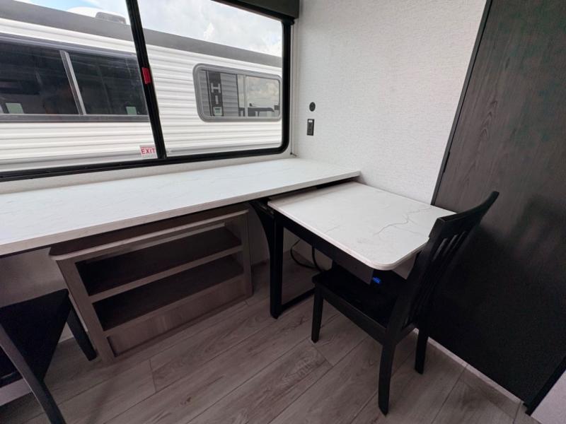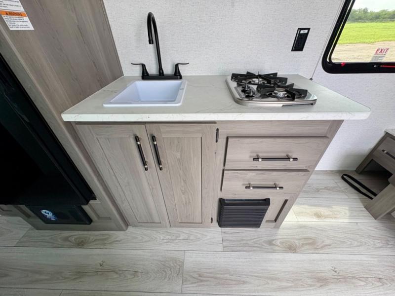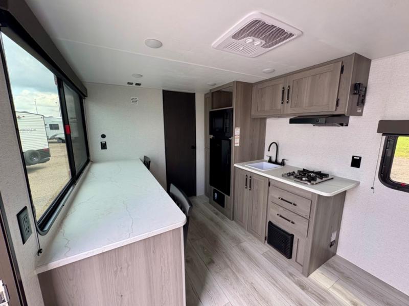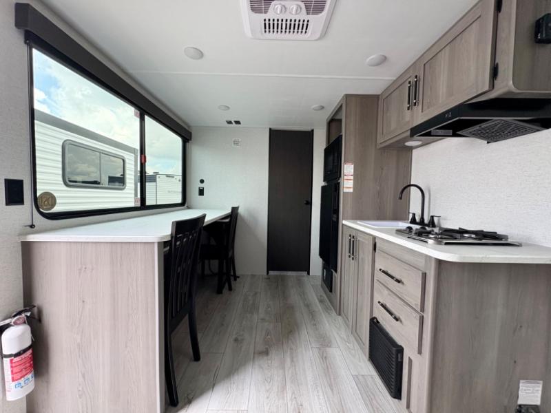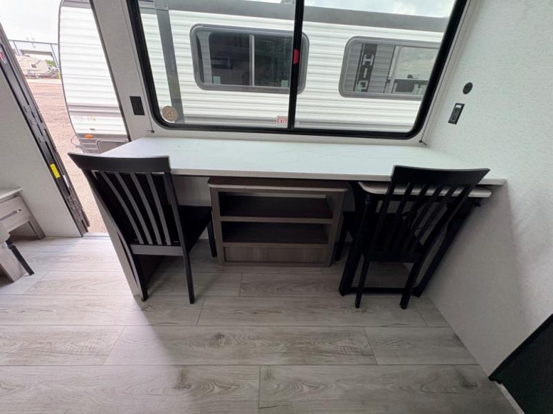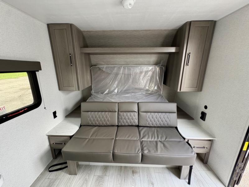 You'll love how versatile this travel trailer is since you can sleep on the Murphy bed at night and enjoy the fold-down sofa during the day! There are dual wardrobes and nightstands on either side of the bed for your things, and larger camp gear can go outside in the pass-thru storage. A full kitchen with a two burner cooktop and 3.3 cu. ft. 12V refrigerator will let the chef whip up their best meals, and the desk area with two chairs provides a place to dine and work. And don't overlook the spacious full rear bath!