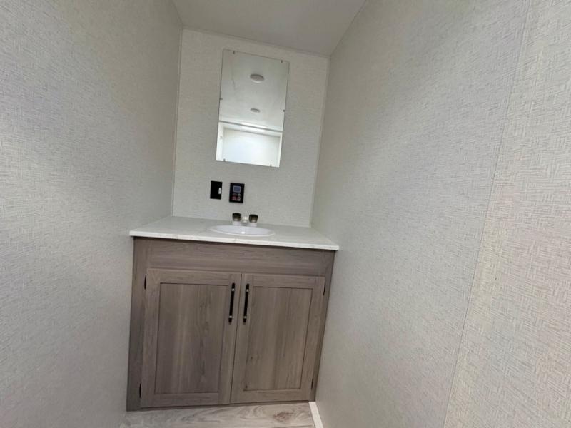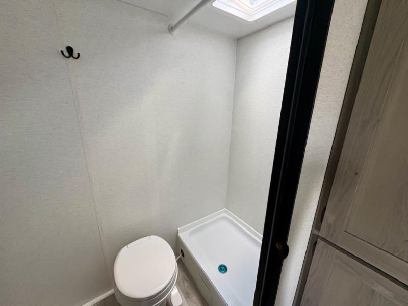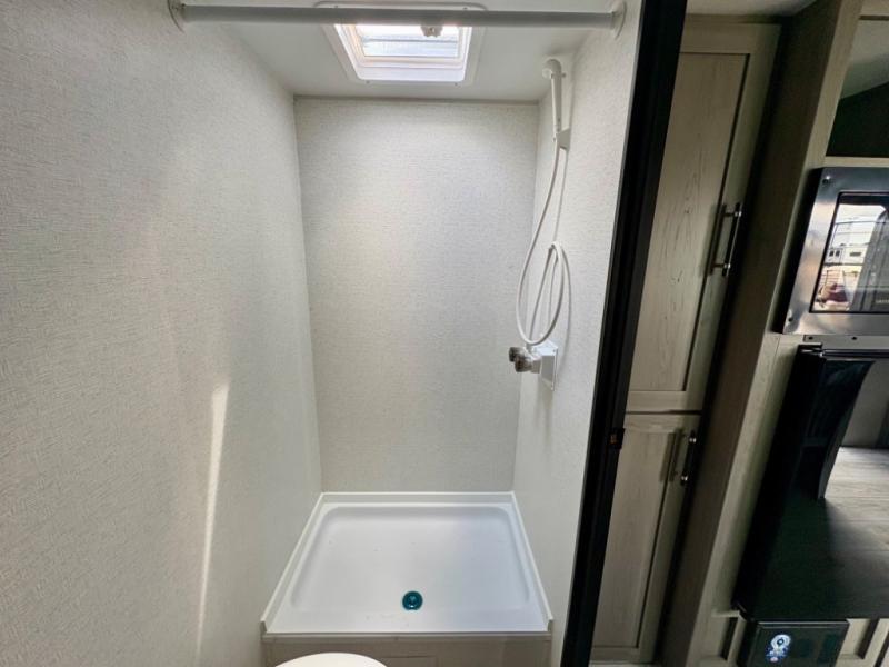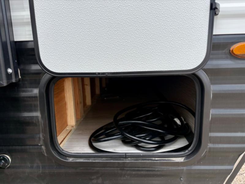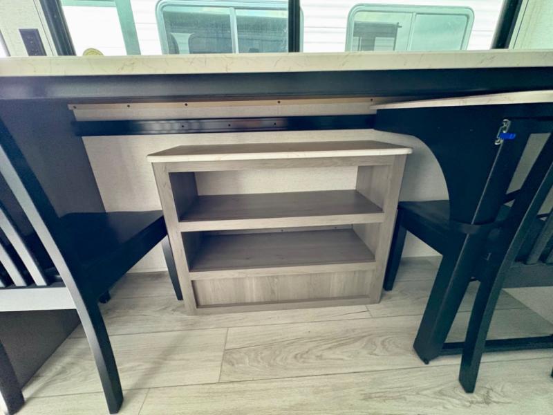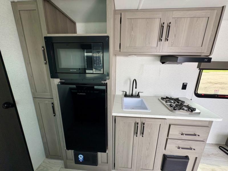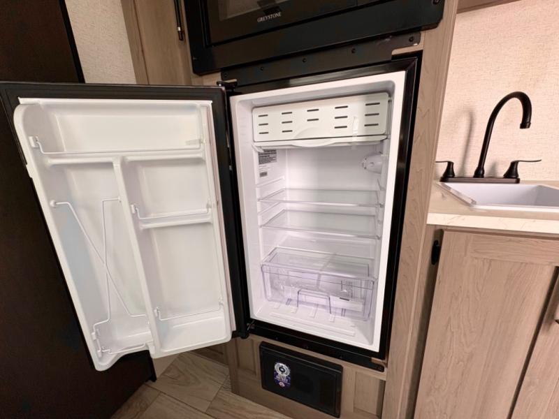 You'll love how versatile this travel trailer is since you can sleep on the Murphy bed at night and enjoy the fold-down sofa during the day! There are dual wardrobes and nightstands on either side of the bed for your things, and larger camp gear can go outside in the pass-thru storage. A full kitchen with a two burner cooktop and 3.3 cu. ft. 12V refrigerator will let the chef whip up their best meals, and the desk area with two chairs provides a place to dine and work. And don't overlook the spacious full rear bath!