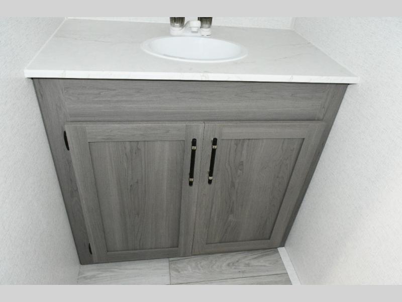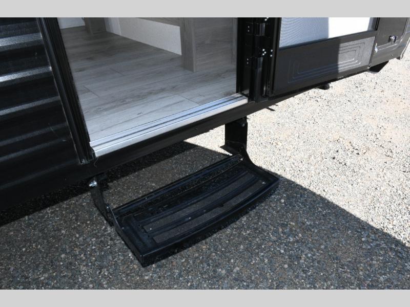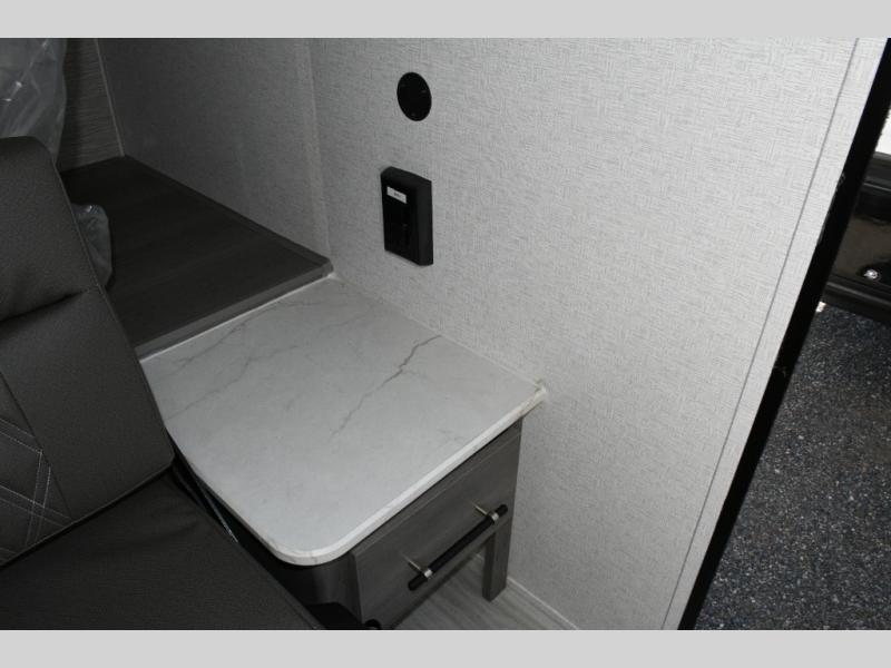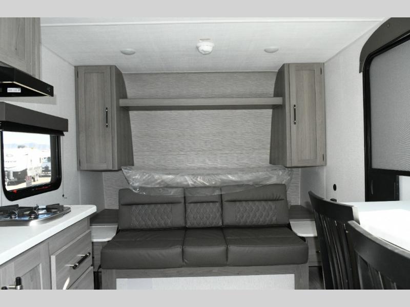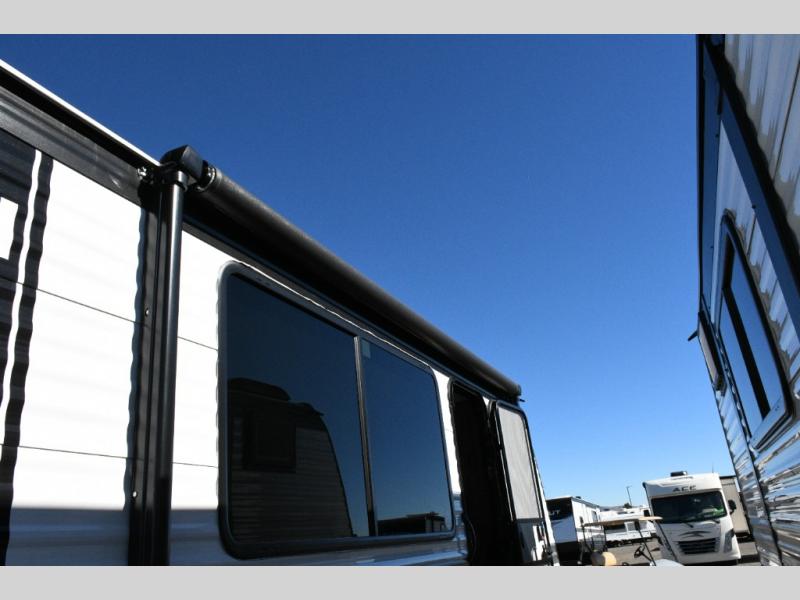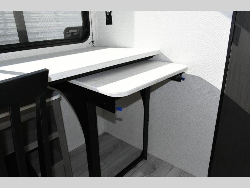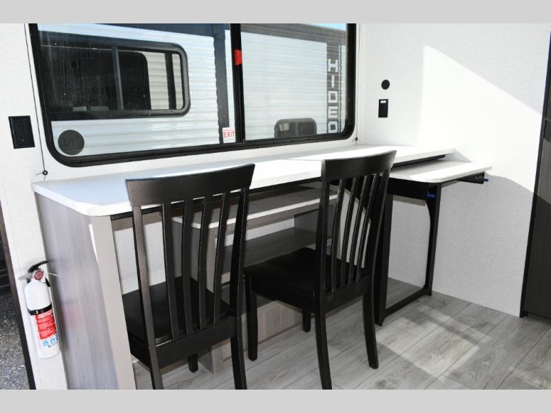 The fully equipped kitchen features a two-burner cooktop, 3.3 cu. ft. 12V refrigerator, and pantry storage, giving you everything you need to prepare meals on the road. The desk area with two chairs doubles as a dining spot or workspace, perfect for flexible living. Outside, a 12' power awning creates shaded outdoor living space, and the pass-through storage accommodates larger gear and camping essentials.