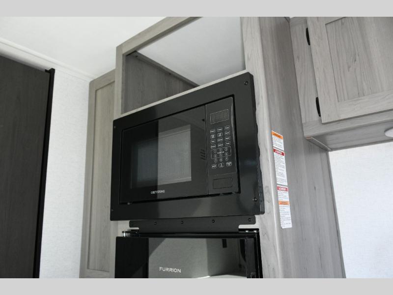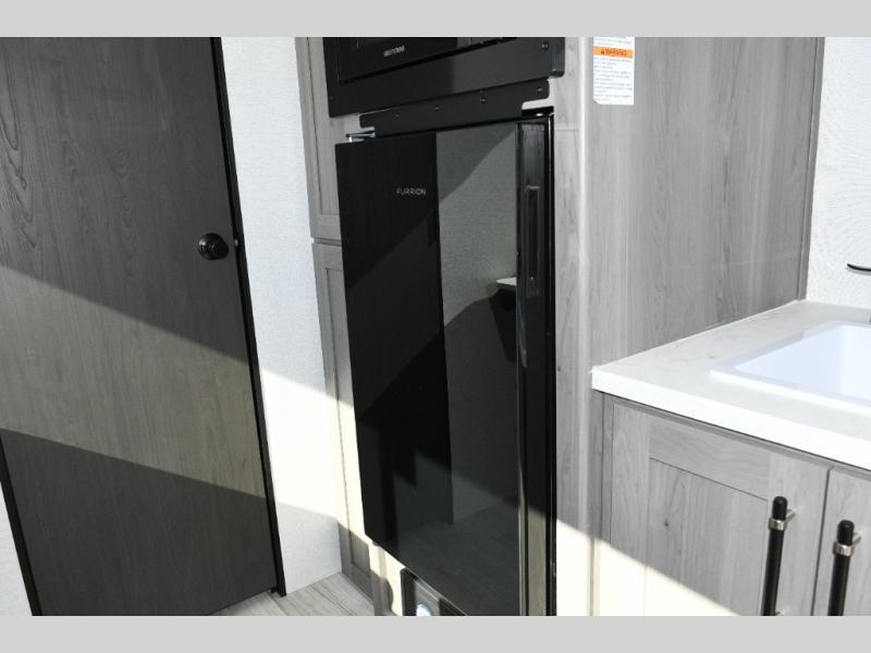 The fully equipped kitchen features a two-burner cooktop, 3.3 cu. ft. 12V refrigerator, and pantry storage.