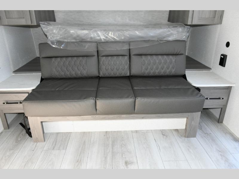 Inside, the queen Murphy bed transforms your sleeping space into a comfortable living area during the day, while the fold-down sofa offers additional seating for relaxing or entertaining. Nightstands and dual wardrobes flank the bed, providing practical storage for clothing and personal items. A full rear bath ensures privacy and comfort, even on longer trips.