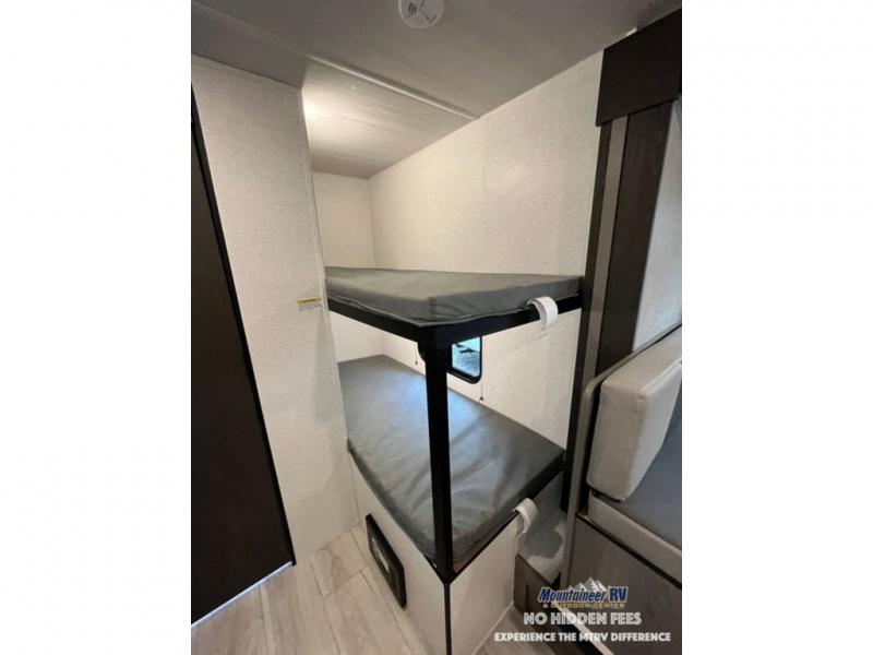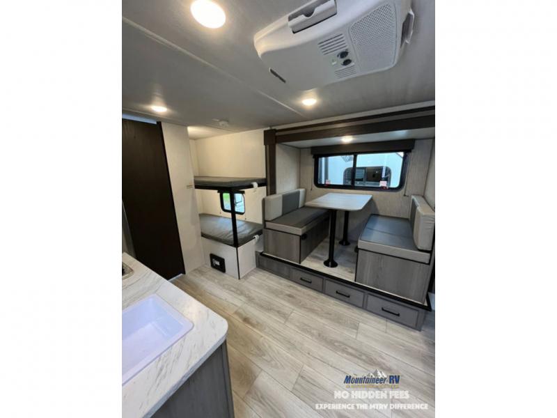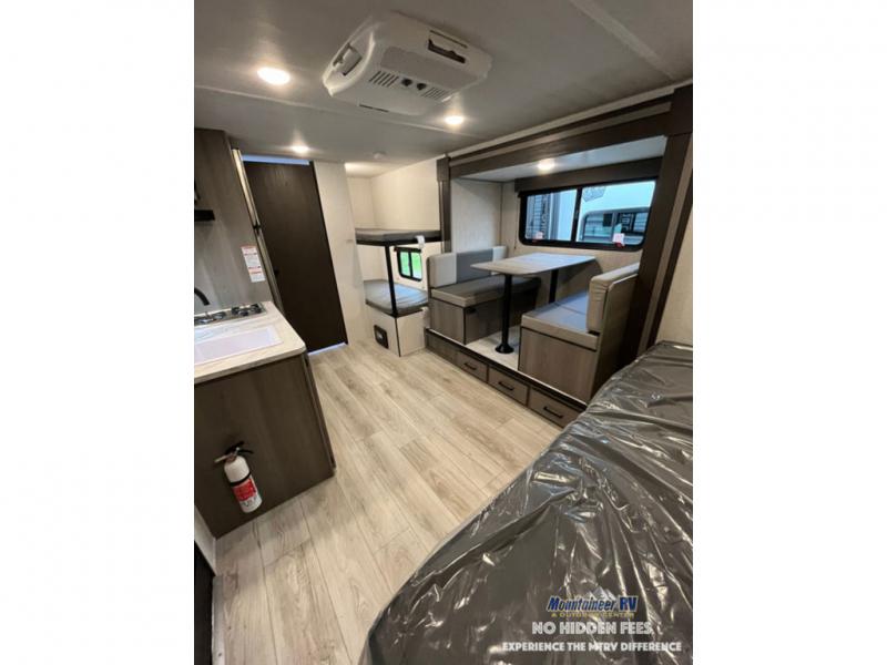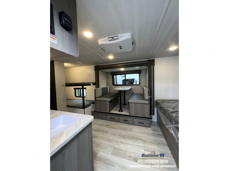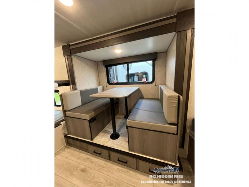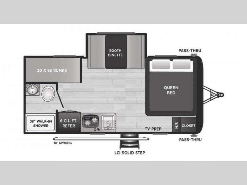 Step Inside this trailer where you can dine and relax on the slide out booth dinette which offers storage drawers below for your things. Everyone can take turns getting cleaned up in the full bathroom before falling asleep on the bunks, the queen-size bed or the booth dinette. The chef of your group will have a two burner cooktop to prepare meals and a 7.7 cu. ft. refrigerator for food storage. And the 10' power awning offers an outdoor living area protected from the elements once you add your camping chairs taken from the pass-through compartment.