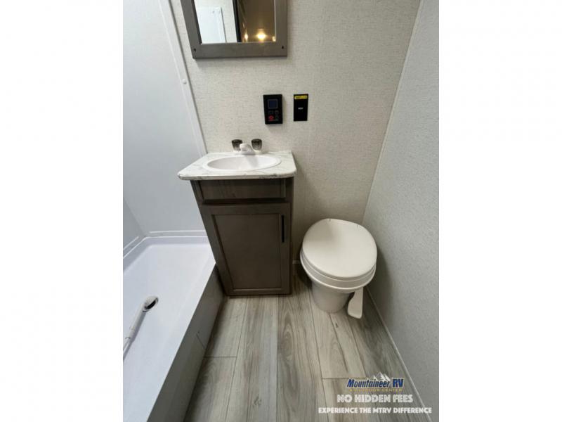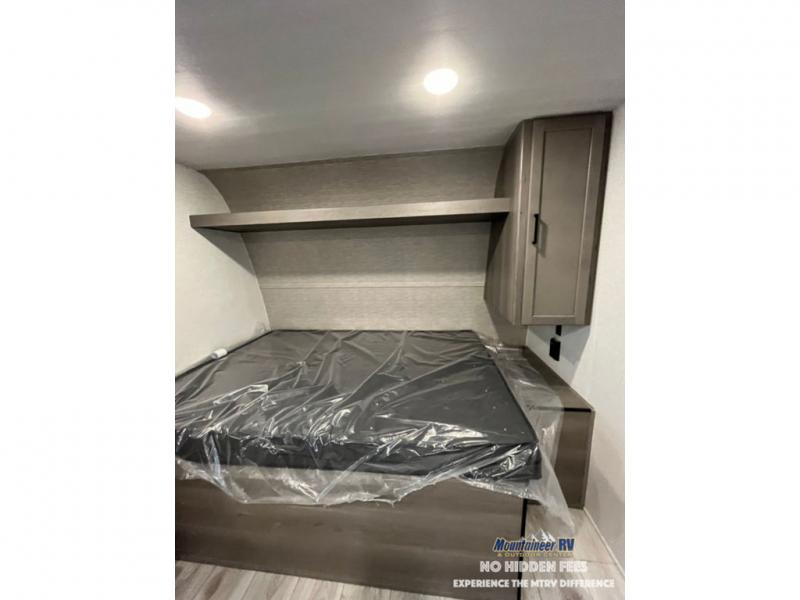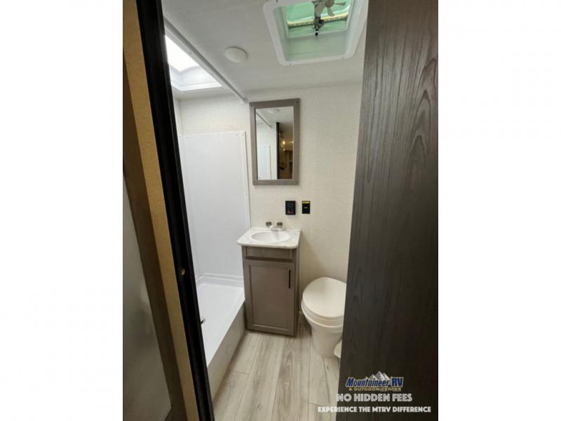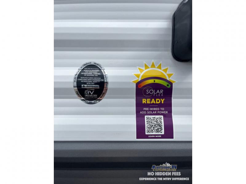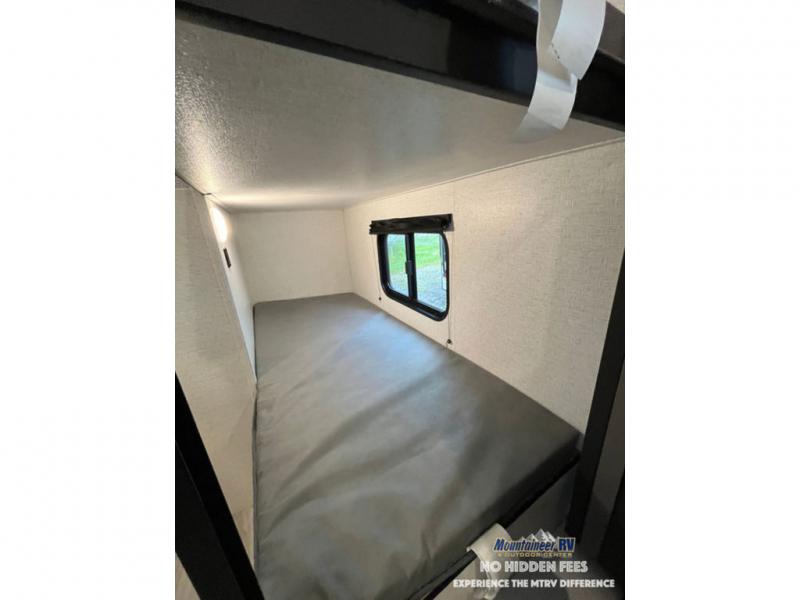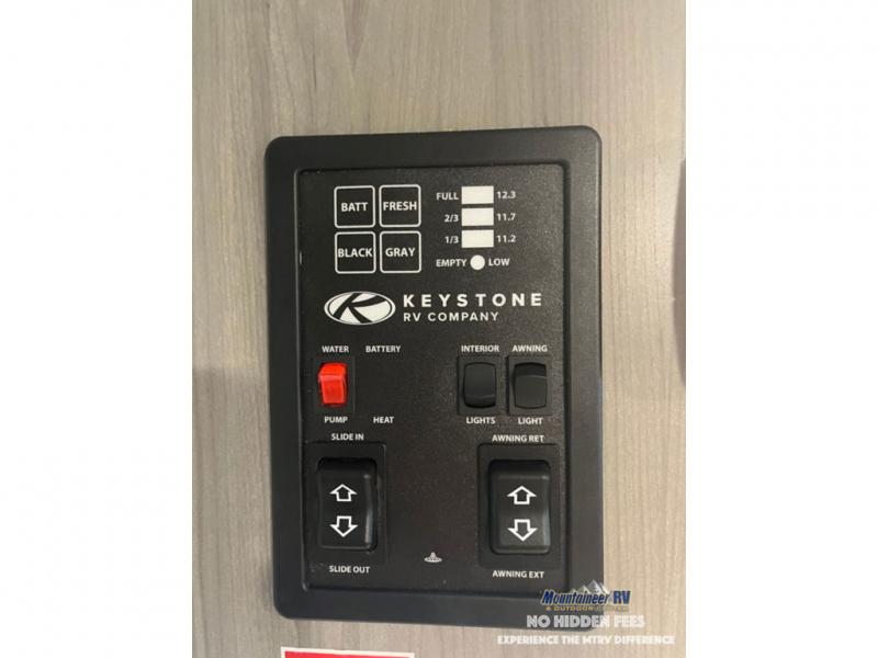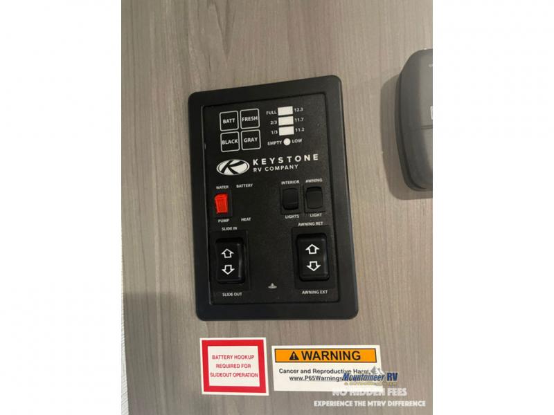 Step Inside this trailer where you can dine and relax on the slide out booth dinette which offers storage drawers below for your things. Everyone can take turns getting cleaned up in the full bathroom before falling asleep on the bunks, the queen-size bed or the booth dinette. The chef of your group will have a two burner cooktop to prepare meals and a 7.7 cu. ft. refrigerator for food storage. And the 10' power awning offers an outdoor living area protected from the elements once you add your camping chairs taken from the pass-through compartment.