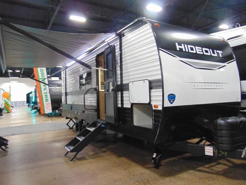 The Keystone Hideout travel trailers will be just what the doctor ordered for a stress-free holiday at your favorite campsite! There are a few exclusive features that you'll only find on a Keystone product, like the in-floor heating ducts and the Tru-fit™ slide construction. Each model has a power awning for some shade in the afternoon, and the tinted safety glass windows will prevent the harmful UV rays from getting inside. You'll also have blackout night shades that you can close when you want privacy and one-piece pressed countertops that are not only sleek looking, but easy to keep clean.
