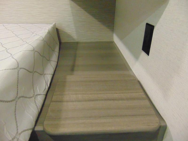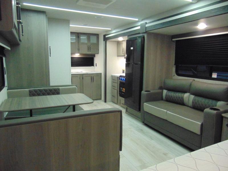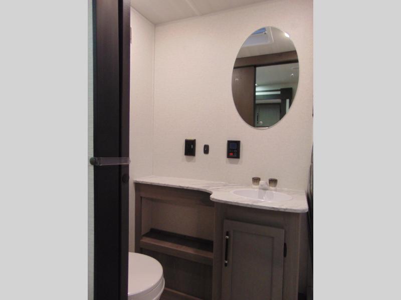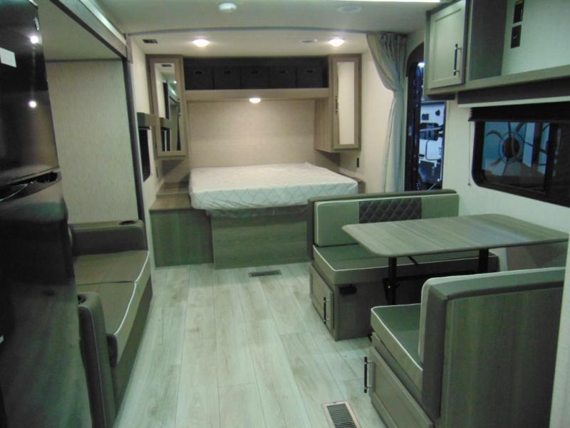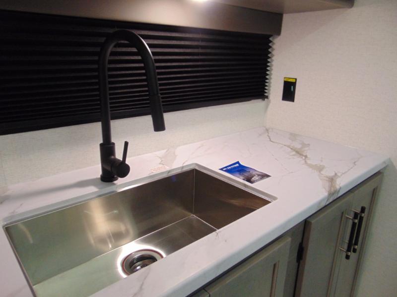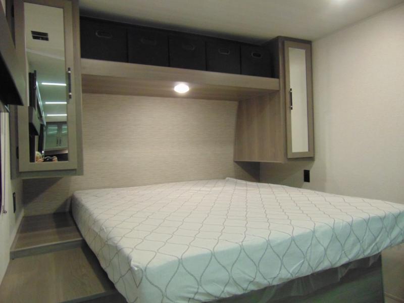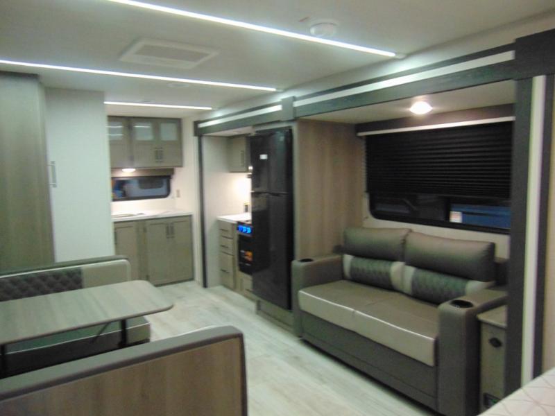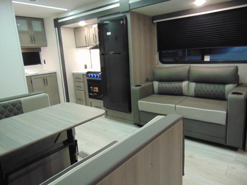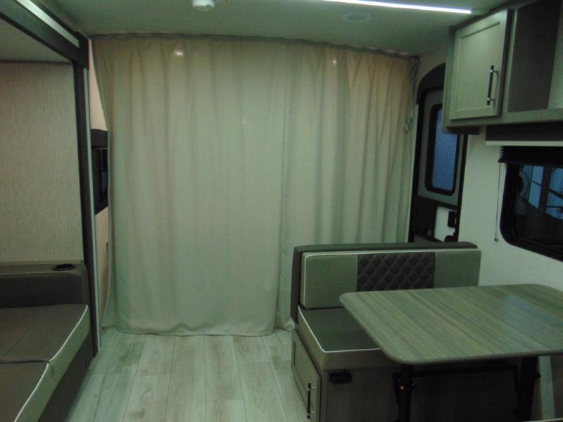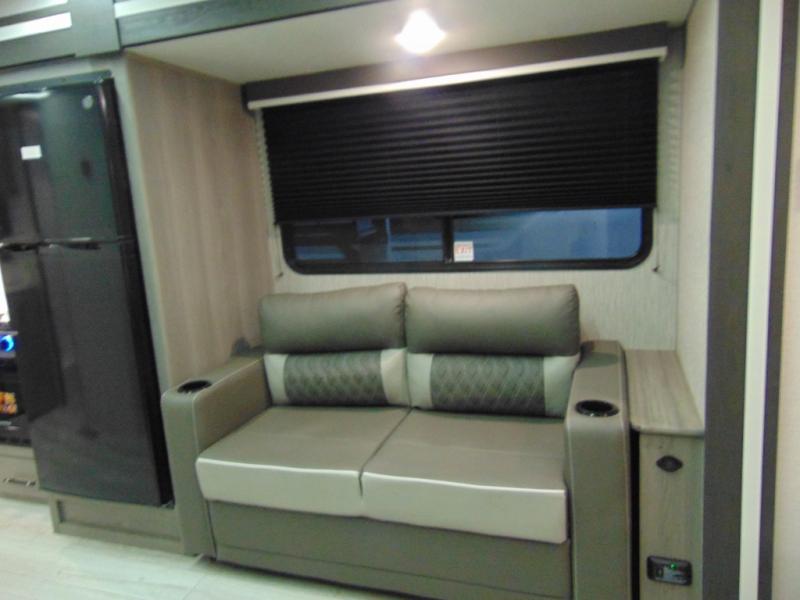 You'll love the added interior space this model has to offer thanks to the large slide out in the main living area. Here, you'll find the standard sofa, the three burner gas range, and the 10 cu. ft. refrigerator. If you're needing a different seating space, just trade out the sofa for the optional theater seat or optional tri-fold sofa! There is a large countertop in the back of this unit that houses the stainless steel sink, and the rear corner bath includes a spacious shower for convenience. You will love having your own space up front in the semi-private bedroom that includes a queen bed, dual closets and nightstands, plus a privacy curtain. There is even a laundry chute so you can throw dirty clothes straight to the pass-through storage!
