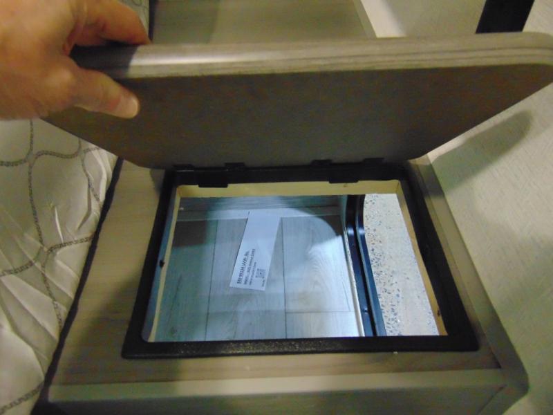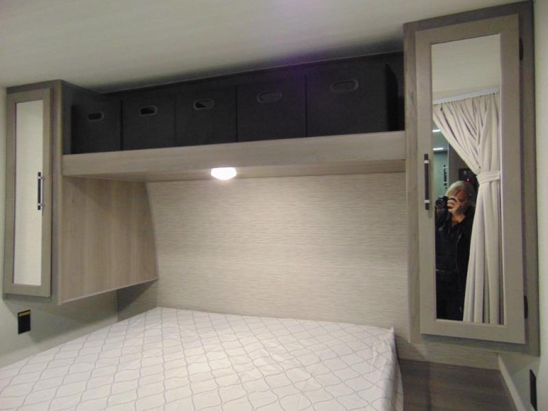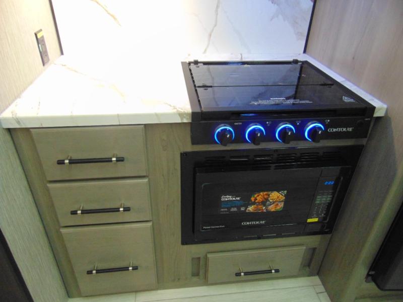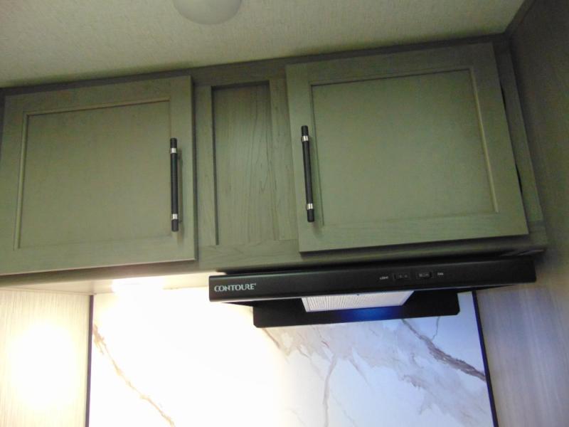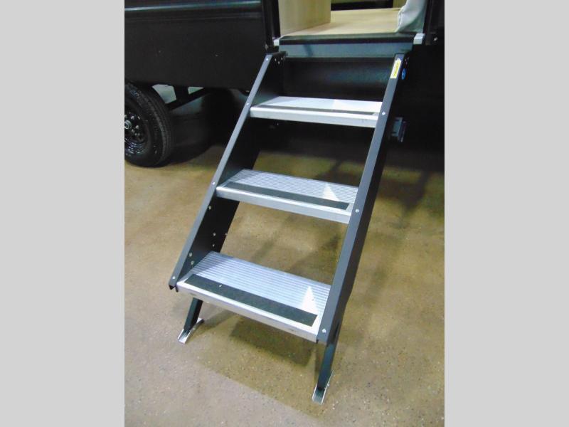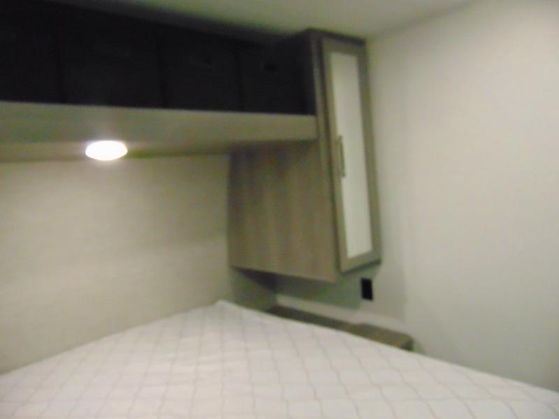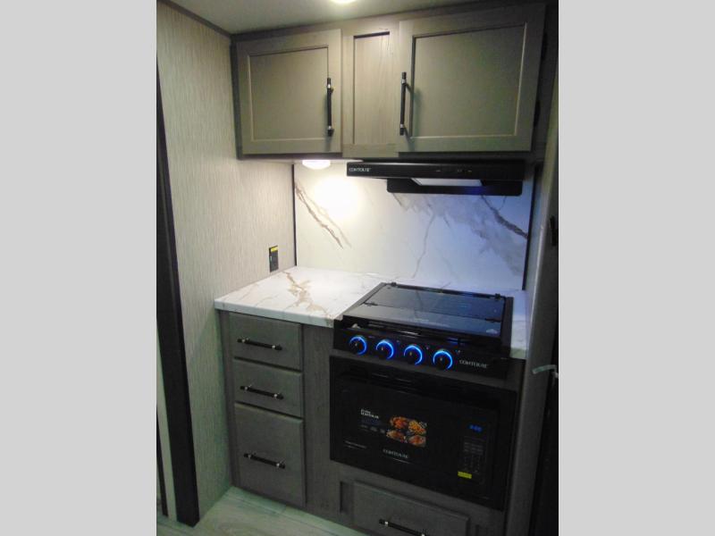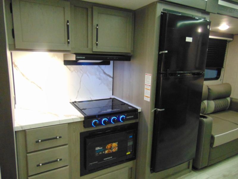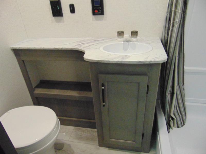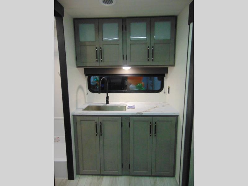 You'll love the added interior space this model has to offer thanks to the large slide out in the main living area. Here, you'll find the standard sofa, the three burner gas range, and the 10 cu. ft. refrigerator. If you're needing a different seating space, just trade out the sofa for the optional theater seat or optional tri-fold sofa! There is a large countertop in the back of this unit that houses the stainless steel sink, and the rear corner bath includes a spacious shower for convenience. You will love having your own space up front in the semi-private bedroom that includes a queen bed, dual closets and nightstands, plus a privacy curtain. There is even a laundry chute so you can throw dirty clothes straight to the pass-through storage!