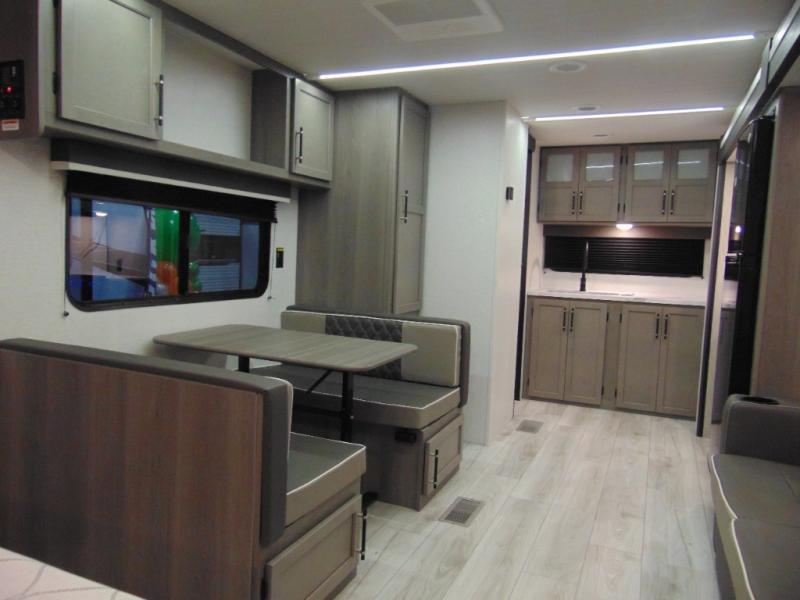 REAR KITCHEN--FRONT QUEEN--SLEEPER DINETTE across from SLIDEOUT with THEATER SEATING