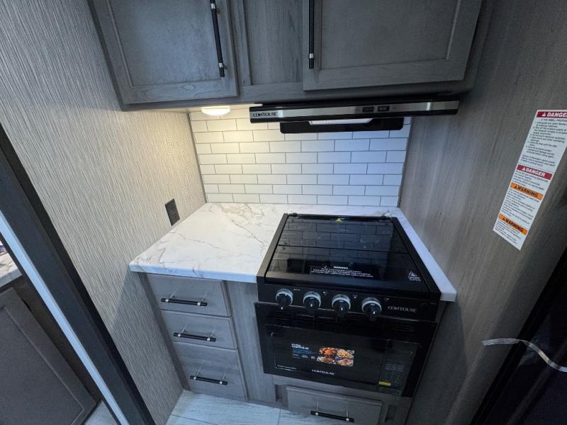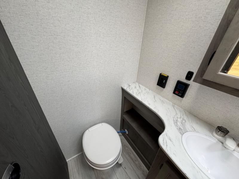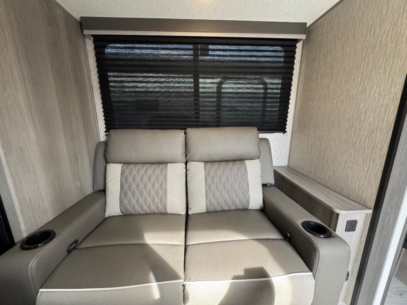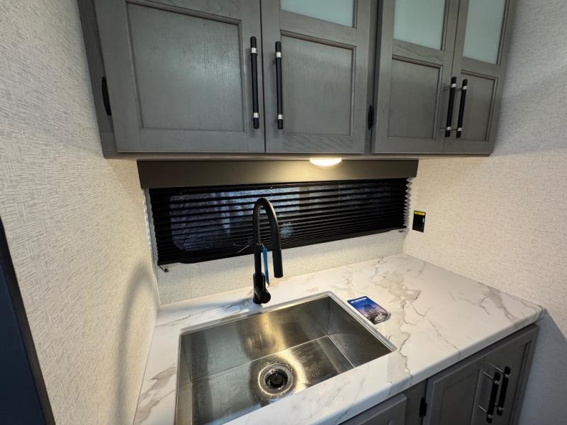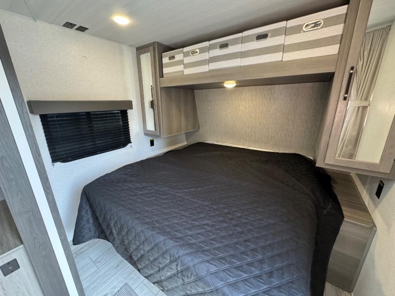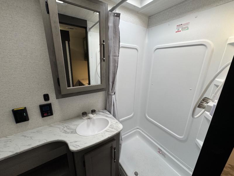 You'll love the added interior space this model has to offer thanks to the large slide out in the main living area. Here, you'll find the tri-fold sofa, the three burner gas range, and the 10 cu. ft. refrigerator. There is a large countertop in the back of this unit that houses the stainless steel sink, and the rear corner bath includes a spacious shower for convenience. You will love having your own space up front in the semi-private bedroom that includes a queen bed, dual closets and nightstands, plus a privacy curtain. There is even a laundry chute so you can throw dirty clothes straight to the pass-through storage!