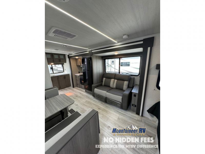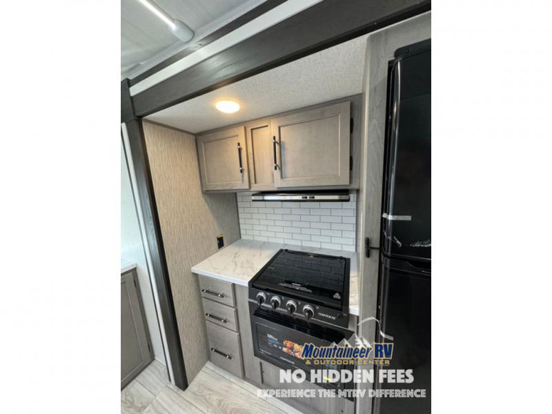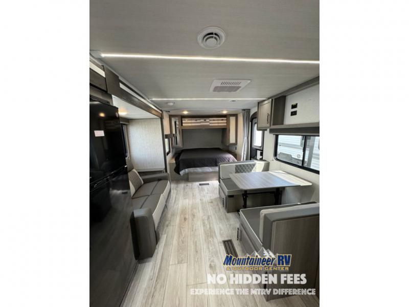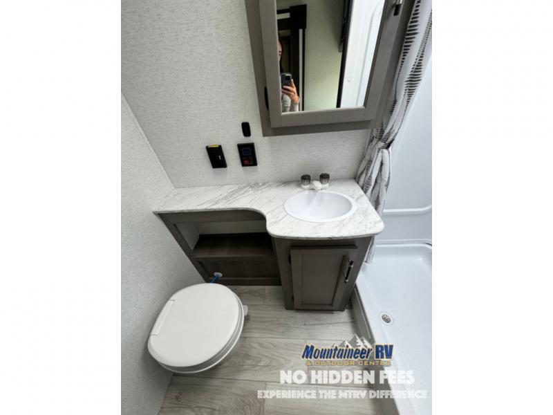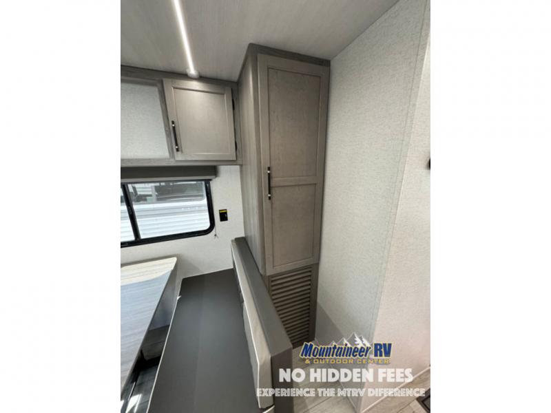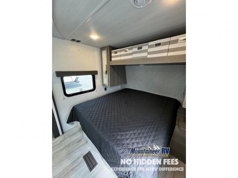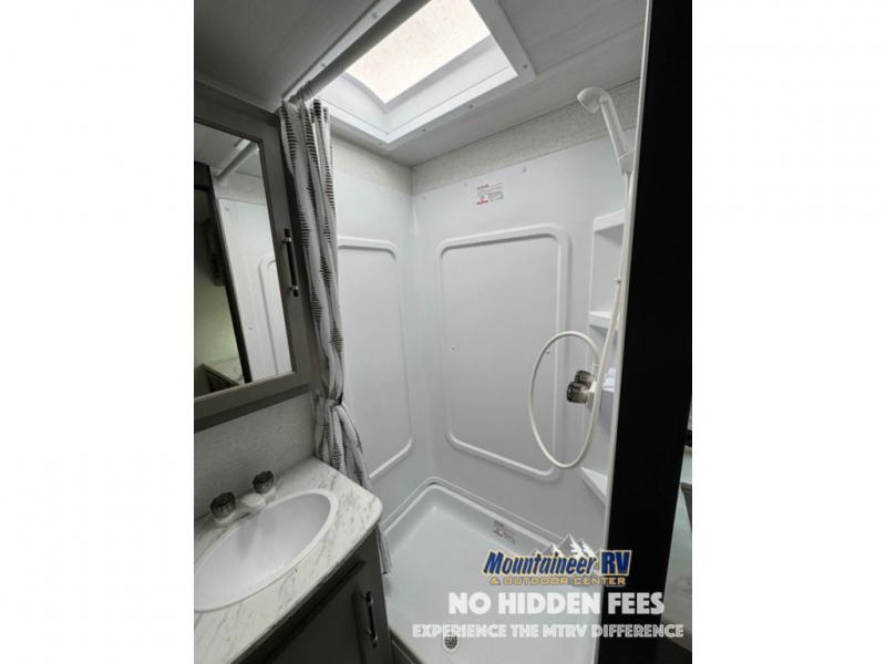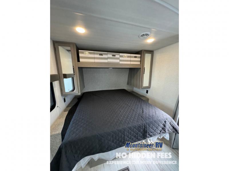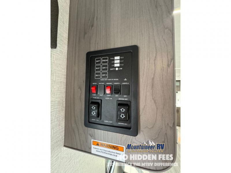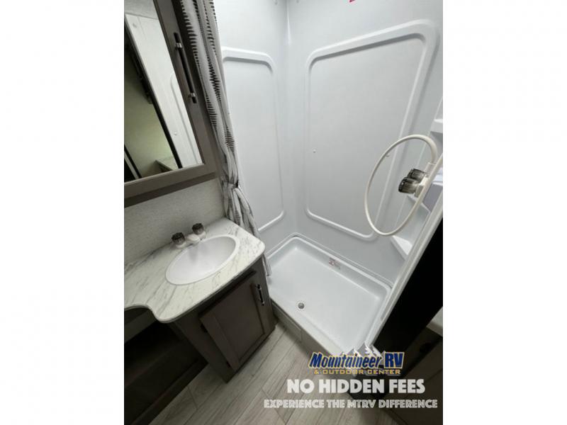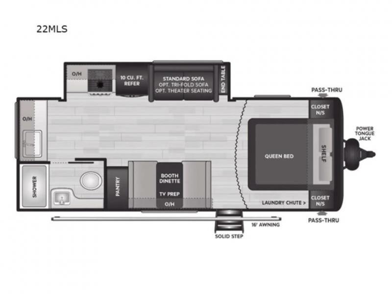 You'll love the added interior space this model has to offer thanks to the large slide out in the main living area. Here, you'll find the tri-fold sofa, the three burner gas range, and the 10 cu. ft. refrigerator. There is a large countertop in the back of this unit that houses the stainless steel sink, and the rear corner bath includes a spacious shower for convenience. You will love having your own space up front in the semi-private bedroom that includes a queen bed, dual closets and nightstands, plus a privacy curtain. There is even a laundry chute so you can throw dirty clothes straight to the pass-through storage!