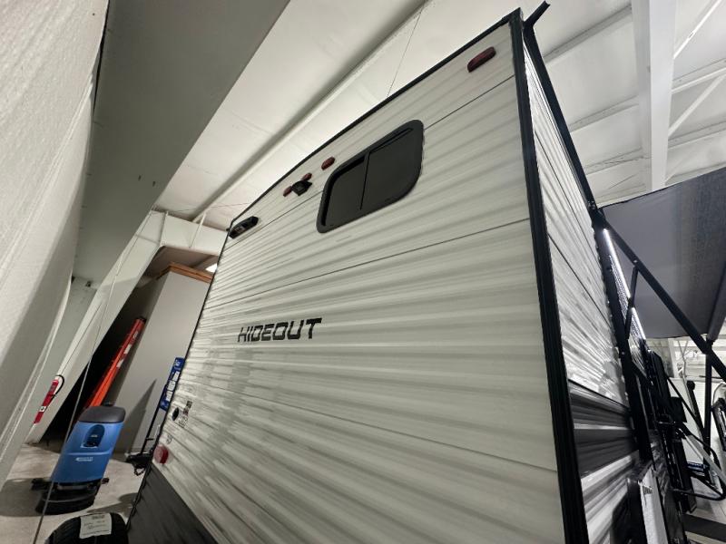 You can hide out for days at a time with this Hideout travel trailer! There is a slide out for extra living space, and here you'll find the booth dinette and standard sofa. If you're needing a different seating or sleeping space, just choose the optional theater seat or optional tri-fold sofa. The rear bathroom is large and accommodating with its large countertop, spacious shower, and linen closet. The front private bedroom has a queen-size bed with a laundry chute right next to it for keeping your dirty laundry hidden. You will also enjoy the 16' power awning outdoors where you can visit in the shade while enjoying a cold beverage from the outside refrigerator!