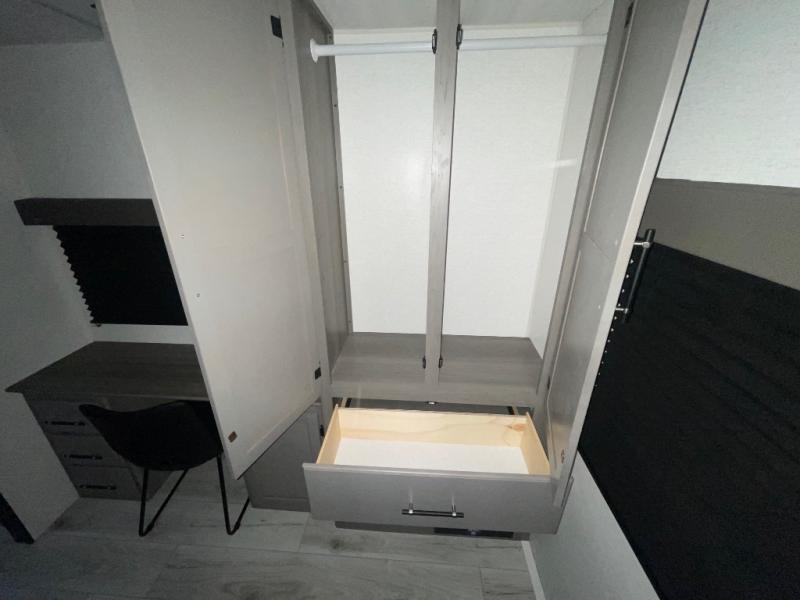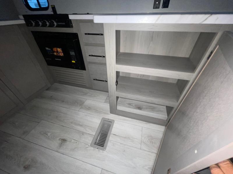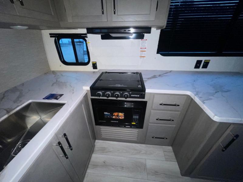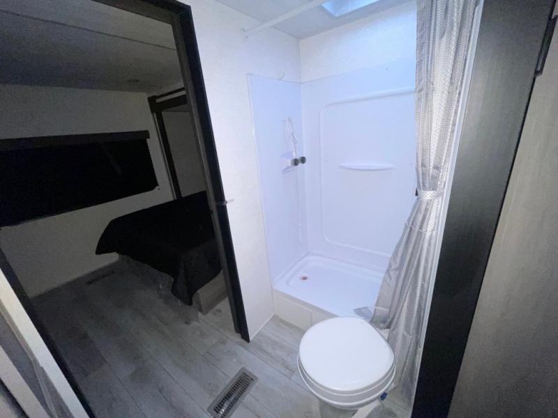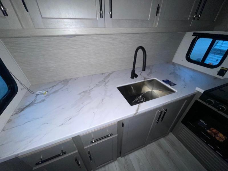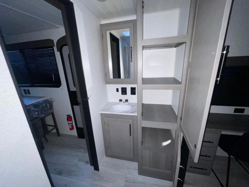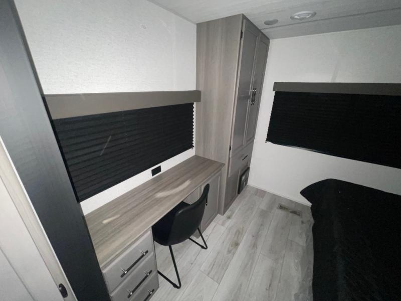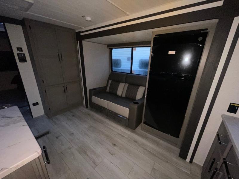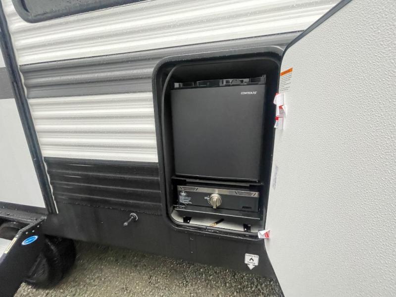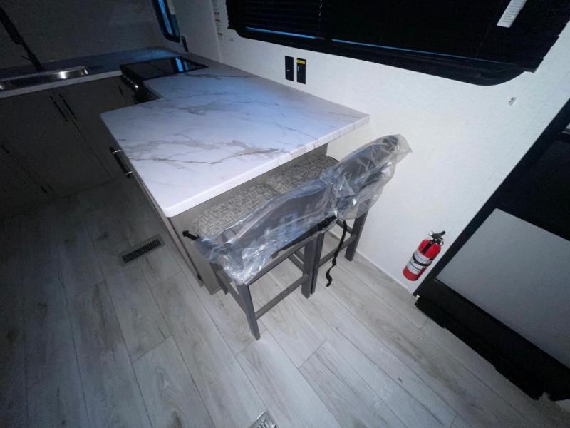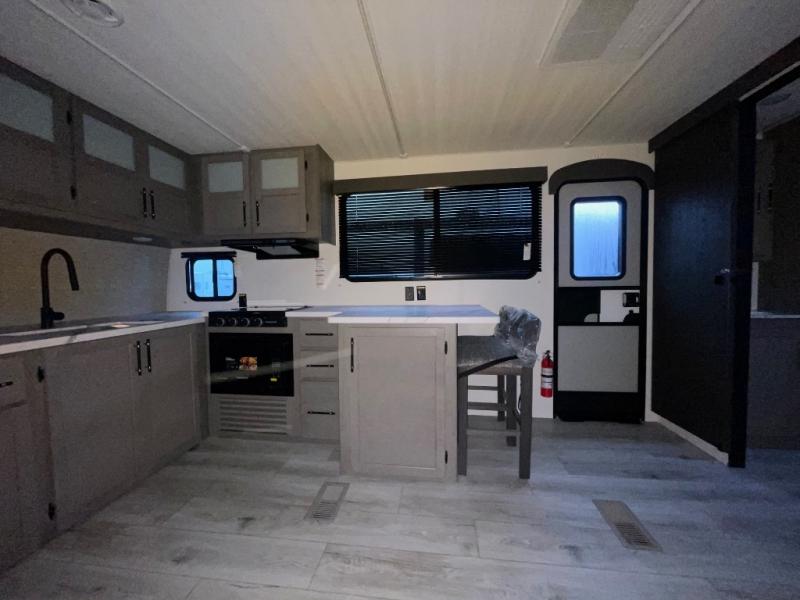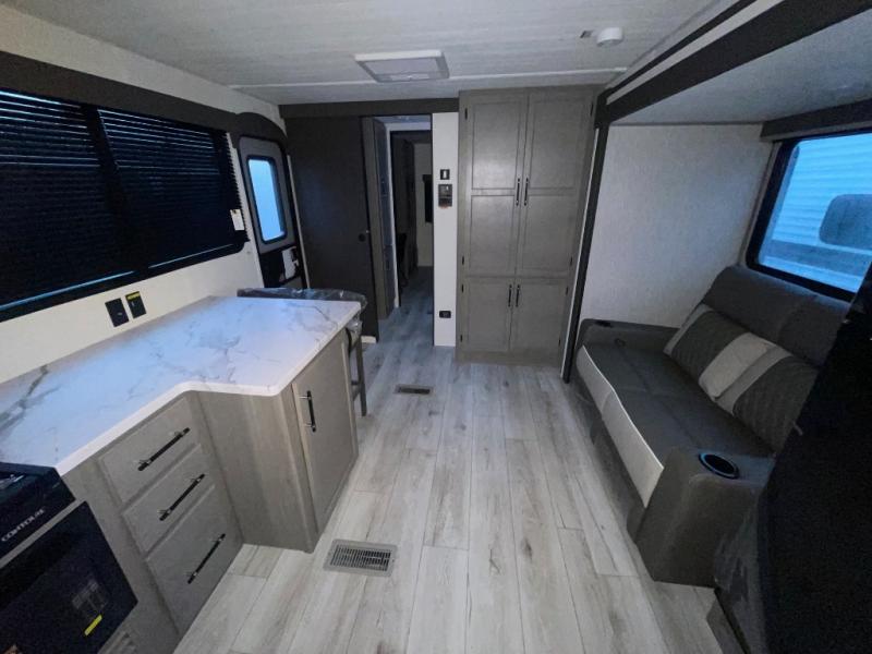 Will you choose to take this travel trailer to the lake or woods? Wherever you choose, you will be met with many comforts. The rear private bedroom includes a queen bed slide out for more floor space plus a desk with a chair if you need to get some work done. A walk-through bath will be easily accessible, and there is a spacious linen closet to keep towels clean. Head to main living room to relax on the tri-fold sofa or make dinner in the front kitchen. The counter with two chairs provides a place to eat breakfast each morning, and the lower pantry will be perfect for extra snacks. This model also includes an outdoor kitchen under the 18' power awning; how convenient!